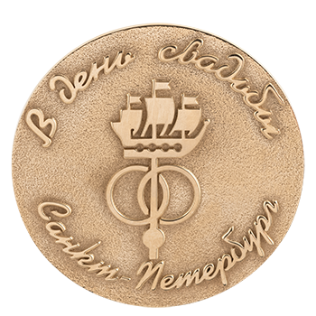 Медаль – оригинальный подарок не только для торжественной церемонии бракосочетания, но и для семейного юбилея. Два соединенных друг с другом кольца в центре – символ единства мужа и жены. Вы можете придумать пожелание, которое хотите увидеть на медали, а наши специалисты выгравируют его на поверхности.
