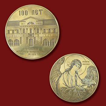 Образец для новых сувениров – оригинальная медаль, посвященная столетию Егорьевского историко-художественного музея. Она создана по технологии бронзового литья. Материалом для нее стала латунь. На одной стороне можно увидеть изображение музейного здания, на другой – ангела. По вашему желанию на поверхность будут нанесены уникальные рисунки и надписи.
