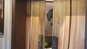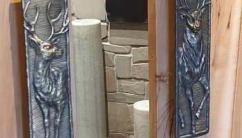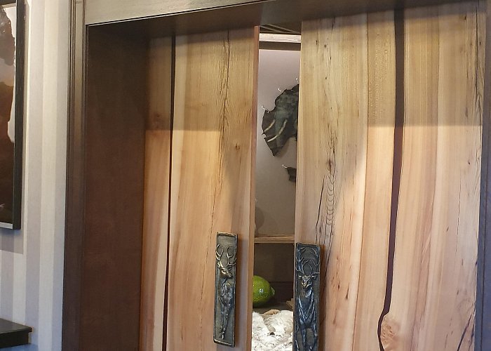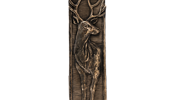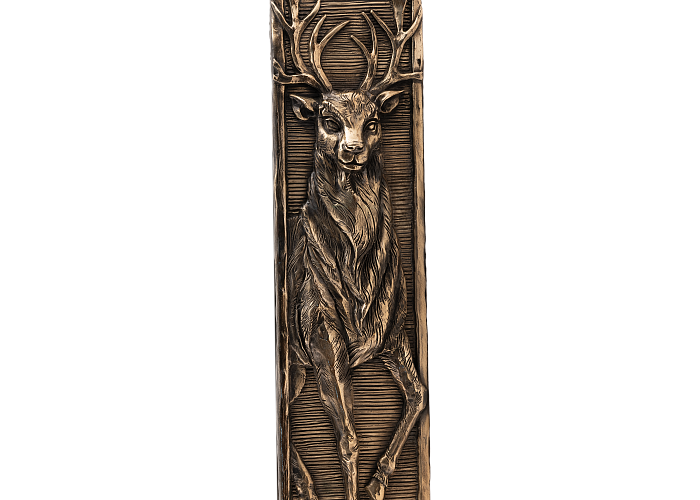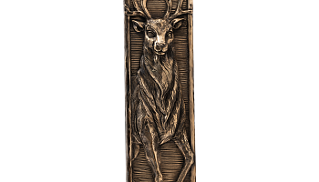 Для раздвижных дверей были выполнены стильные массивные ручки необычной прямоугольной формы. Их главная особенность – барельефы в виде оленей. Фурнитура идеально дополняет интерьер в стиле кантри, с деревянной отделкой, преобладанием природных материалов, фигурами животных. Ручки изготовлены по технологии бронзового литья из латуни. Они абсолютно симметричны, отличаются только изображениями оленей. Срок производства ручек – от 3-х недель.
