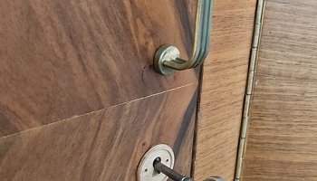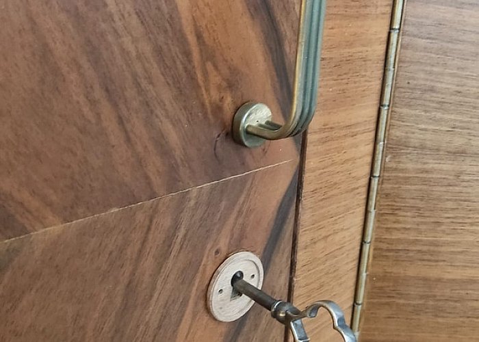 Для дверцы шкафа была выполнена ручка-скоба из латуни. Также нами был изготовлен оригинальный ключ. Вся фурнитура разрабатывалась по индивидуальному проекту, согласованному с заказчиком. Ключ и ручка представляют собой классический стиль с лаконичными деталями, без вычурных элементов. Изделия имеют удобный хват, что упрощает процесс открывания и закрывания шкафа. Цветовая гамма отлично дополняет исходный цвет предмета мебели, гармонируя с петлями дверцы. Напомним, что наша фурнитура производится путем художественного литья. Время создания – от 3 недель.