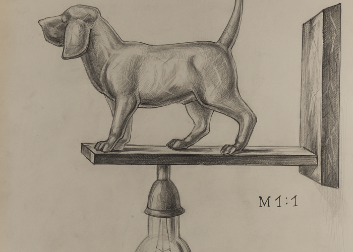 Светильник был изготовлен в мастерской «Калежа». Образцом для него стал светильник в виде кошки, привезенный из Франции. Зарубежные специалисты отказались делать такой же сувенир, но в форме собаки. Наши мастера взялись за работу, согласовав чертеж с клиентом, потому что у нас возможно все, если есть интересная идея.
