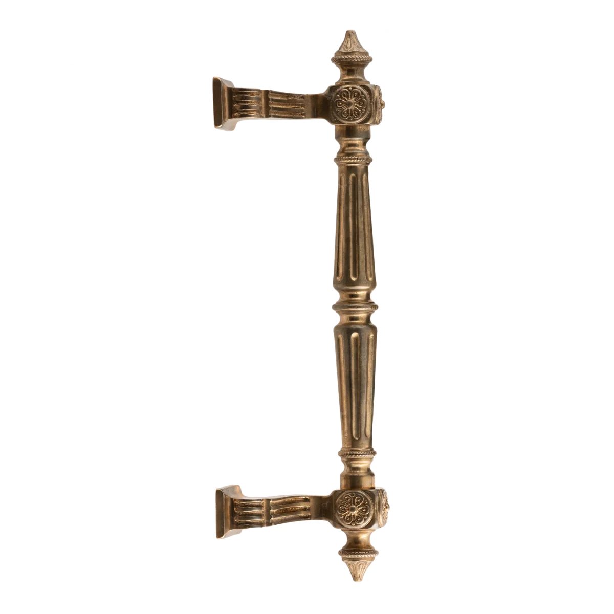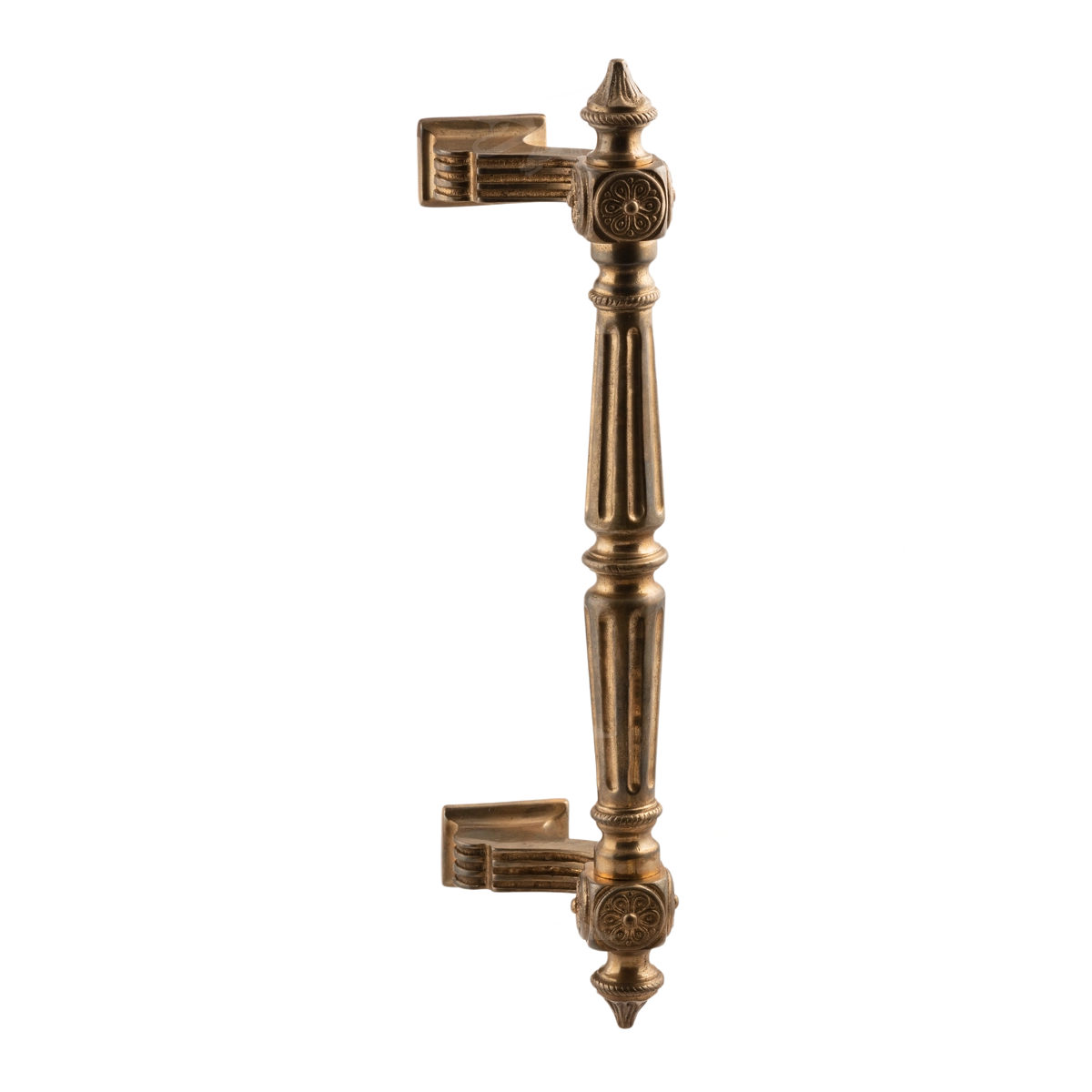 Мастерская «Калежа» изготавливает оригинальную фурнитуру под бронзу по технологии художественного литья. По индивидуальному заказу готовая дверная ручка скоба из латуни станет образцом при оформлении новых изделий. Основание имеет форму античной колонны. В качестве декоративных элементов мы применяли пинакли и стилизованные изображения цветов. Срок выполнения подобных работ – от трех недель. Также возможно использование предоставленных вами эскизов.