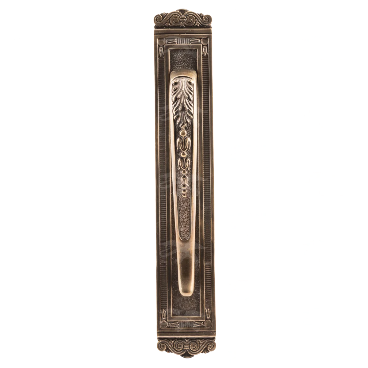 Обратившись в мастерскую «Калежа», вы можете купить дверную ручку скобу в Москве. Эта оригинальная работа выполнена по технологии художественного литья. Фурнитура имеет классическую прямоугольную форму и снабжена неброским природным орнаментом. Ее можно сделать образцом для новых межкомнатных ручек. Мы изготавливаем похожую фурнитуру в течение трех недель. Специалисты создают ее и по эскизам заказчиков.