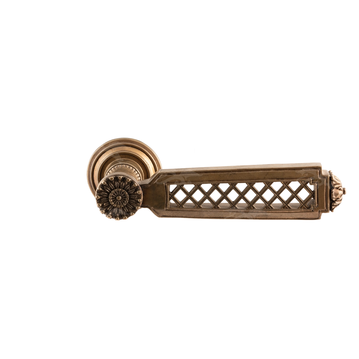 Дверная ручка выполнена в современном исполнении и представлена в необычном оформлении: сама ручка декорирована перекрестными линиями. Розетка украшена цветочном декором. Форма изделия идеально повторяет изгибы ладони, что гарантирует удобство использования.