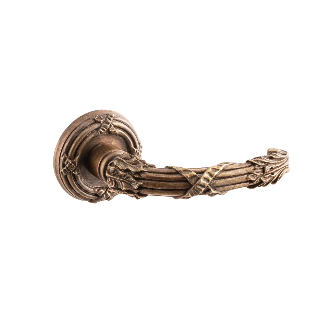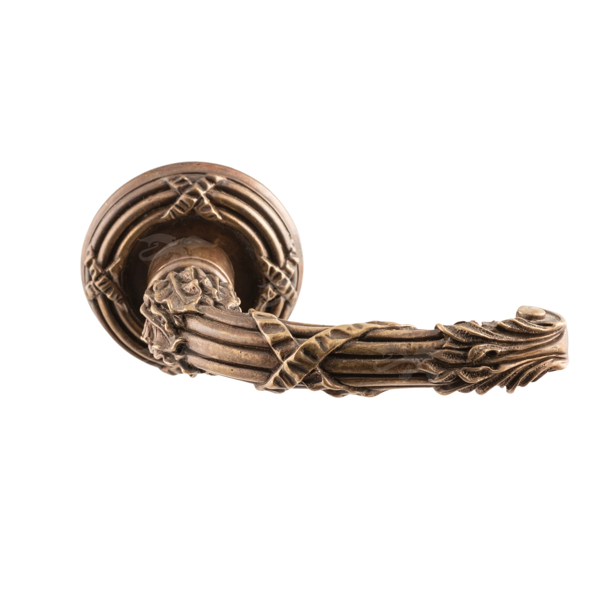 Скульптурное стилизованное изображение листьев растения (акант) и плетеный орнамент, имитирующий узор из кожаных ремешков, декорируют фурнитуру. Нажимная ручка подойдет как к классическому, так и к современному интерьеру.