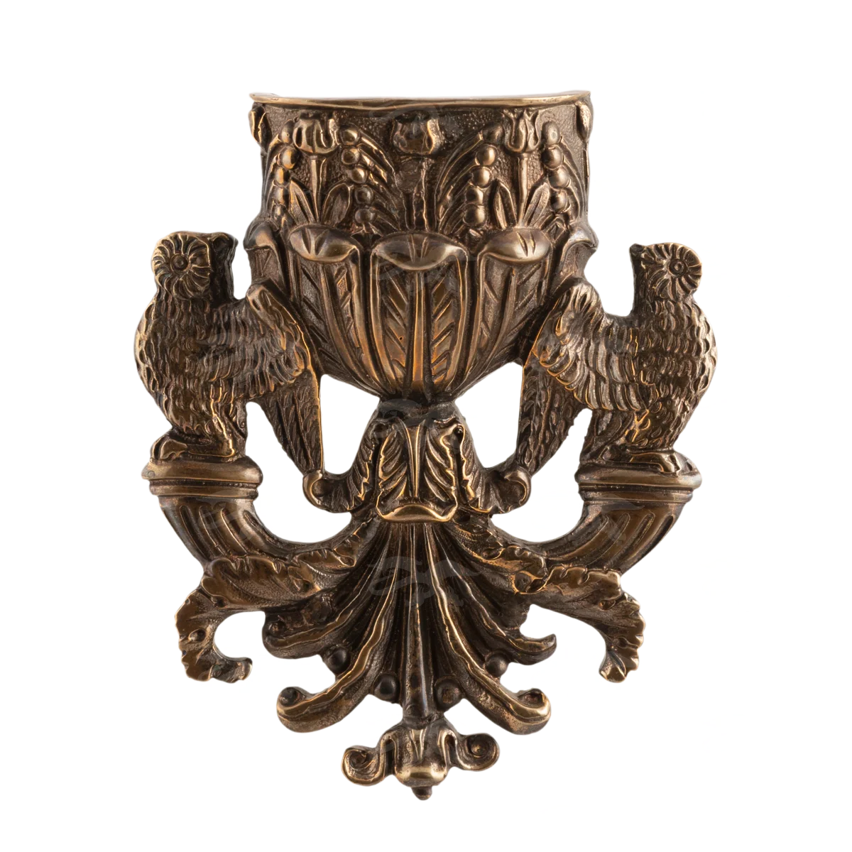 Мастерская «Калежа» выполнила оригинальную декоративную накладку Ф3630 в стиле ампир. Для этого мы использовали технологии литья из латуни. Можно изменить ее дизайн, добавить новые детали, а вместо чернения выбрать бронзирование, золочение или серебрение. Срок выполнения такого заказа – три недели. Наши мастера также работают по дизайн-проектам клиентов.
