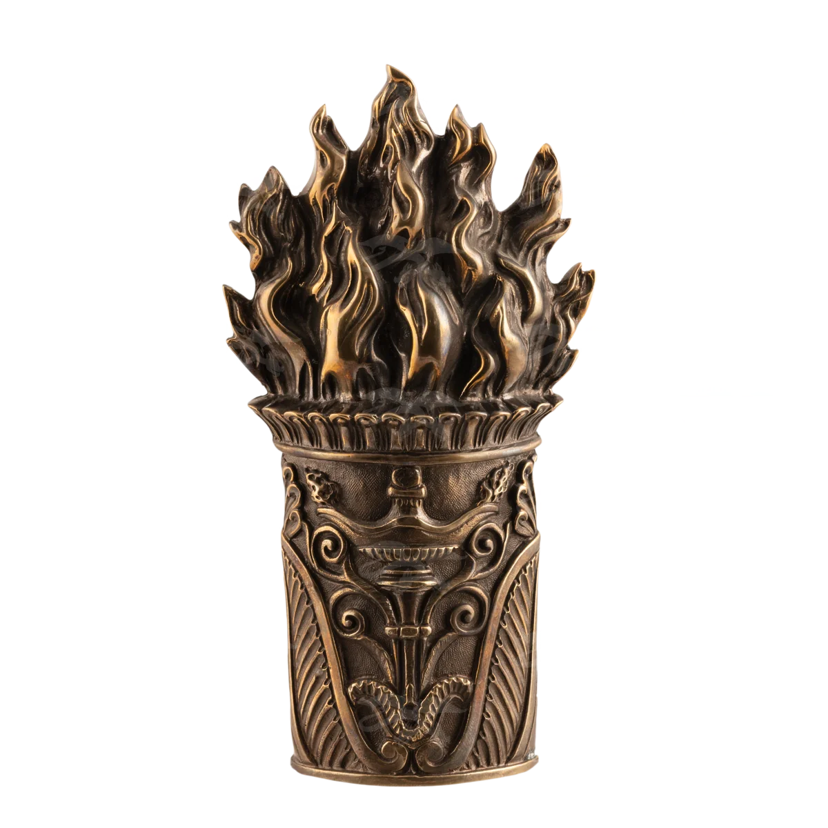 Оригинальная декоративная накладка Факел изготовлена по технологии бронзового литья с применением чернения. Для получения сложного рельефного рисунка, имитирующего огонь, специалисты использовали латунь. Художественно-производственная мастерская «Калежа» выполняет уникальную мебельную фурнитуру за три недели. Все работы специалистов отличаются креативными идеями. Также мы используем готовые эскизы заказчиков.