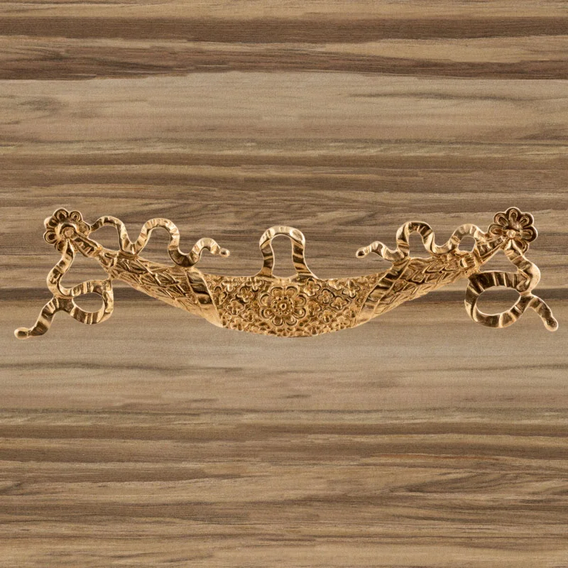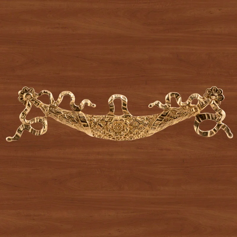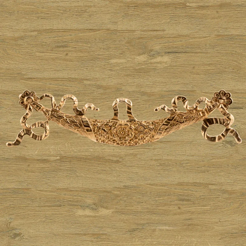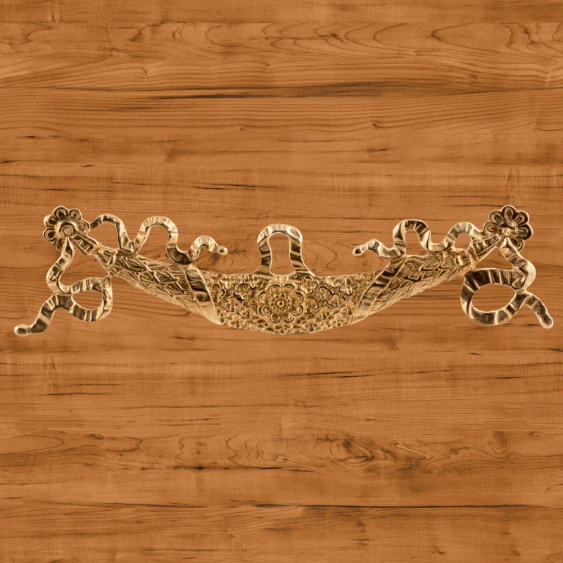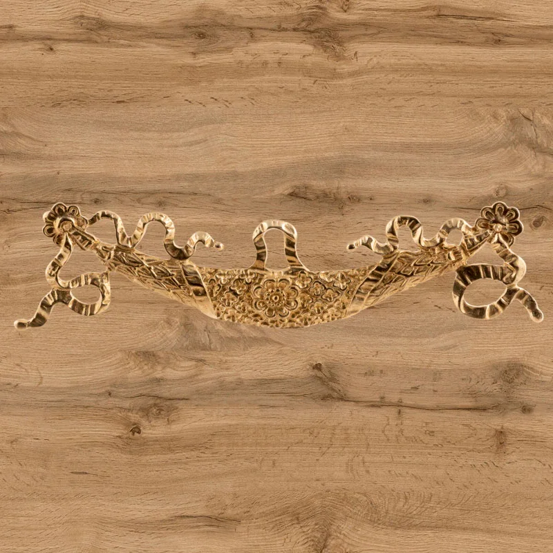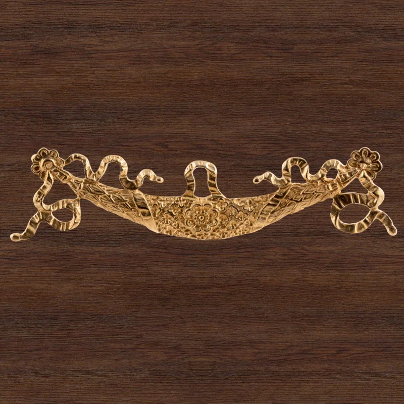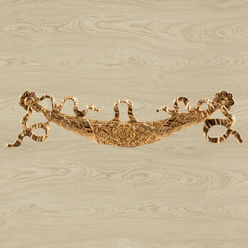 Декоративная накладка Ф5775 заставит любой предмет мебели казаться более легким, изящным, воздушным. Плотный металл в руках специалистов мастерской «Калежа» превратился в развевающиеся на ветру тонкие ленты из ткани. Их дополняют миниатюрные цветы, каждый лепесток которых тщательно проработан. Латунные украшения авторской работы сделают любой интерьер роскошным и уникальным.
