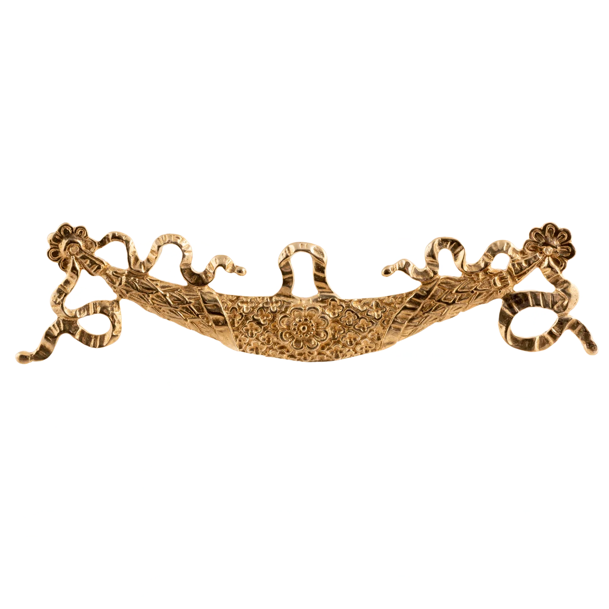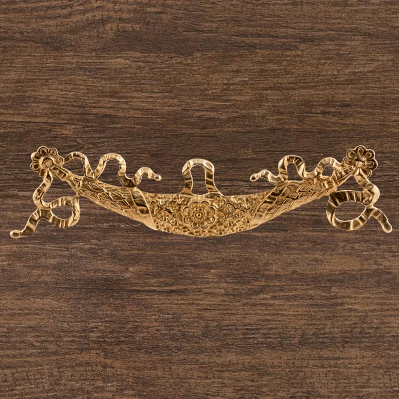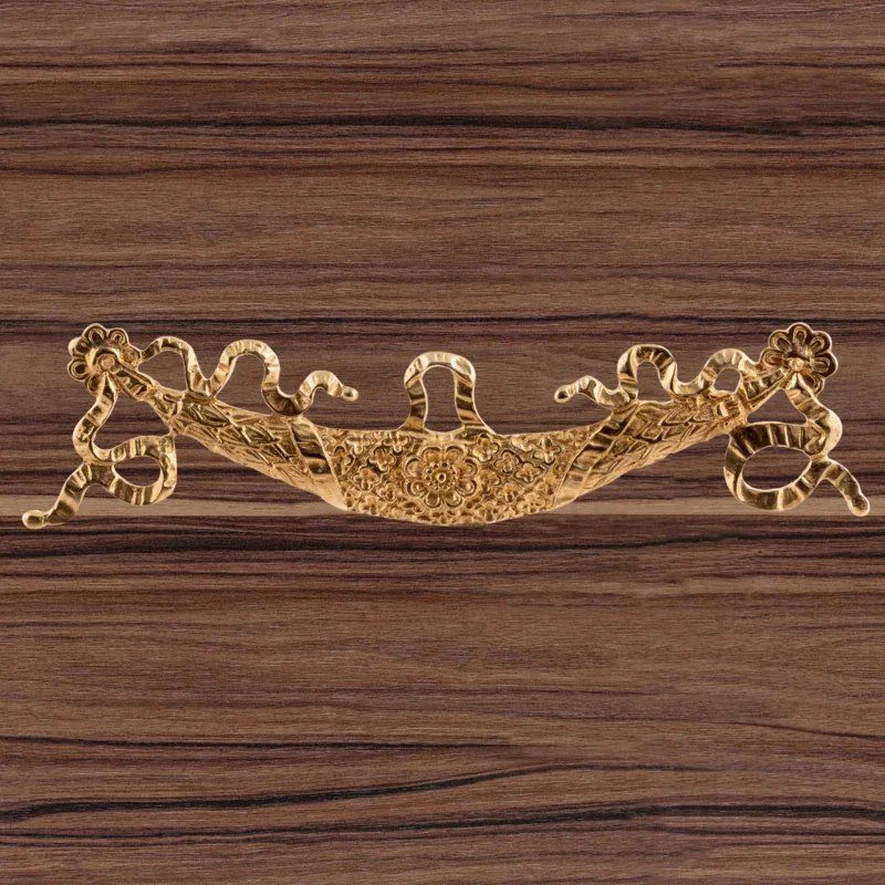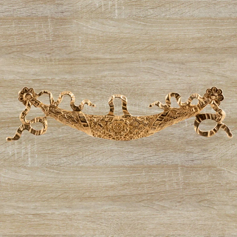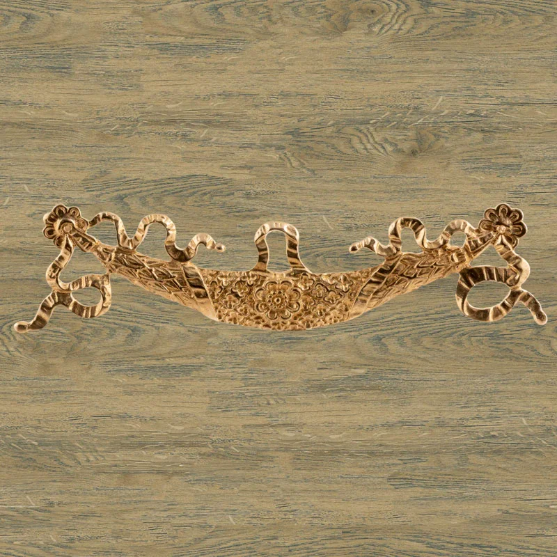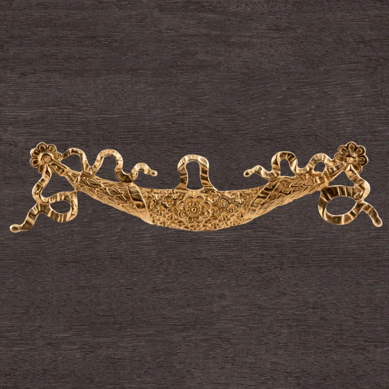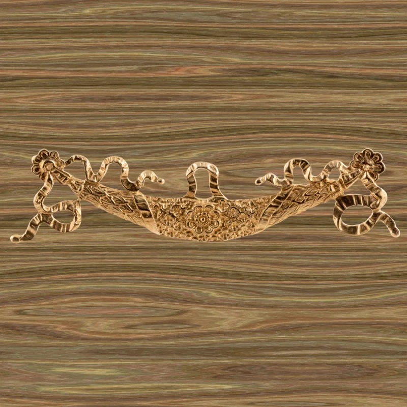 Декоративная накладка Ф5775 заставит любой предмет мебели казаться более легким, изящным, воздушным. Плотный металл в руках специалистов мастерской «Калежа» превратился в развевающиеся на ветру тонкие ленты из ткани. Их дополняют миниатюрные цветы, каждый лепесток которых тщательно проработан. Латунные украшения авторской работы сделают любой интерьер роскошным и уникальным.