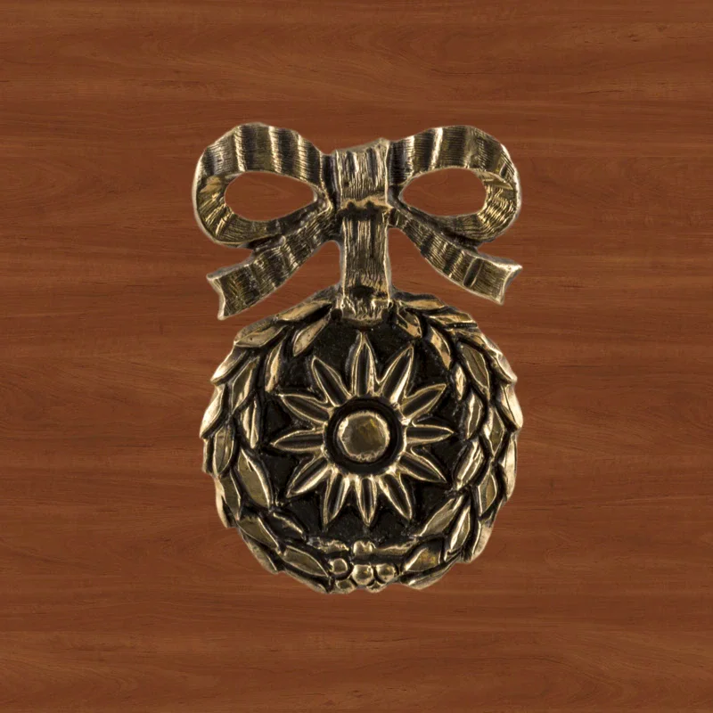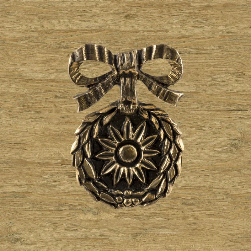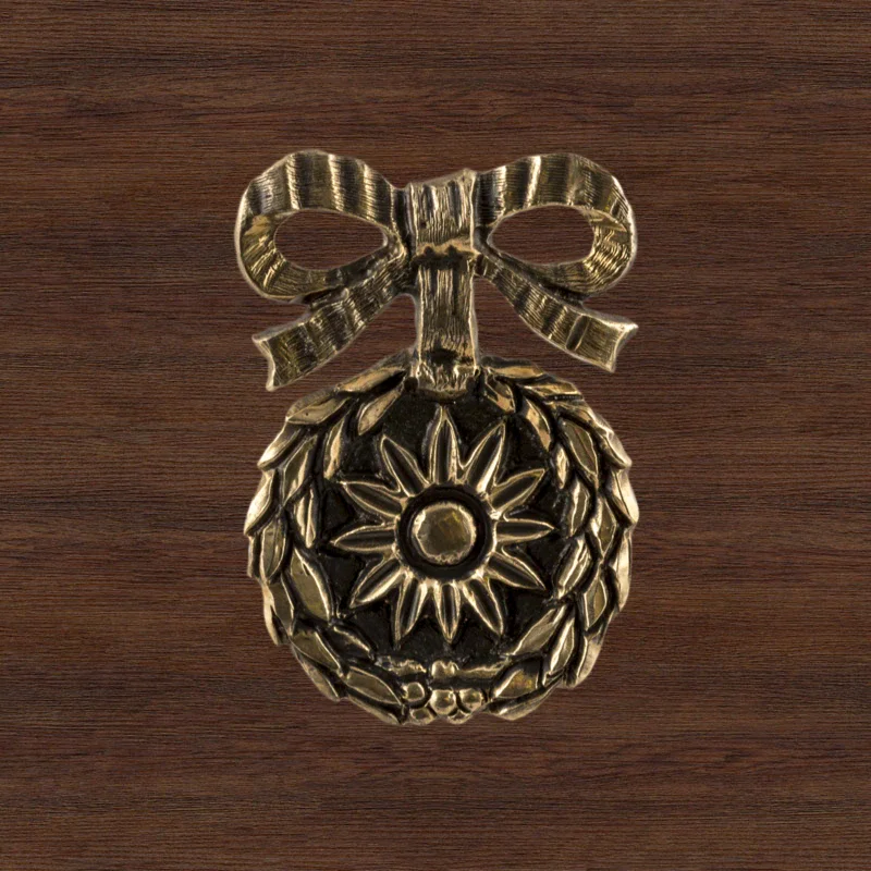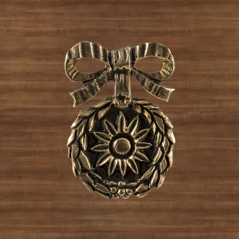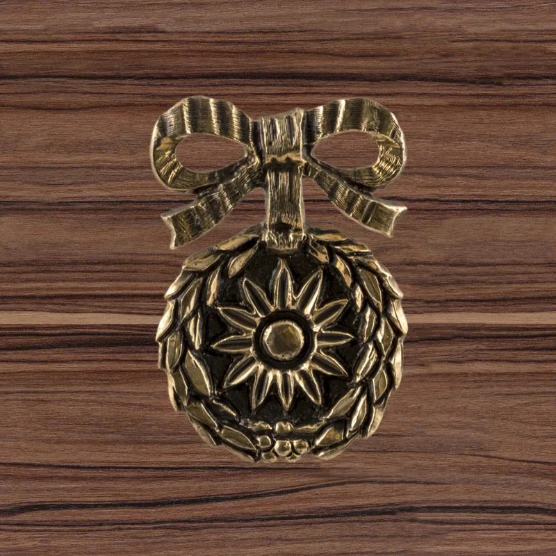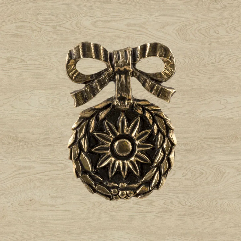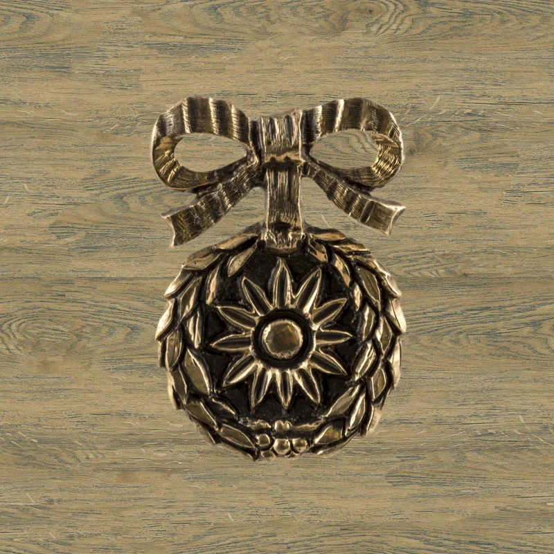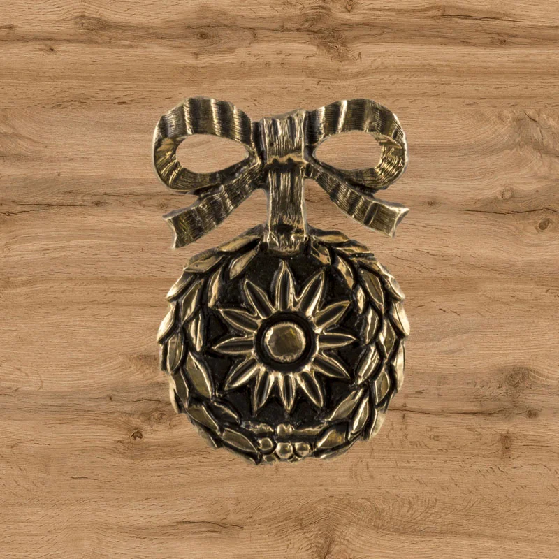 Мастерская «Калежа» создает декоративные элементы из латуни в стиле барокко. В качестве основной технологии мы применяем бронзовое литье, которое позволяет получать изделия необходимой формы. Бант с медальоном и цветком имеет обрамление в виде венка. Для барочной фурнитуры характерно сознательное нарушение пропорций. Благодаря этому наша продукция выглядит массивно и торжественно.