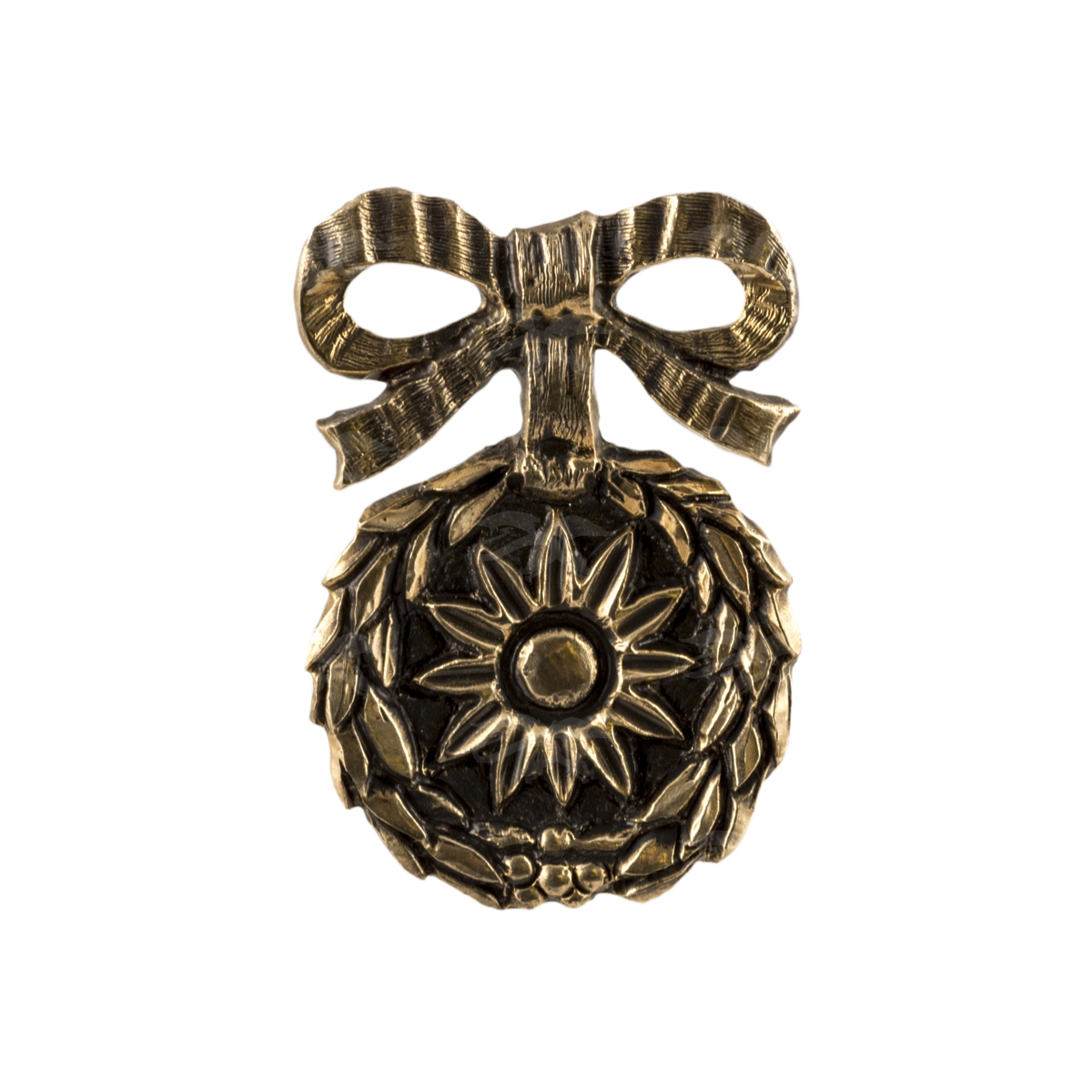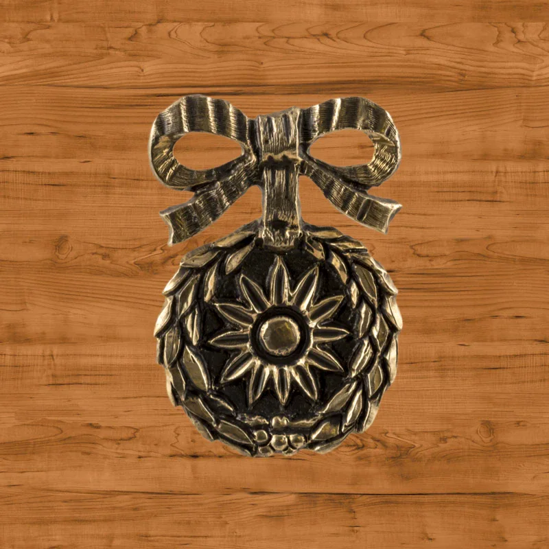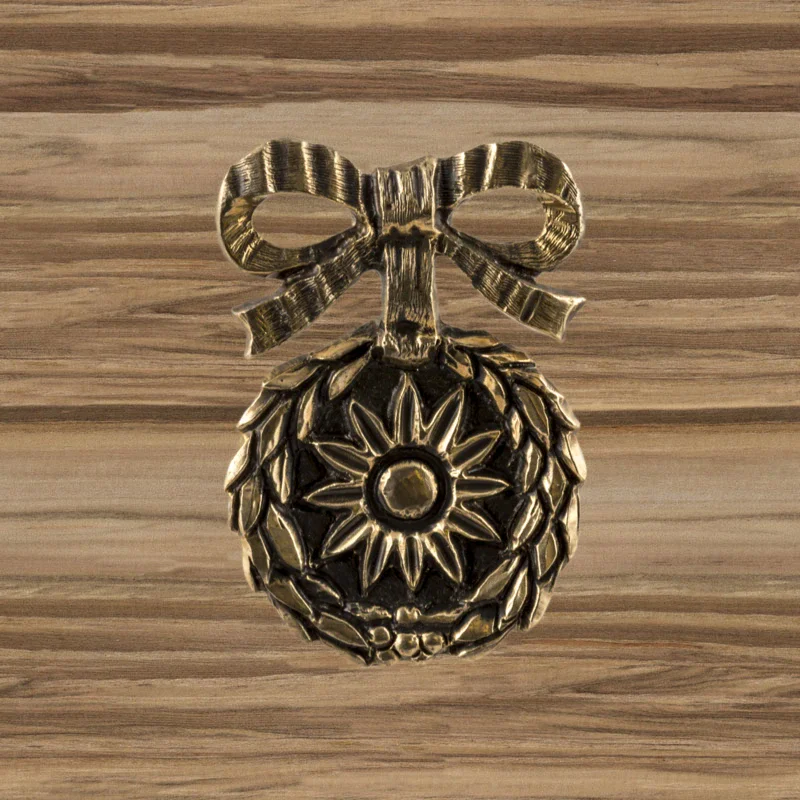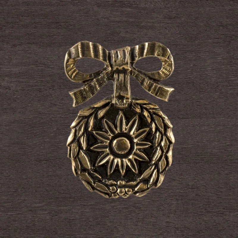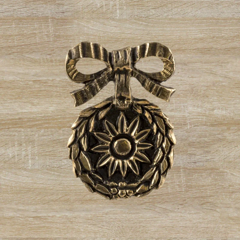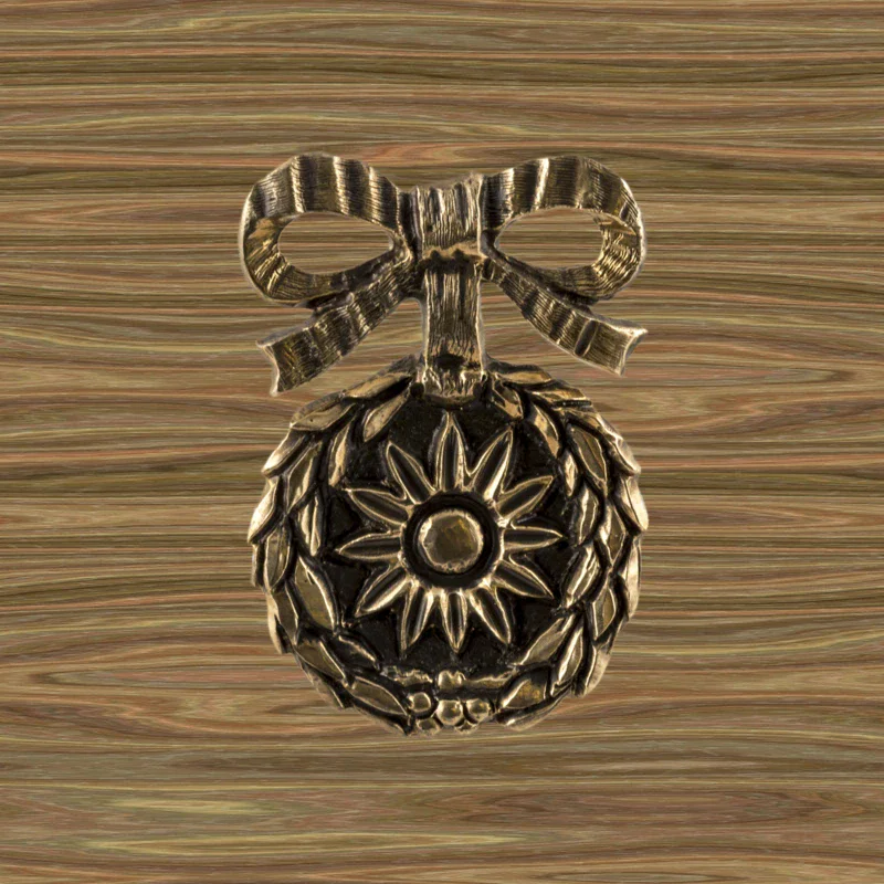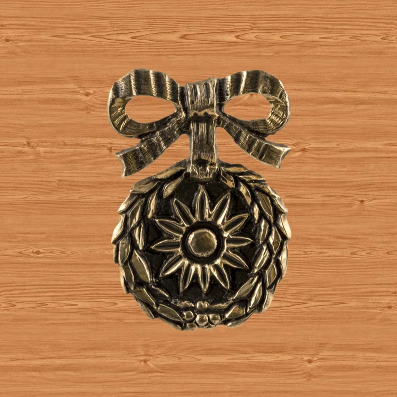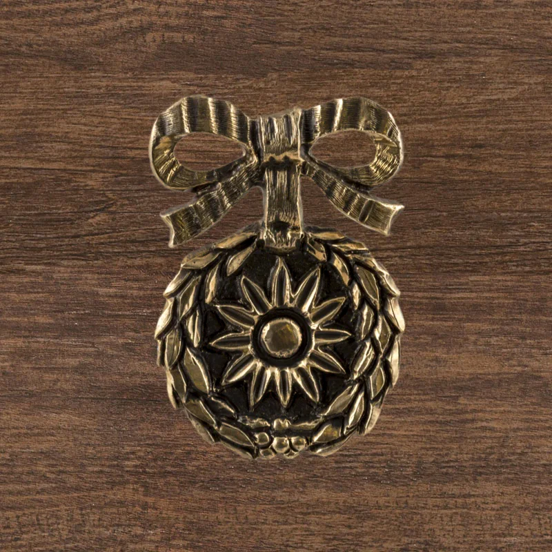 Мастерская «Калежа» создает декоративные элементы из латуни в стиле барокко. В качестве основной технологии мы применяем бронзовое литье, которое позволяет получать изделия необходимой формы. Бант с медальоном и цветком имеет обрамление в виде венка. Для барочной фурнитуры характерно сознательное нарушение пропорций. Благодаря этому наша продукция выглядит массивно и торжественно.
