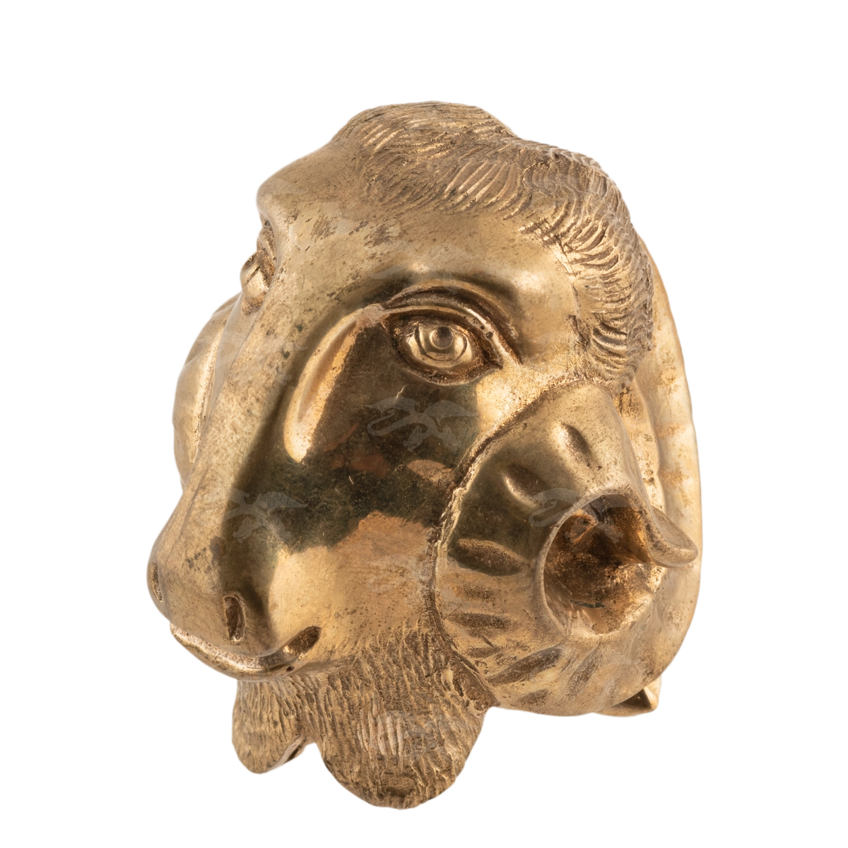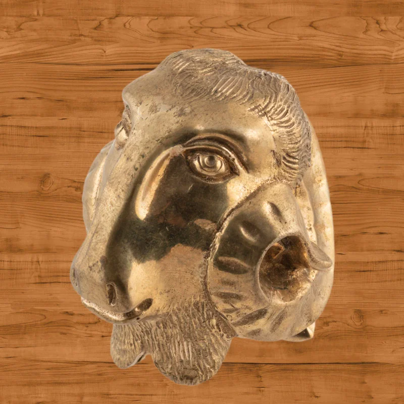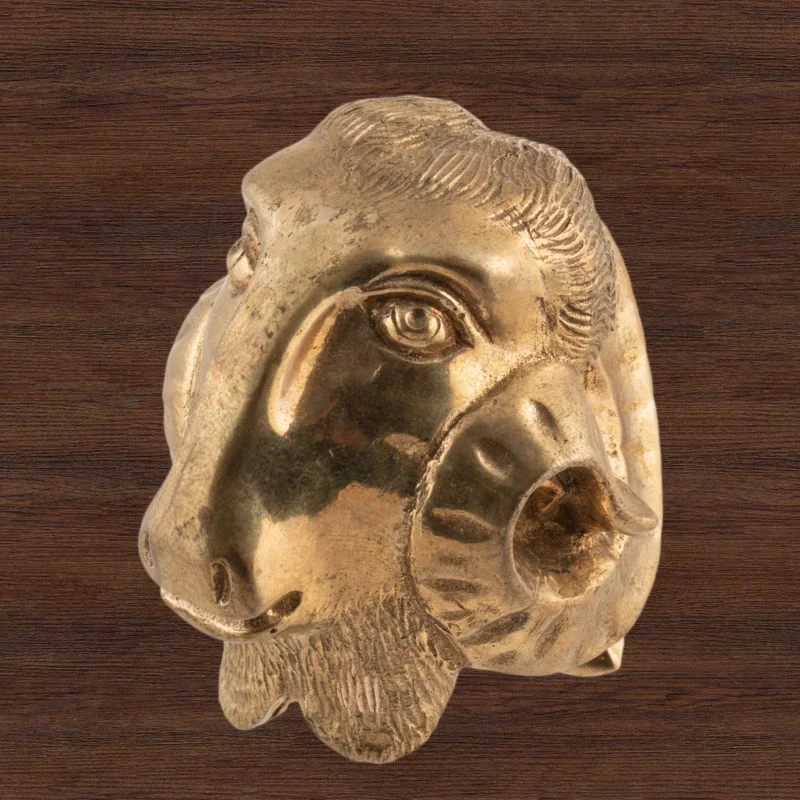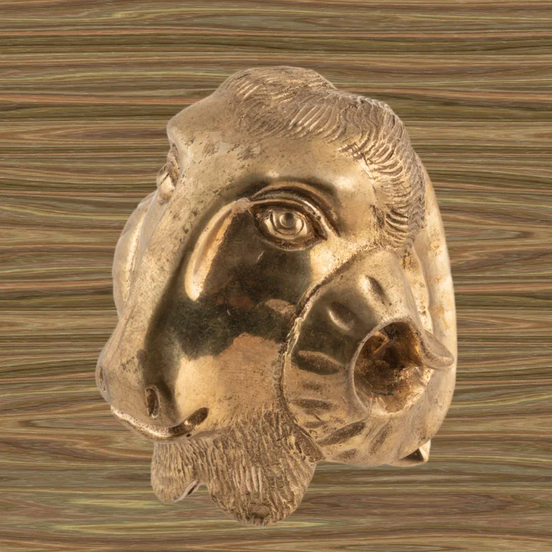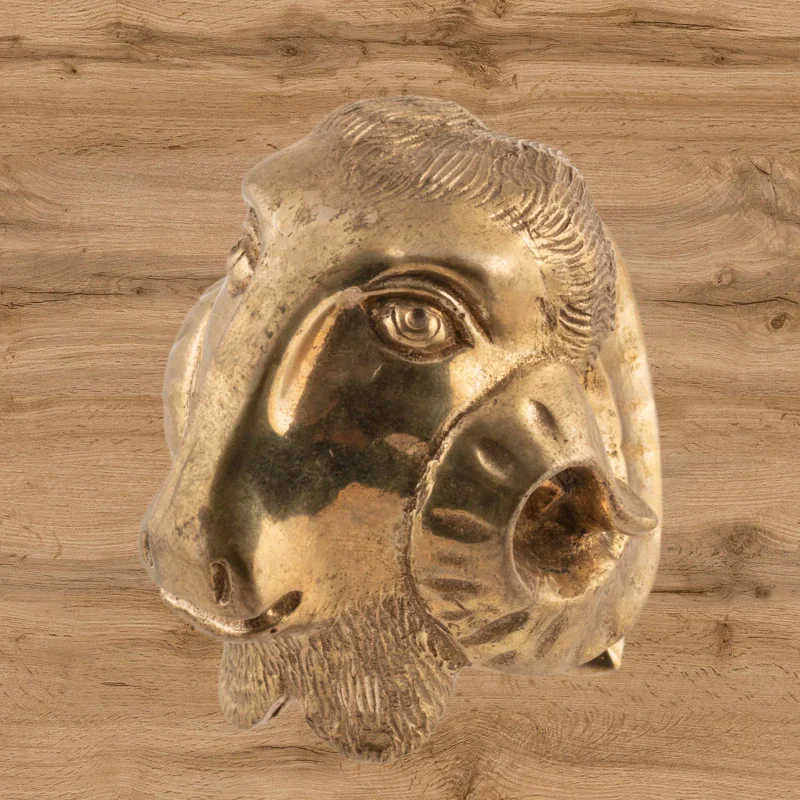 Мастерская «Калежа» создает мебельную фурнитуру в стиле барокко для оформления интерьеров. Этот декоративный элемент изготовлен из латуни по технологии бронзового литья. Маска барана располагается анфас. В используемом изображении нет уравновешенных пропорций, но тщательно проработаны мелкие детали – глаза, рога и шерсть. При этом соблюдается определенная симметрия.