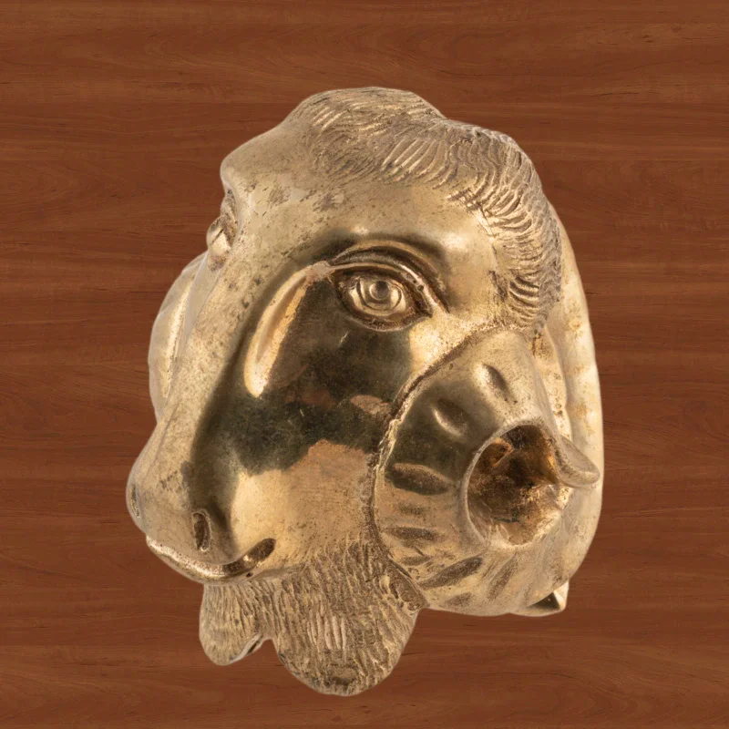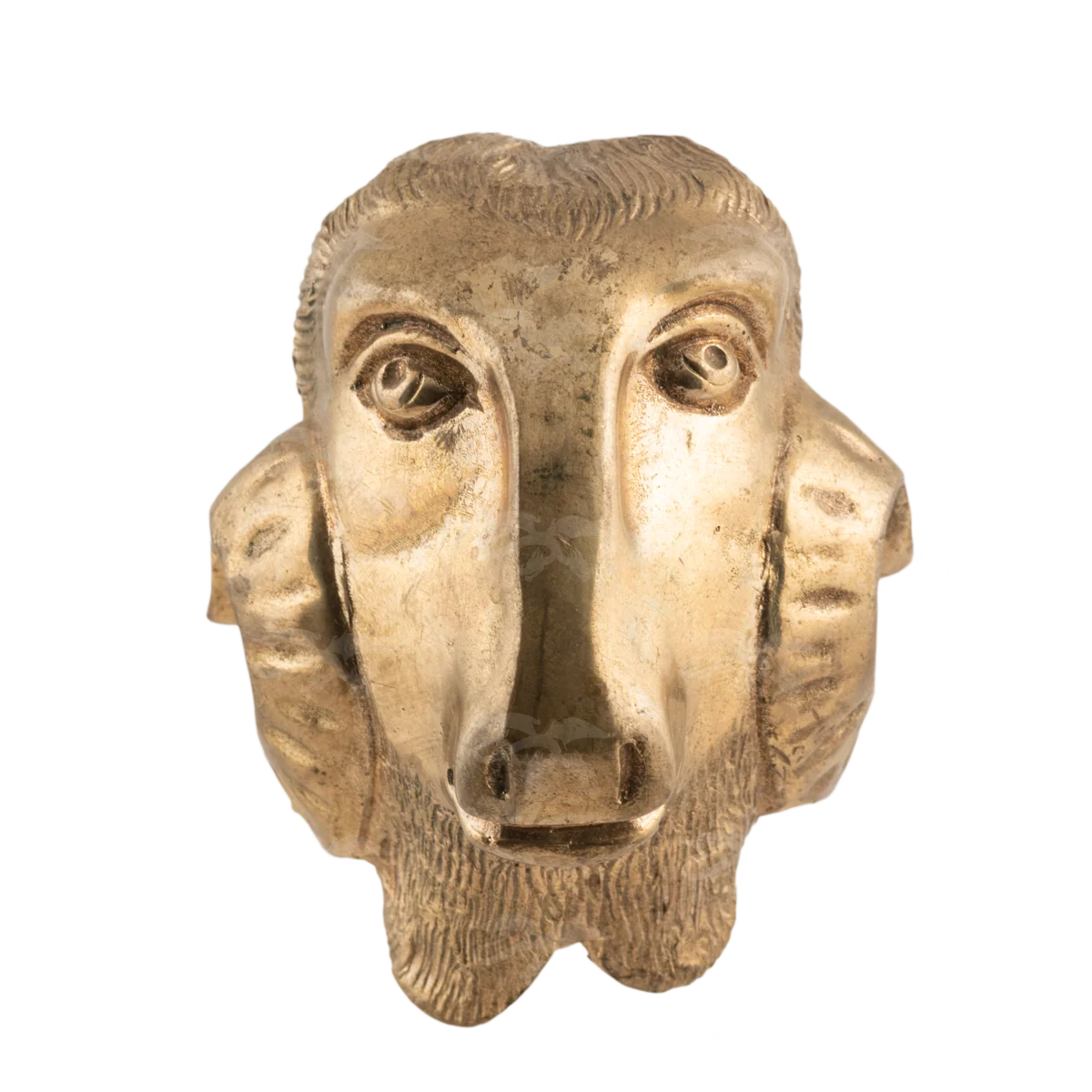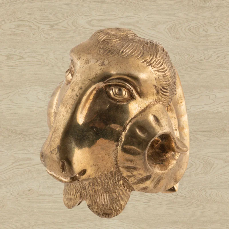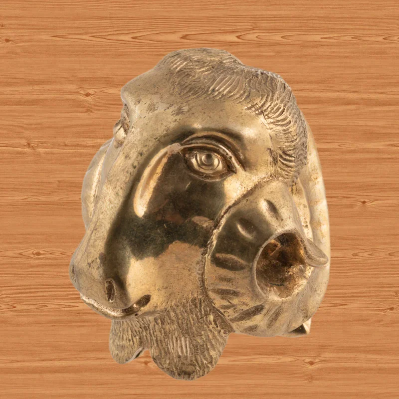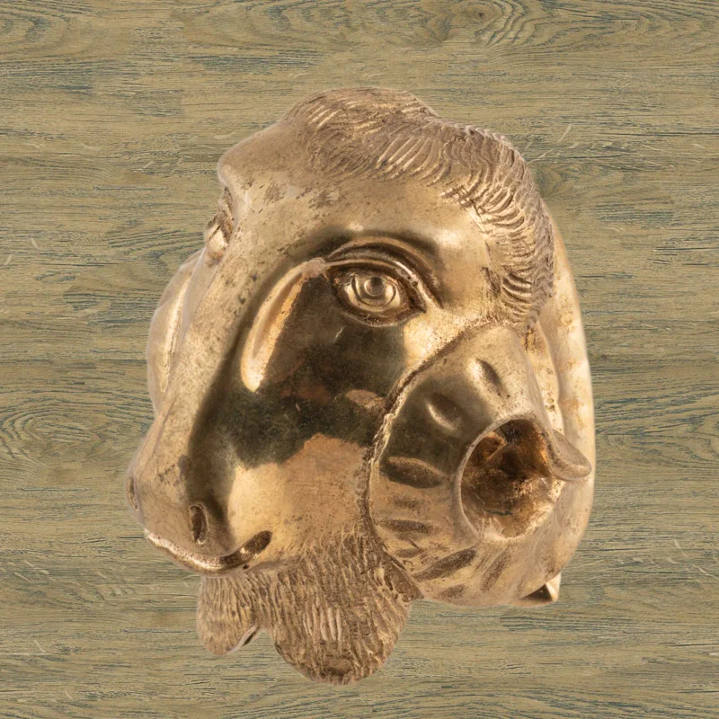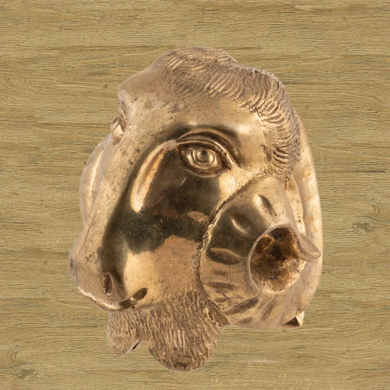 Мастерская «Калежа» создает мебельную фурнитуру в стиле барокко для оформления интерьеров. Этот декоративный элемент изготовлен из латуни по технологии бронзового литья. Маска барана располагается анфас. В используемом изображении нет уравновешенных пропорций, но тщательно проработаны мелкие детали – глаза, рога и шерсть. При этом соблюдается определенная симметрия.