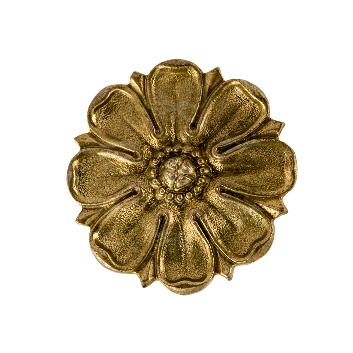 Мастерская «Калежа» изготавливает классическую мебельную фурнитуру, обладающую нестандартным дизайном. Наши декоративные элементы отличает симметрия, четкость и умеренность каждой детали. Вместо сложных решений мы используем простые формы и растительные узоры. Эта латунная розетка из шести лепестков выполнена по технологии бронзового литья. Подобная фурнитура может быть создана в течение трех недель.