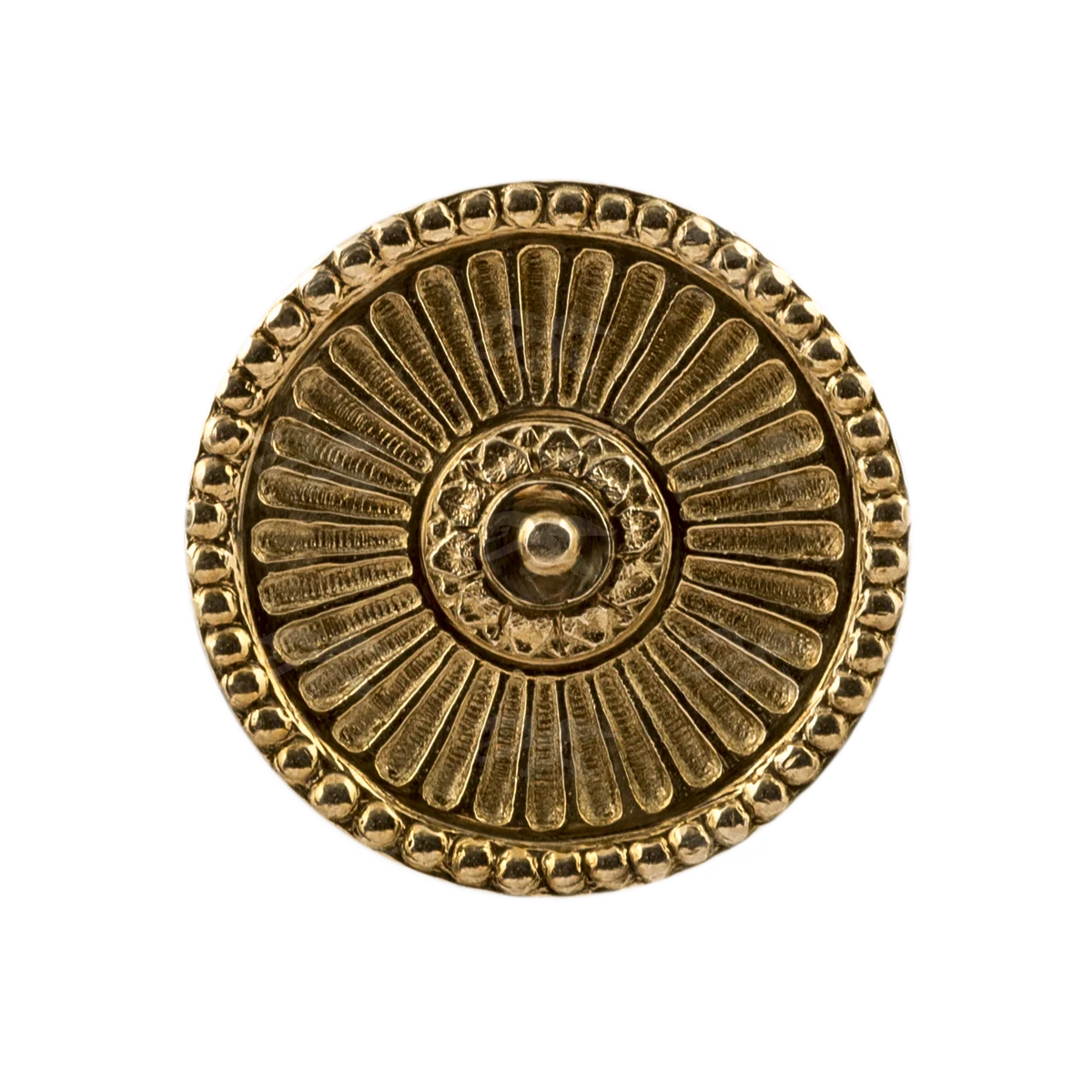 Мастерская «Калежа» предлагает круглые декоративные накладки, изготовленные из латуни с помощью литья. Благодаря уникальному оформлению они могут стать источником идей для новых изделий. Фурнитуру в подобном стиле изготавливают в течение трех недель. Работая над дизайном, наши специалисты не забывают о практической стороне: накладные элементы надежно защищают дверное полотно от разрушения во время активного использования.