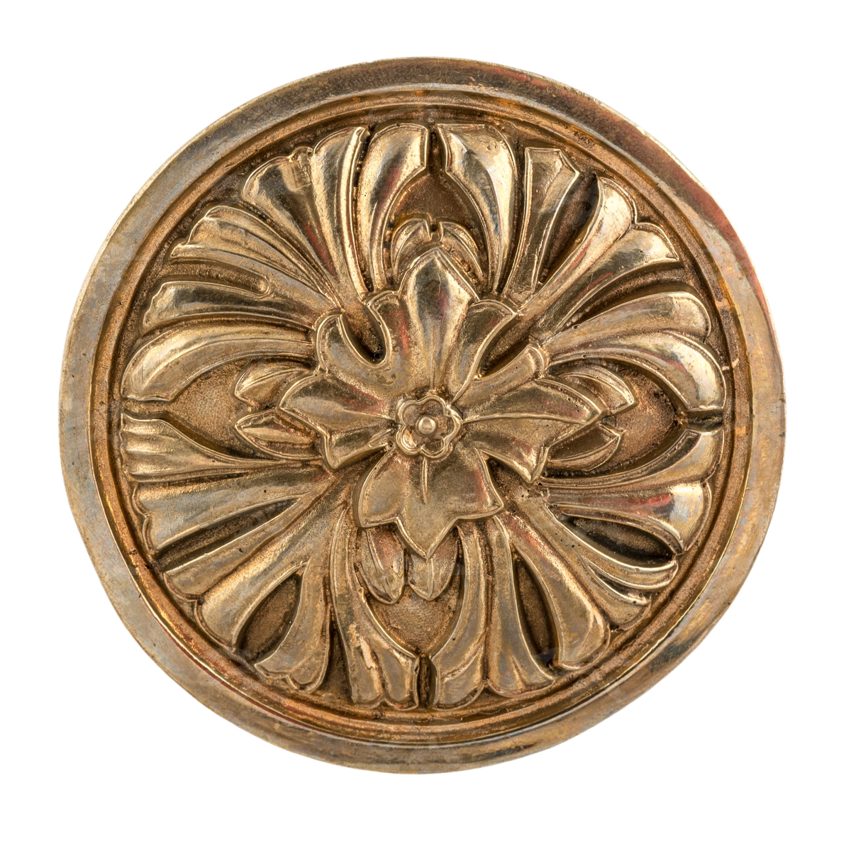 Мастерская «Калежа» предлагает круглые декоративные накладки, изготовленные из латуни с помощью литья. Благодаря уникальному оформлению они могут стать источником идей для новых изделий. Фурнитуру в подобном стиле изготавливают в течение трех недель. Работая над дизайном, наши специалисты не забывают о практической стороне: накладные элементы надежно защищают дверное полотно от разрушения во время активного использования.