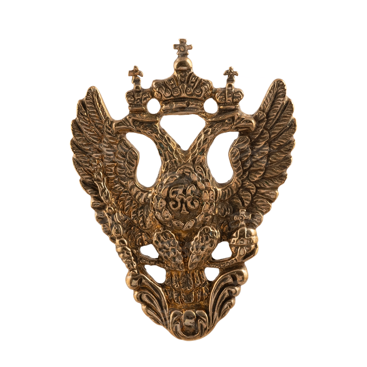 Мастерской «Калежа» создана оригинальная накладка Ф2722 из латуни, основная технология изготовления – художественное литье. Работа в стиле ампир выполнена в форме российского императорского герба – двуглавого орла. Для получения рельефной текстуры мы также использовали гравировку. Возможно создание любой геральдической символики по готовым эскизам в течение трех недель.