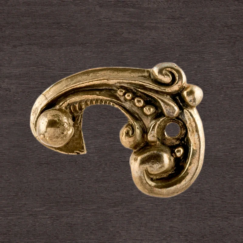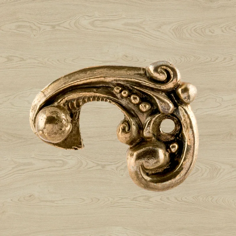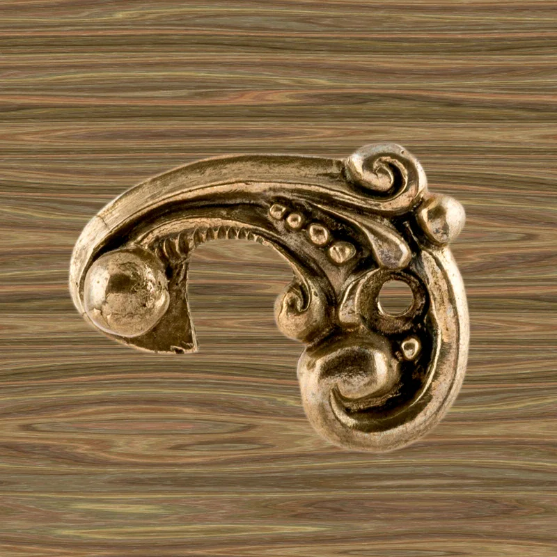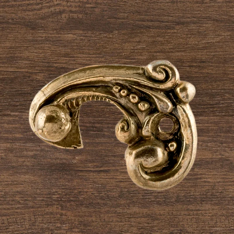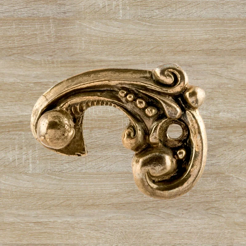 Художественно-производственная мастерская «Калежа» выполняет декоративные накладки из латуни. Они делают запорный механизм дверей эстетически привлекательным, маскируют отверстия под ключ. Представленная работа изготовлена с применением литья, она надежно защищает мебель от разрушения при активном использовании. Срок выполнения заказов – от трех недель. Наша компания также создает фурнитуру по эскизам клиентов.