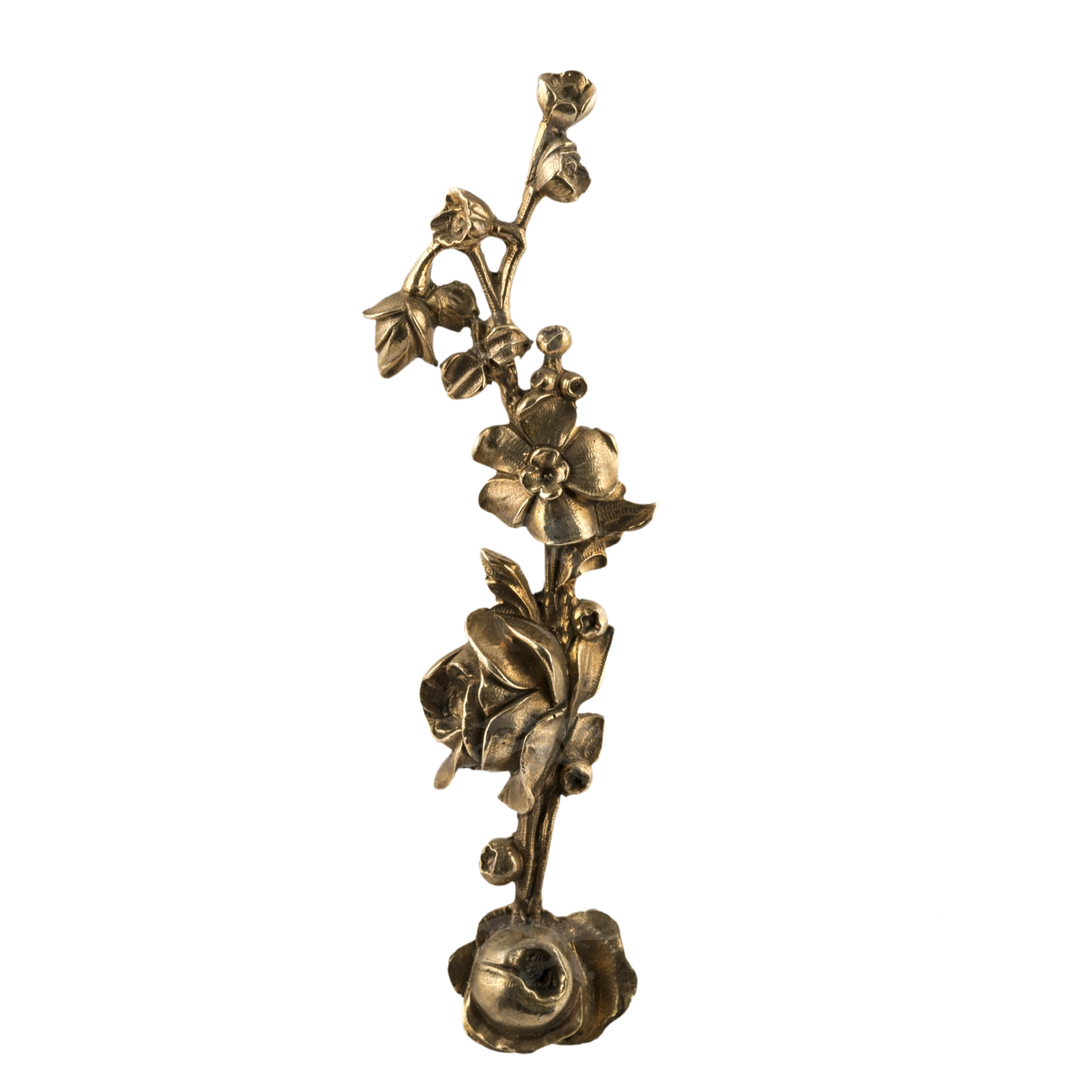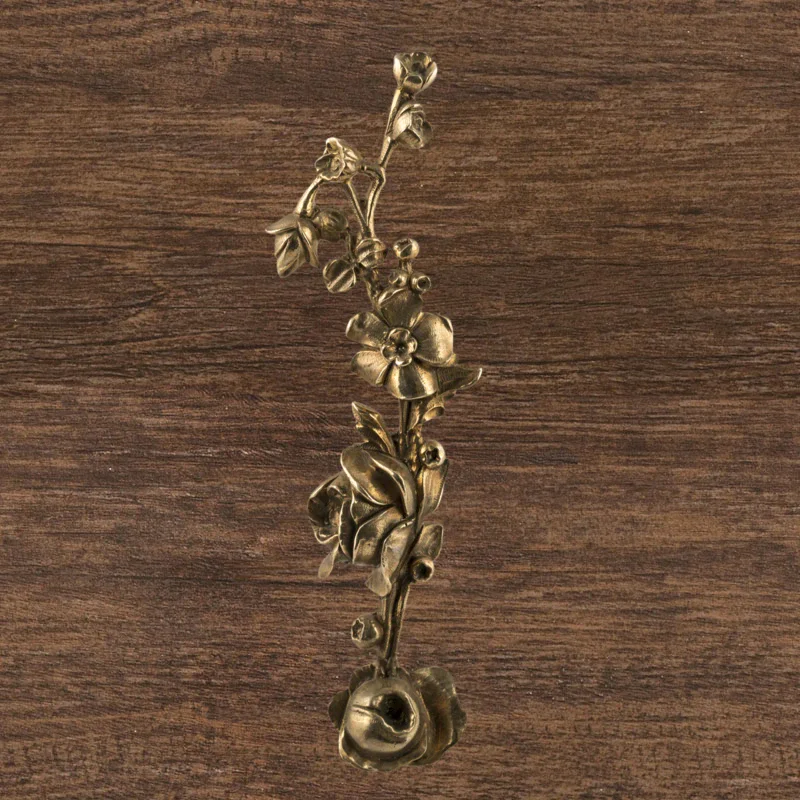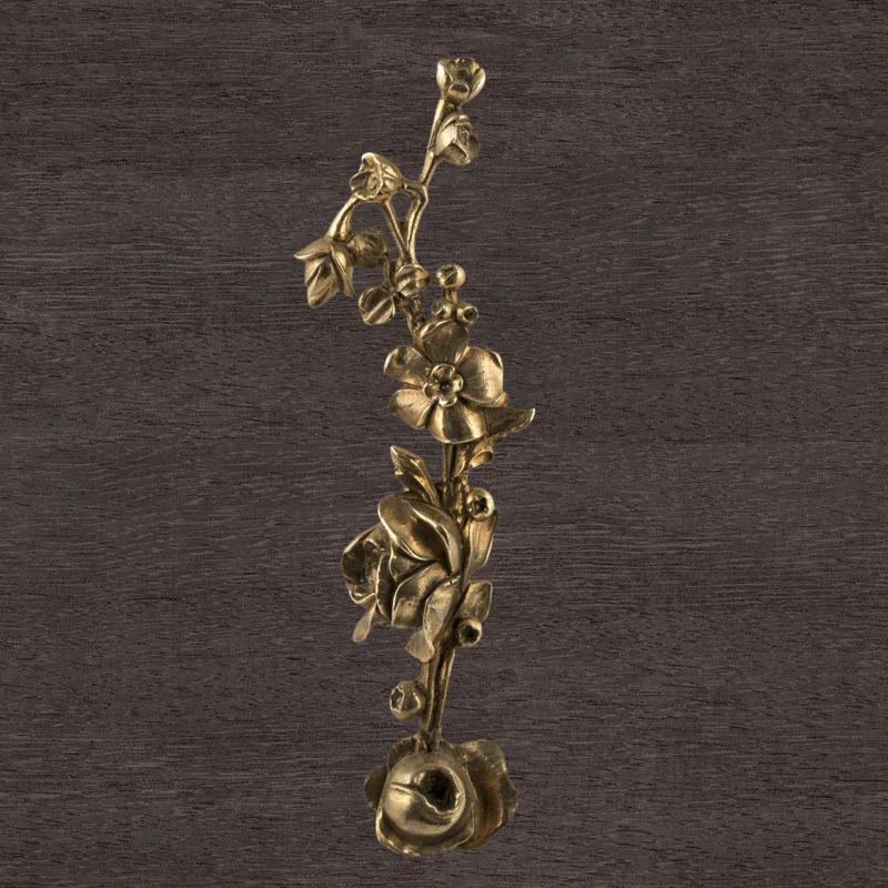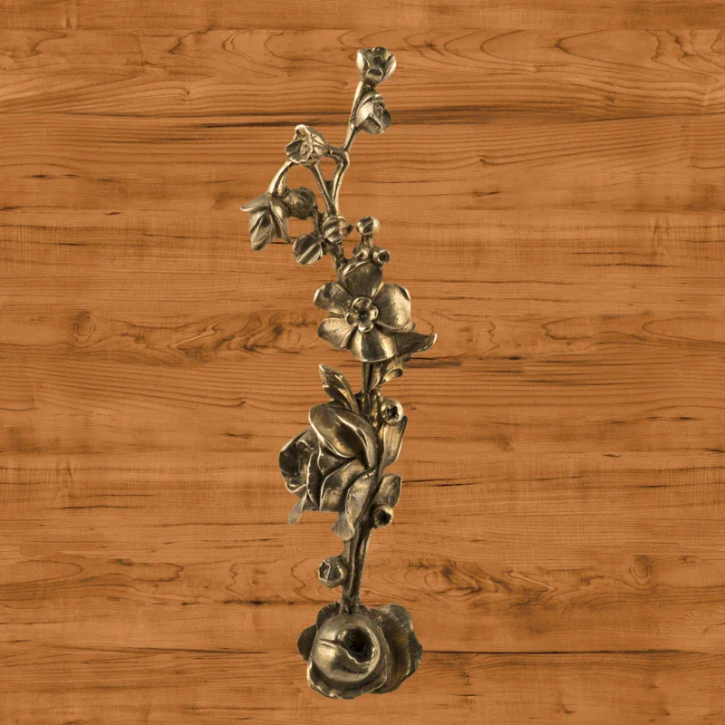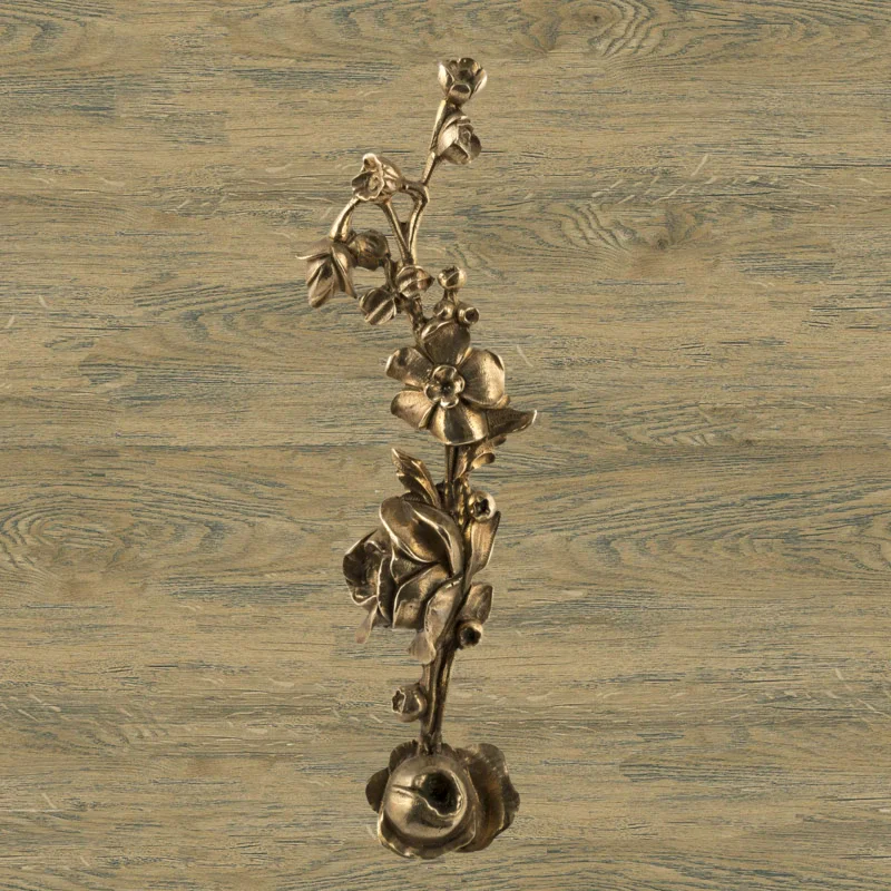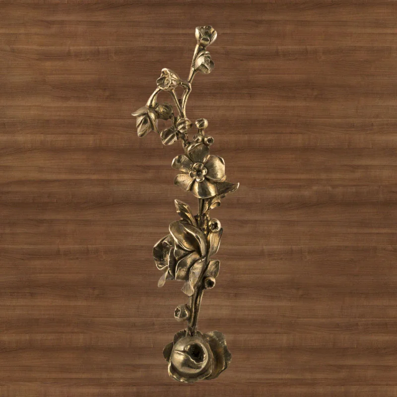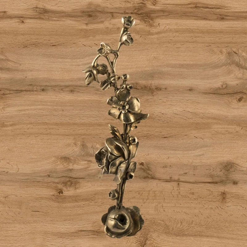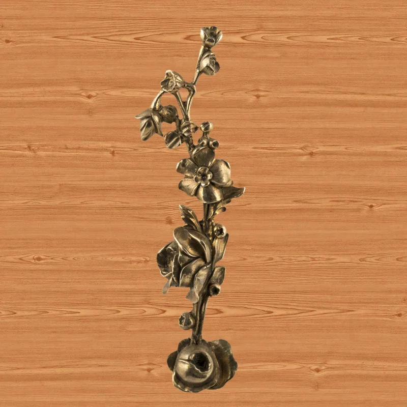 В оформлении этой декоративной накладки для мебели используются искривленные линии и флористические элементы. Оригинальная гирлянда из цветов снабжена большим количеством мелких деталей. При этом в дизайне соблюдается определенная симметрия. Представленная работа выполнена по технологии бронзового литья. Изготовление любой мебельной фурнитуры занимает до трех недель.