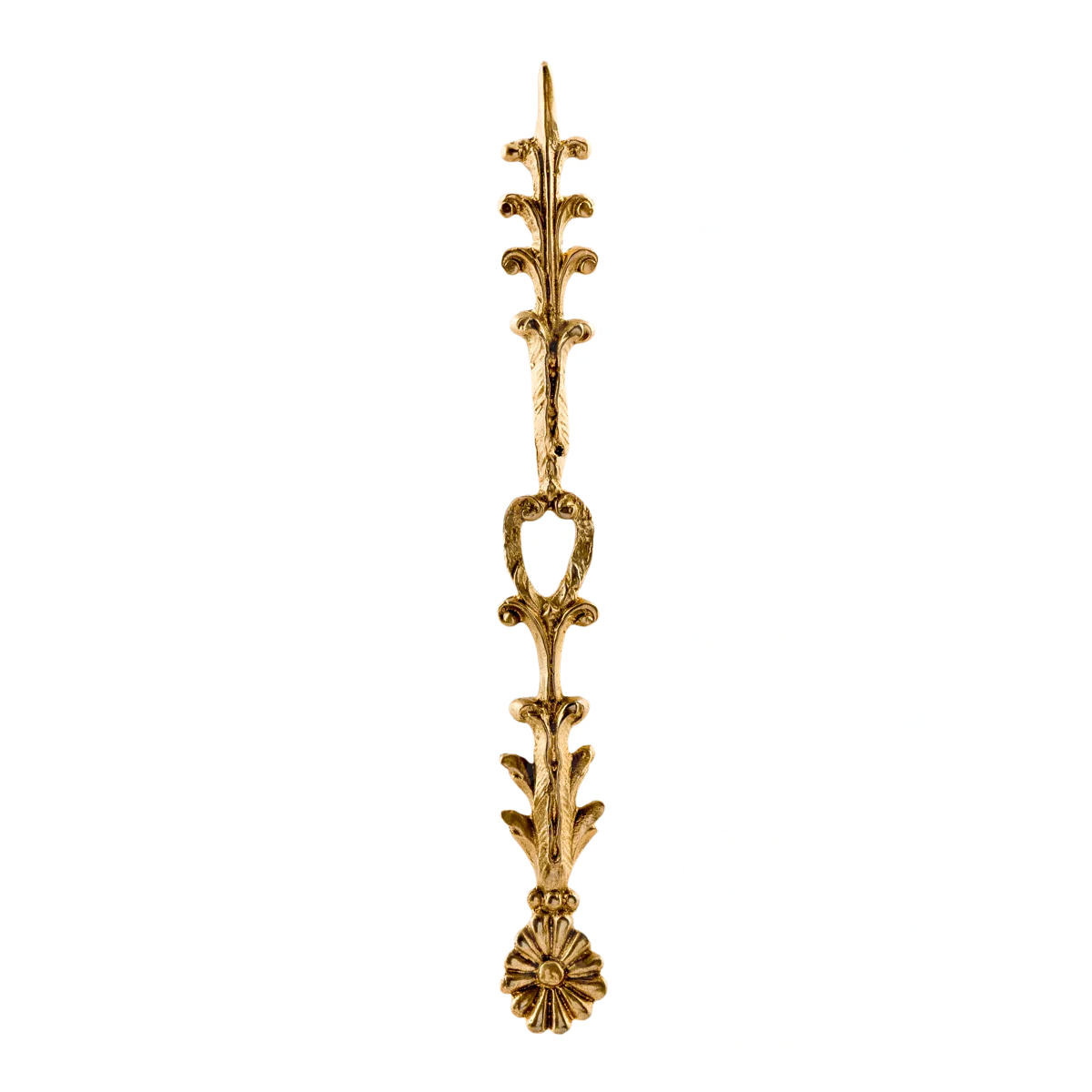 Мастерская «Калежа» создает уникальные пальметты – накладки в форме веерообразных листьев. Представленная работа может быть образцом при выполнении новых изделий. Она изготовлена по технологии художественного литья, где материалом послужила латунь. Мы выполняем подобные заказы в сжатые сроки – в течение трех недель. Также возможно создание фурнитуры по предоставленным эскизам клиентов.