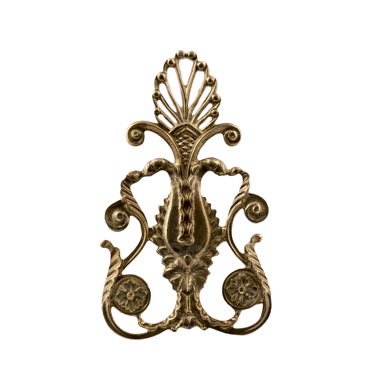 Мастерская «Калежа» создает уникальные пальметты – накладки в форме веерообразных листьев. Представленная работа может быть образцом при выполнении новых изделий. Она изготовлена по технологии художественного литья, где материалом послужила латунь. Мы выполняем подобные заказы в сжатые сроки – в течение трех недель. Также возможно создание фурнитуры по предоставленным эскизам клиентов.