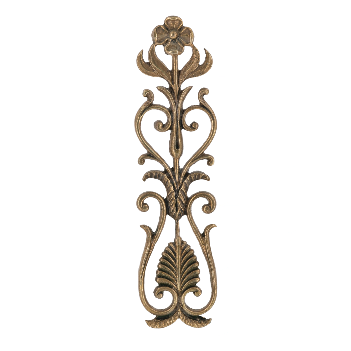 Мастерская «Калежа» создает уникальные пальметты – накладки в форме веерообразных листьев. Представленная работа может быть образцом при выполнении новых изделий. Она изготовлена по технологии художественного литья, где материалом послужила латунь. Мы выполняем подобные заказы в сжатые сроки – в течение трех недель. Также возможно создание фурнитуры по предоставленным эскизам клиентов.