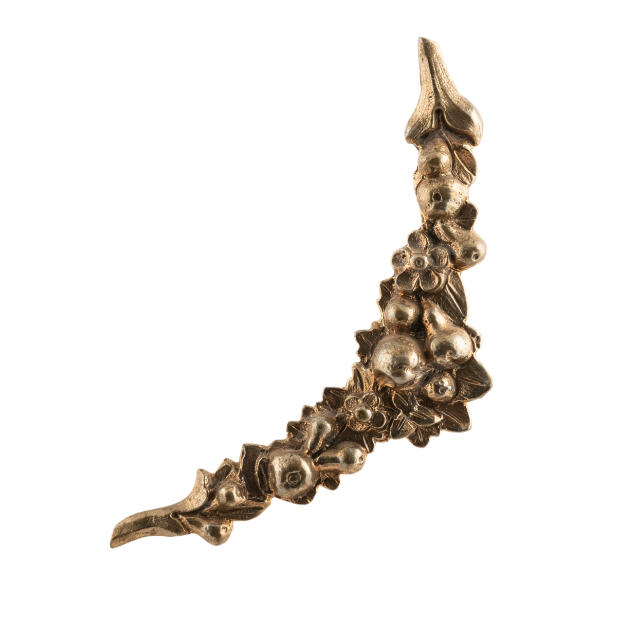 Мастерская «Калежа» выполняет декоративные элементы из латуни. Эта накладка создана по технологии бронзового литья. Гирлянда из цветов и плодов – безупречное украшение классического интерьера. Возможно изготовление мебельной фурнитуры в этом стиле в течение трех недель. При выполнении своей работы наши мастера учитывают идеи заказчиков – добавляют новые детали оформления или используют предоставленные эскизы.