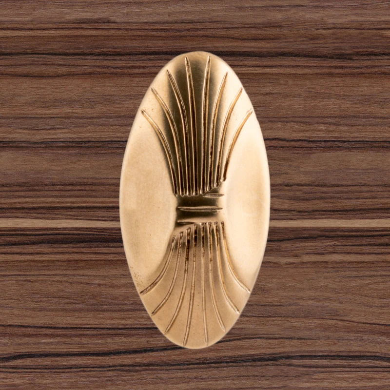 Ручка-кнопка сочетает узкое основание и широкое навершие. Фурнитура с простой формой и лаконичным дизайном не будет сильно бросаться в глаза после установки. Единственное украшение изделия — вырезанные на поверхности узкие полосы. Они практически не заметны на ощупь, не врезаются в руку при открывании. В каталоге представлена мебельная фурнитура из золотистой латуни. Наши мастера по индивидуальному заказу могут поменять тон на серебристый, темную бронзу.