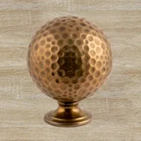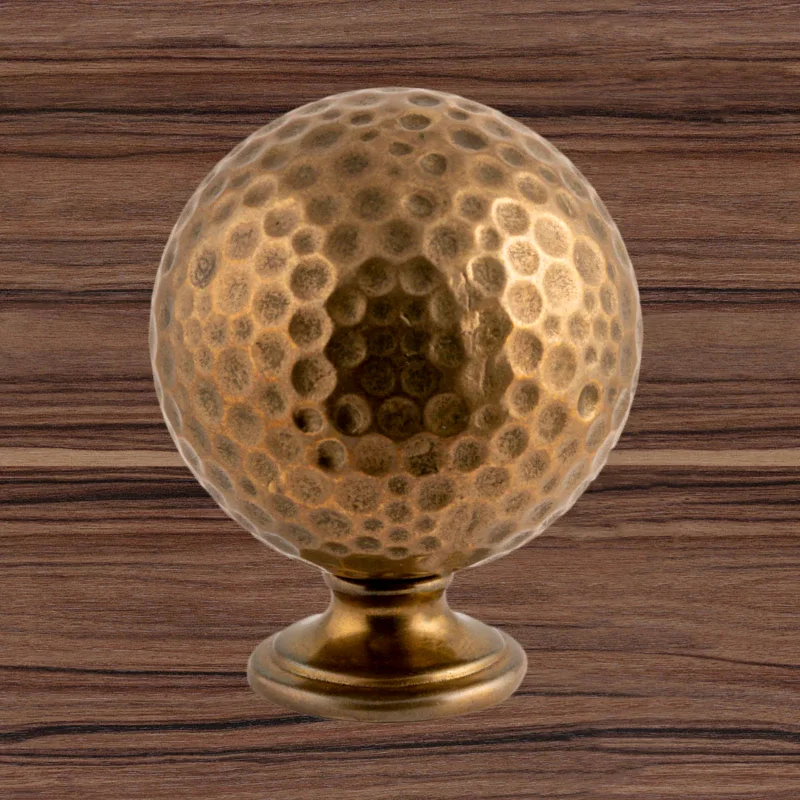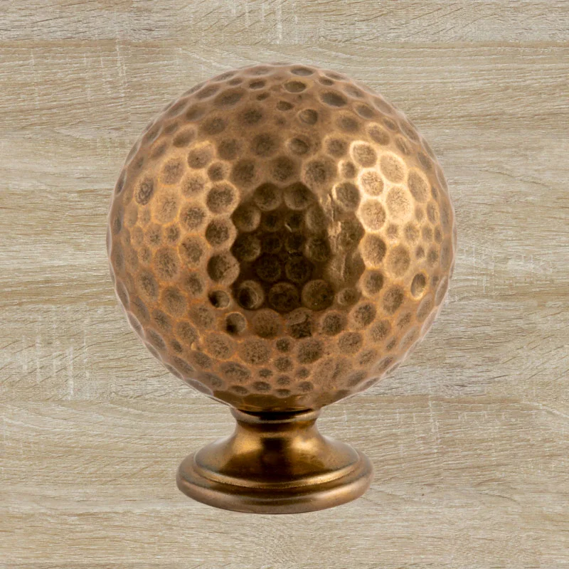 Ручка-кнопка — большой шар, сделанный из латуни по технологии бронзового литья. На фасаде мебели фурнитуру удерживает плоское круглое основание. Его диаметр меньше, чем у шара, поэтому после установки оно будет практически незаметно. Размеры ручки позволяют даже человеку с небольшой ладонью без особых усилий открывать мебельные дверцы и выдвигать ящики. Вы можете изменить высоту, диаметр, тонировку изделия при заказе.