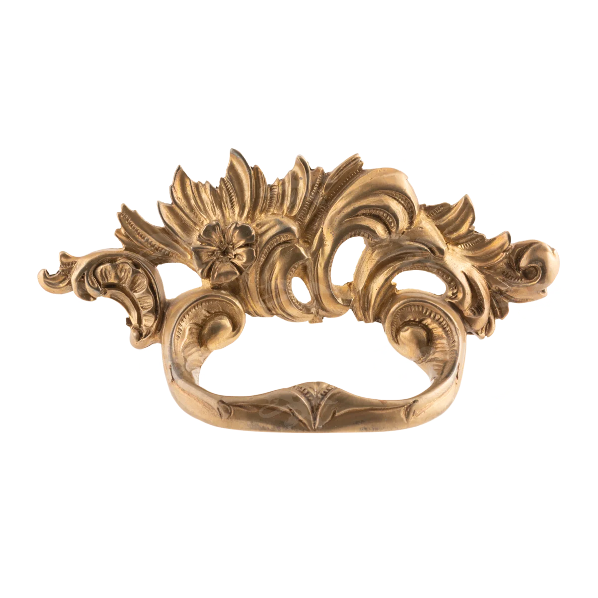 Оригинальная мебельная ручка в стиле рококо выполнена в мастерской «Калежа» по индивидуальному проекту. Фурнитура из латуни подходит для монтажа на различные предметы интерьера. Растительные элементы, ломаные линии и завитки гармонично сочетаются как со старинной мебелью, так и с деталями современных интерьеров. Такие ручки отличаются прочностью и долговечностью.