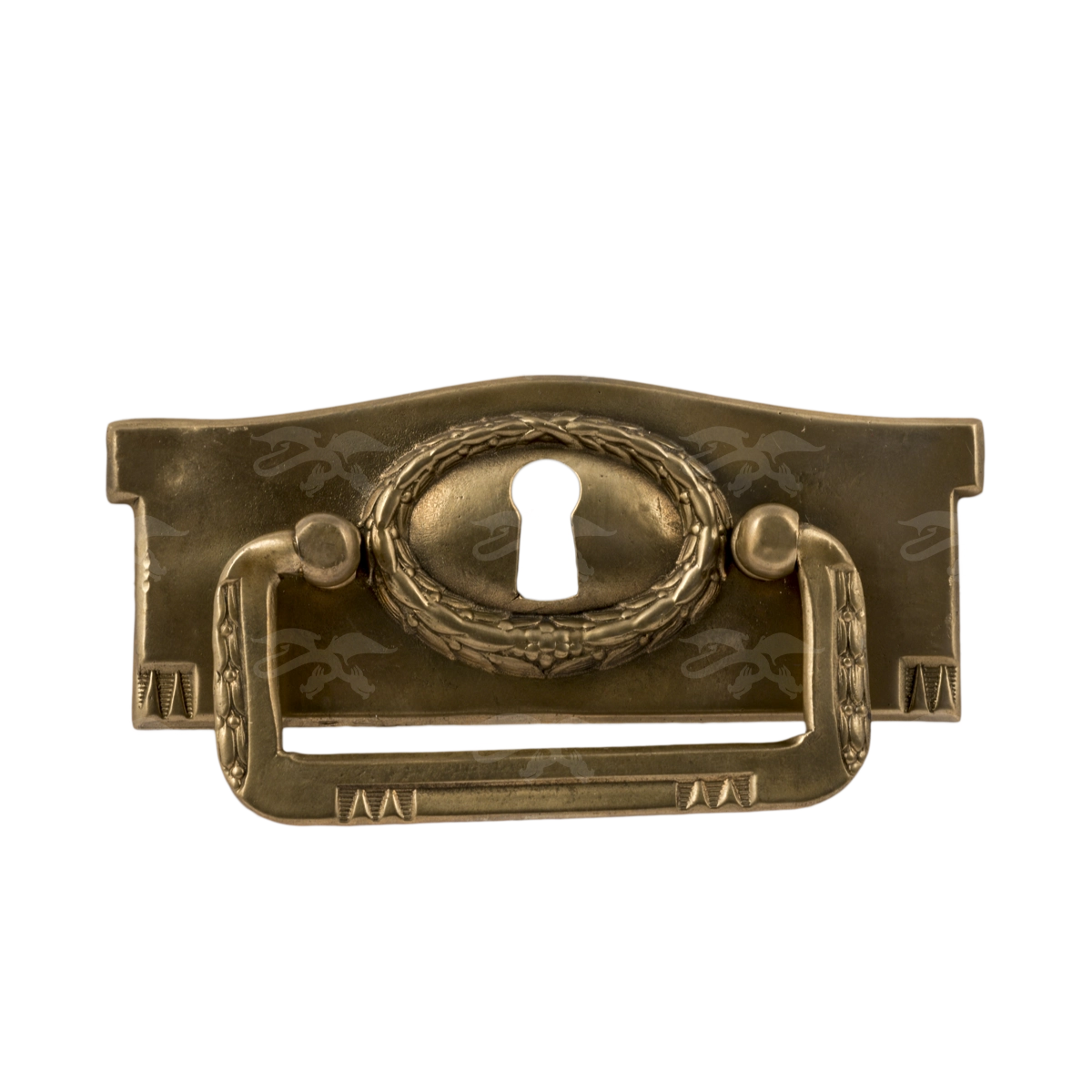 Рамка - прямоугольник, завершенный валютой, с венком вокруг скважины и гуттами в нижних углах. Ручка в виде валюты с гуттами