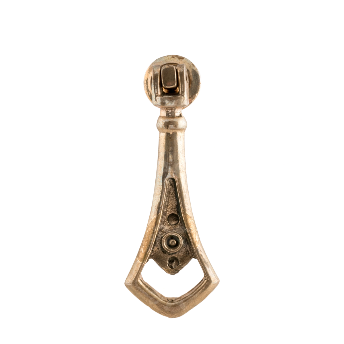 Представленная мебельная ручка создана из бронзы по технологии художественного литья. Фурнитура в стиле модерн имеет ромбовидную форму. На внутренней части подвижного элемента изображен сложный узор. Такие мебельные ручки функциональны, надежны и долговечны. Они прекрасно сочетаются с фурнитурой, выполненной в том же стиле. Если вам необходима ручка-кнопка, купить ее также можно в художественно-производственной мастерской «Калежа». Принимаются заказы на бронзовые изделия любых размеров и форм.