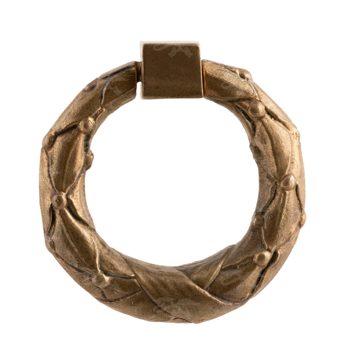 Ручка для мебели, выполненная в стиле ампир, по своей форме напоминает венок. Плавные линии, четкость и однозначность пропорций превращают фурнитуру в декоративное и функциональное украшение помещения. Специалистами мастерской «Калежа» предусмотрен удобный захват. При создании ручки использовалась качественная латунь. Изделие подходит для установки в классических и современных интерьерах.