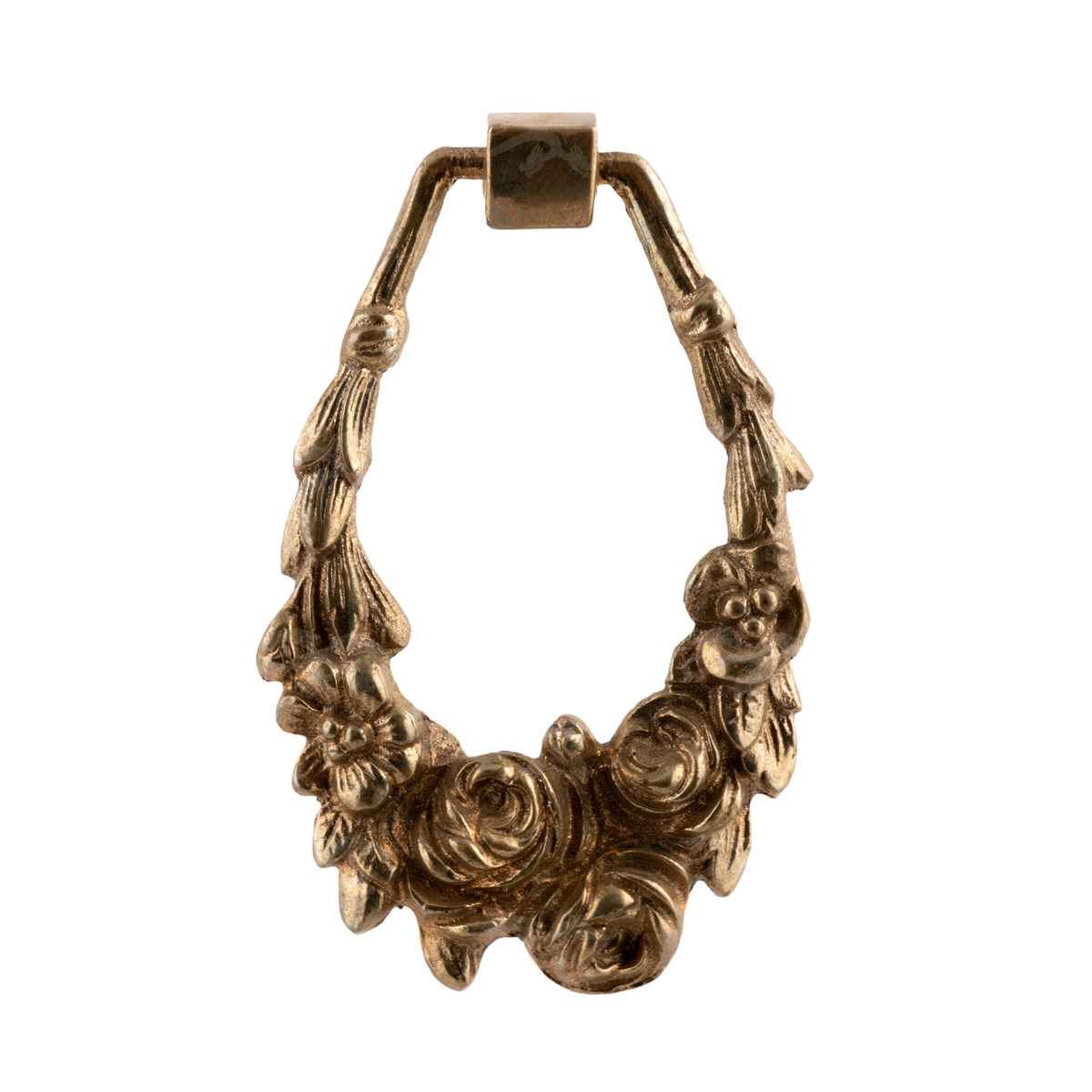 Роскошная мебельная ручка в стиле барокко − изысканное изделие, которое создано для тех, кто ценит яркие и запоминающиеся аксессуары. Подвижная часть выполнена в виде тяжелого кольца. Изделие имеет форму венка из роз. Крупные бутоны по нижней части кольца выполнены с удивительной точностью. Его дополняют вкрапления листьев.