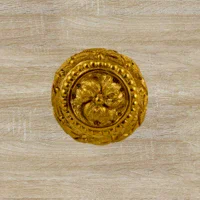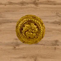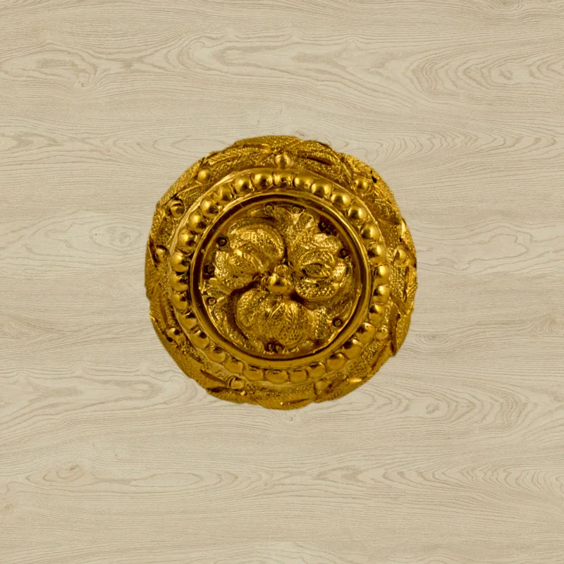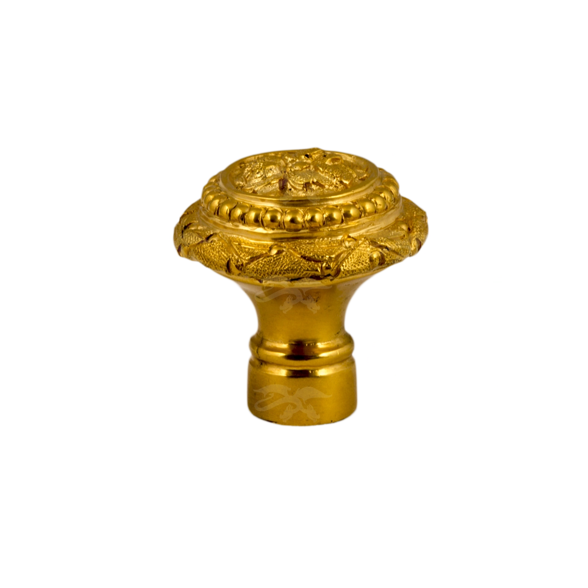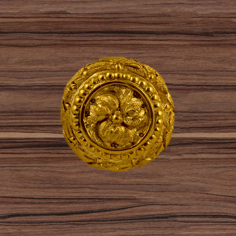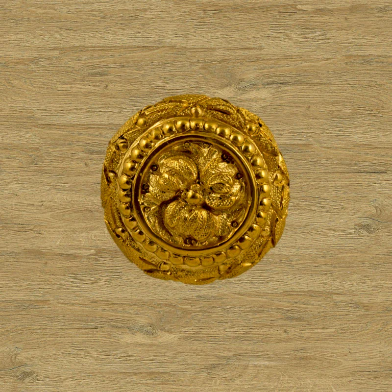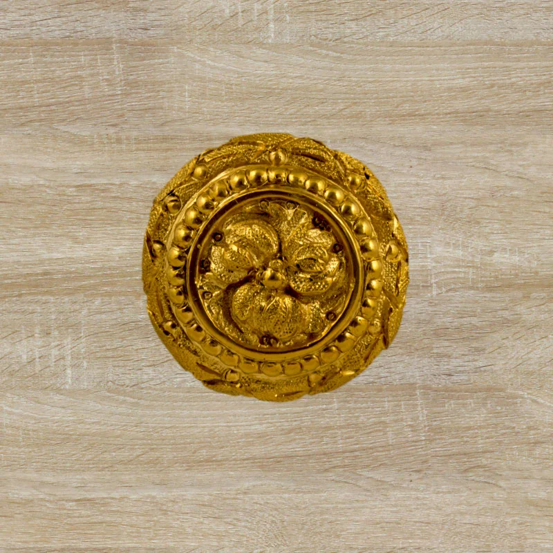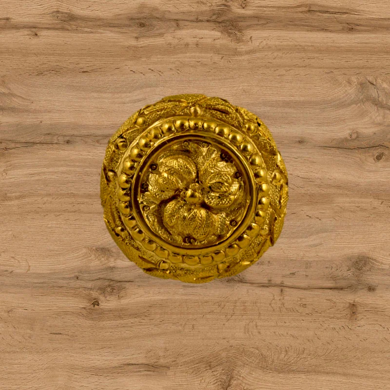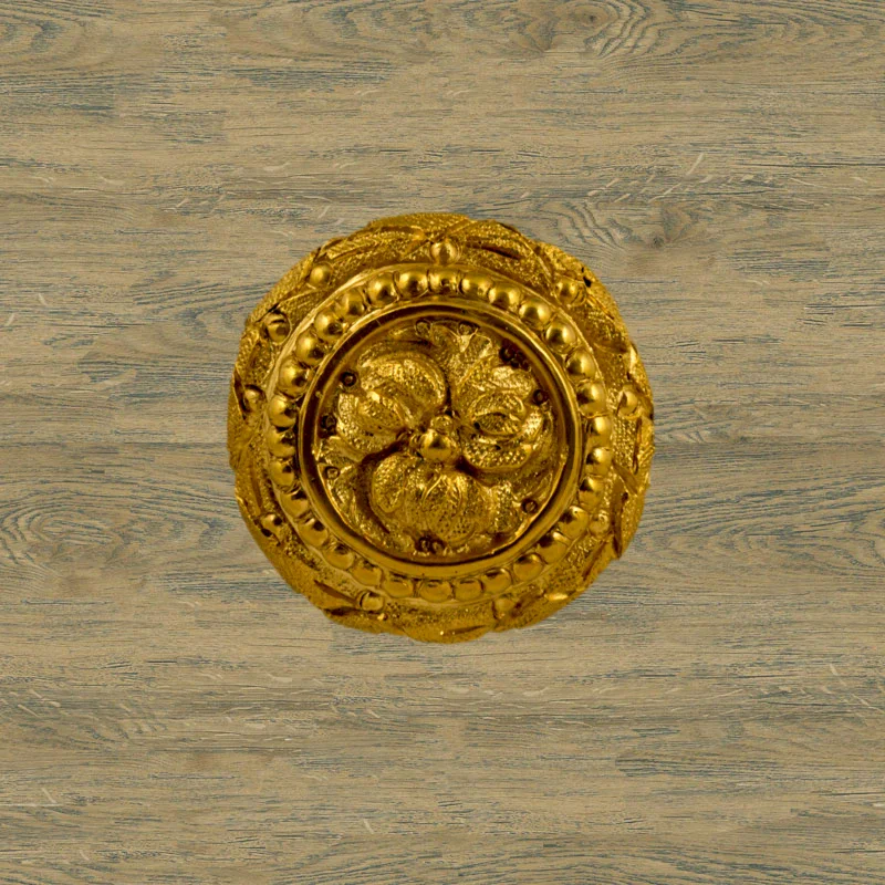 В мастерской «Калежа» можно заказать мебельную фурнитуру из латуни с нестандартным оформлением. Ручка-кнопка в стиле барокко получена при помощи бронзового литья. Она позволяет с удобством открывать и закрывать тумбы или шкафы. Работа снабжена пышным растительным узором. Изготовление подобного заказа занимает до трех недель.