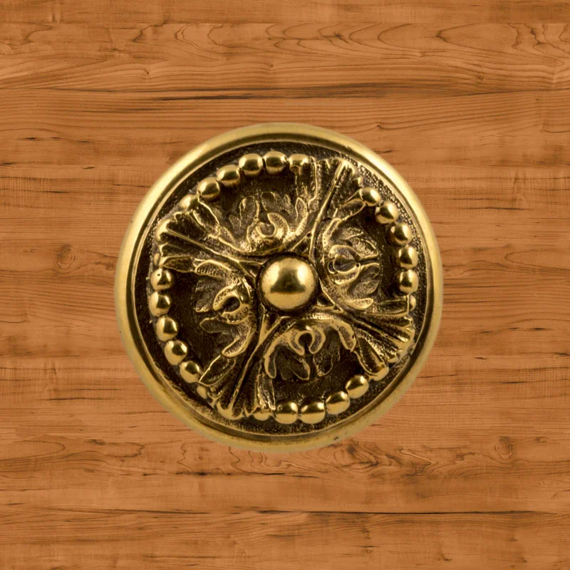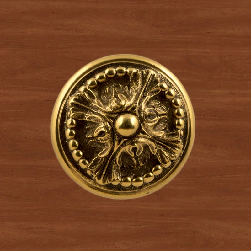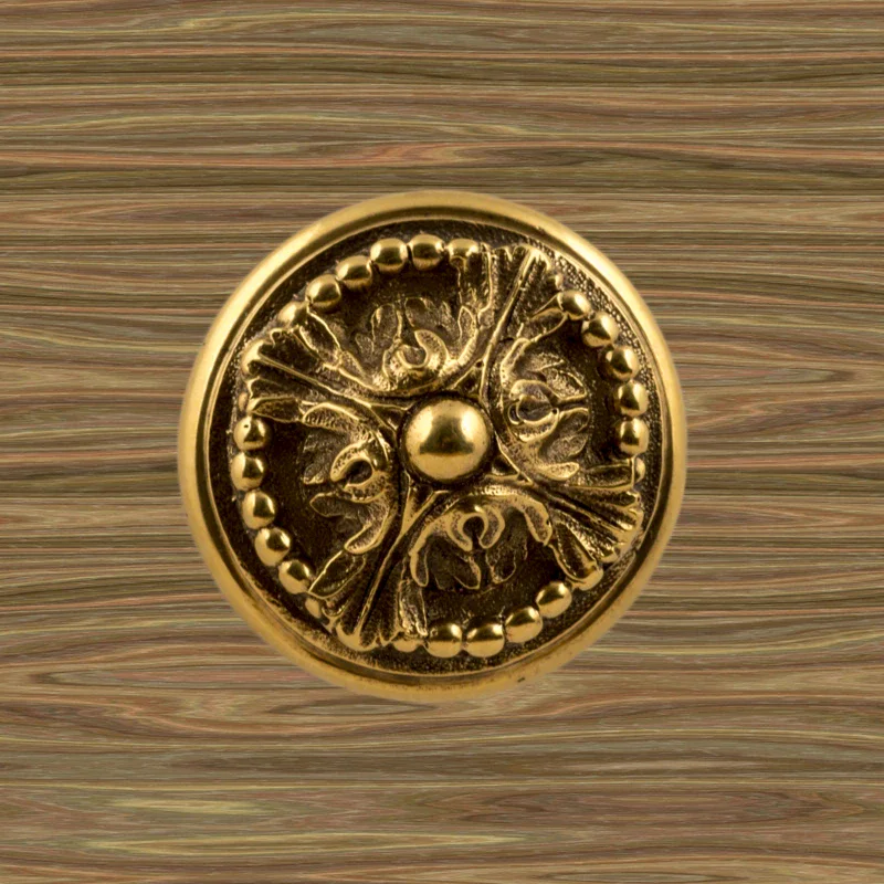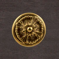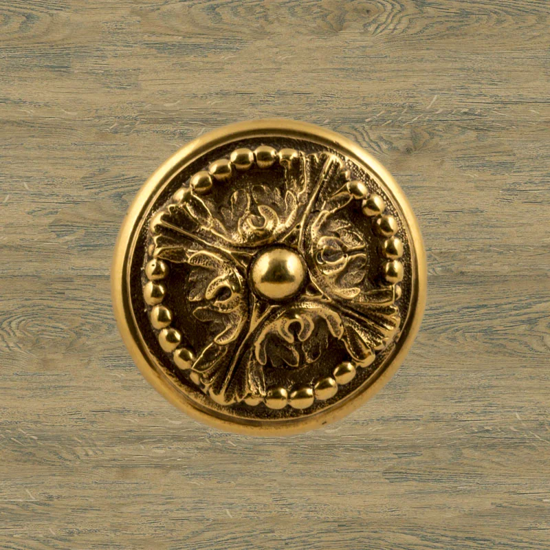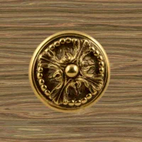 Мастерская «Калежа» создает мебельную фурнитуру, используя латунь. Оригинальная ручка-кнопка в стиле модерн имеет сложную форму. Ей удобно пользоваться, если нужно открыть или закрыть шкаф. Работая над проектом, мы применяли бронзовое литье. Для имитации потертой поверхности мастера использовали технологию чернения. Возможно изготовление комплектующих для мебели всего за три недели.