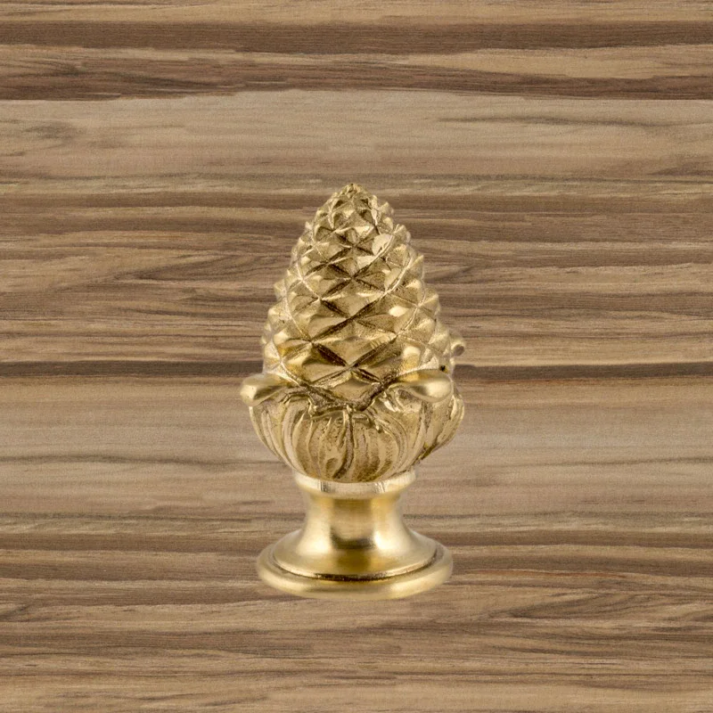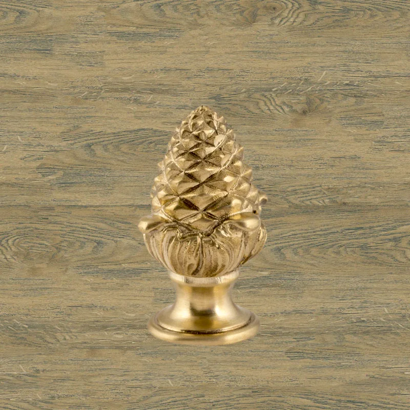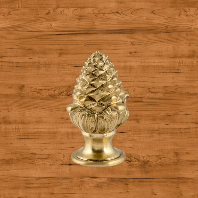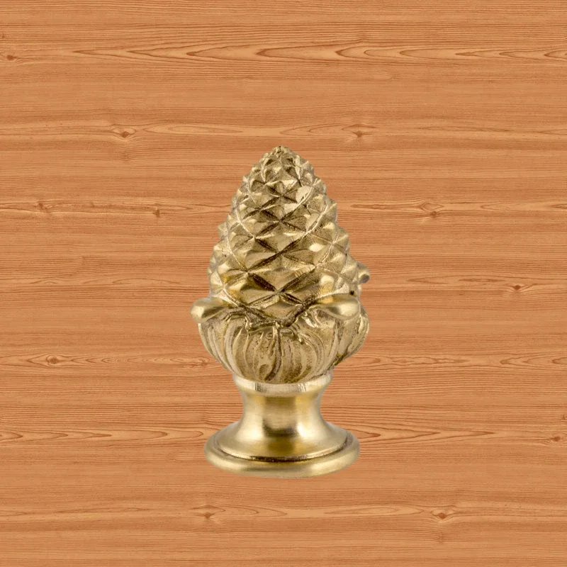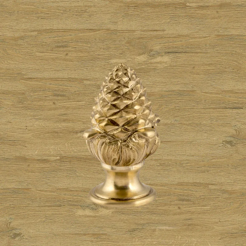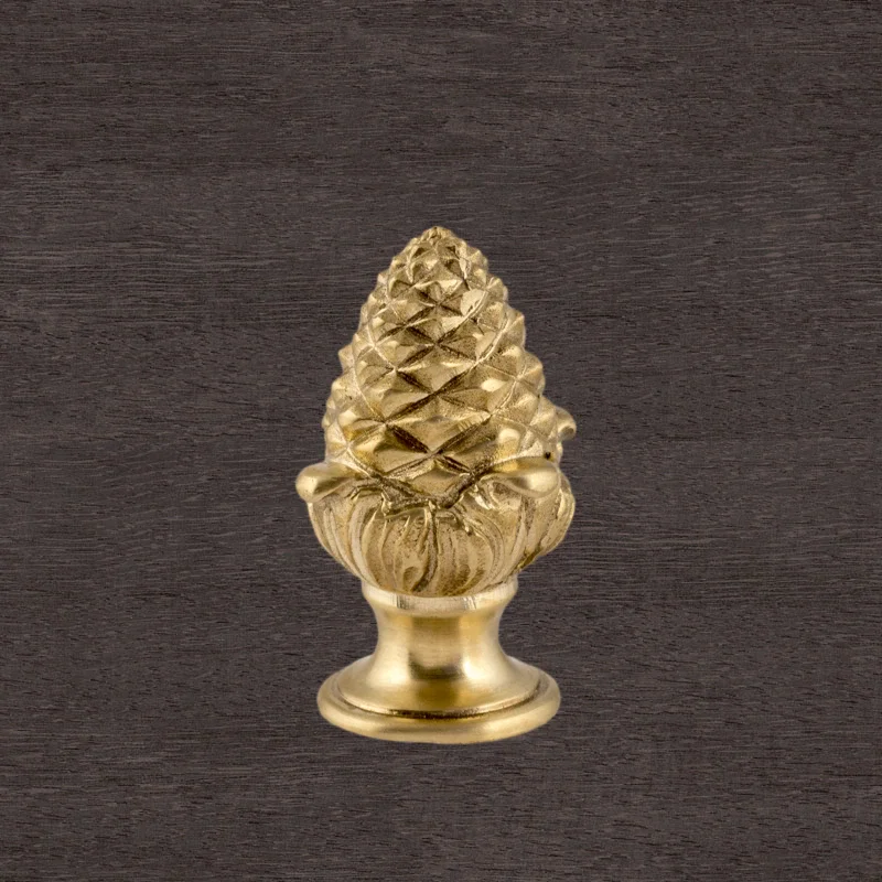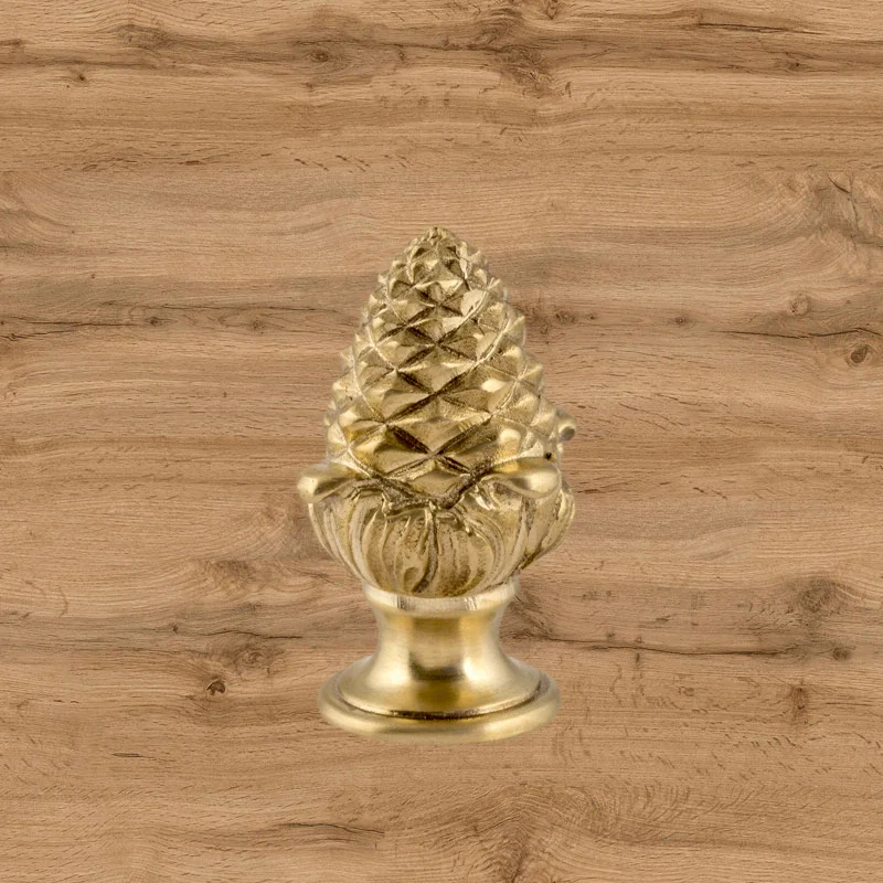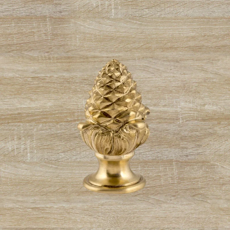 Оригинальная ручка-кнопка изготовлена из латуни. Благодаря ей дверца шкафа остается в закрытом положении и не совершает нежелательных движений. Изделие в форме сосновой шишки получено при помощи технологии художественного литья. Для создания эффекта антикварной мебели также применялось золочение. Изготовление подобных деталей в мастерской «Калежа» занимает всего три недели. Возможно добавление новых декоративных элементов.