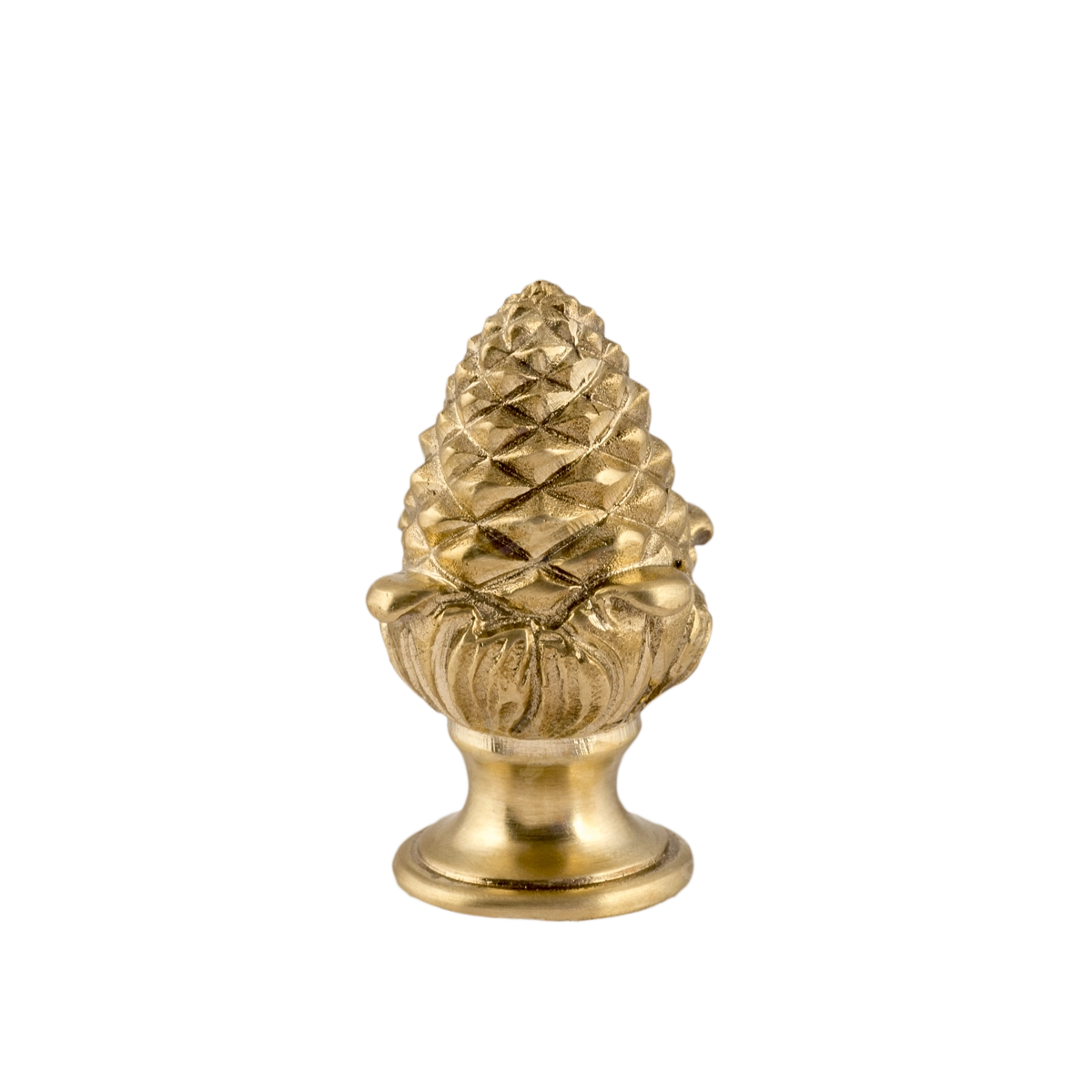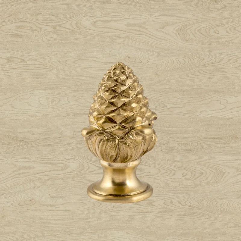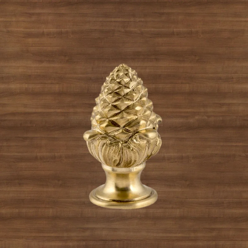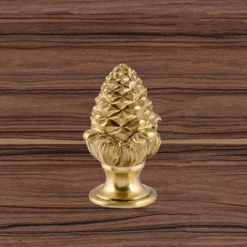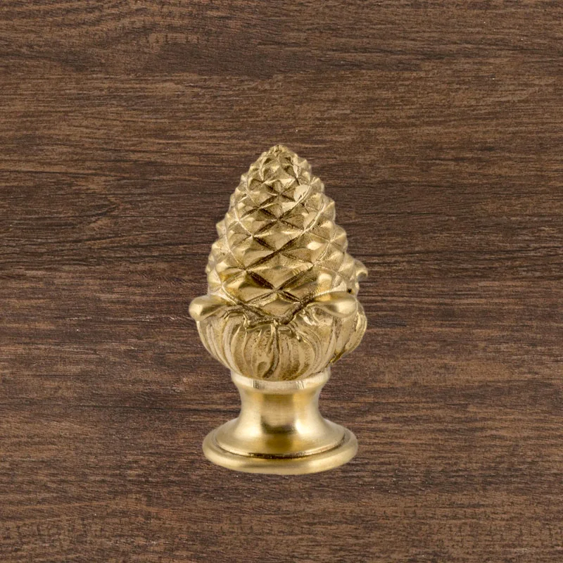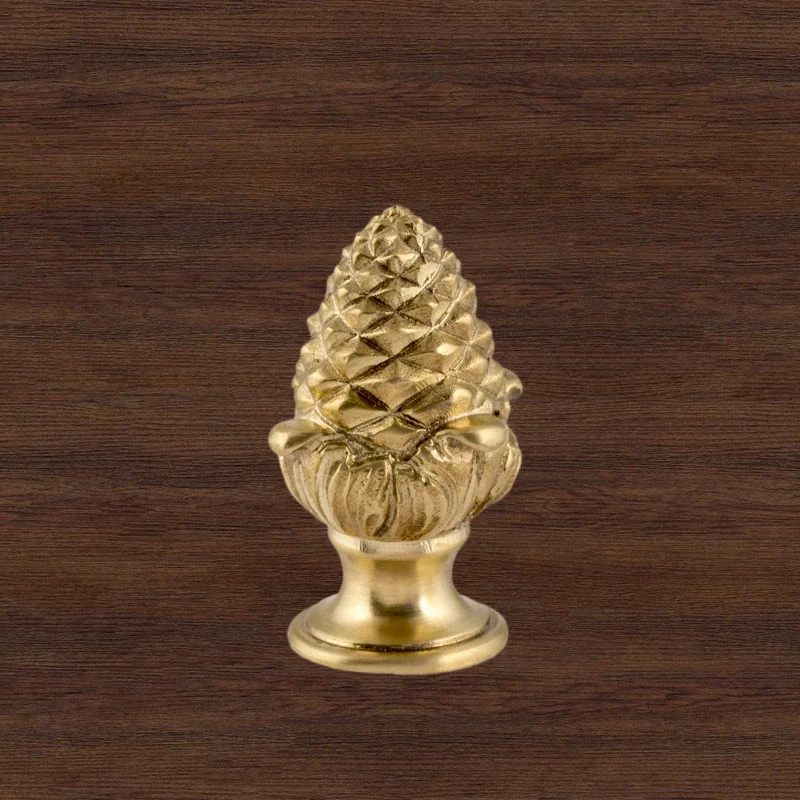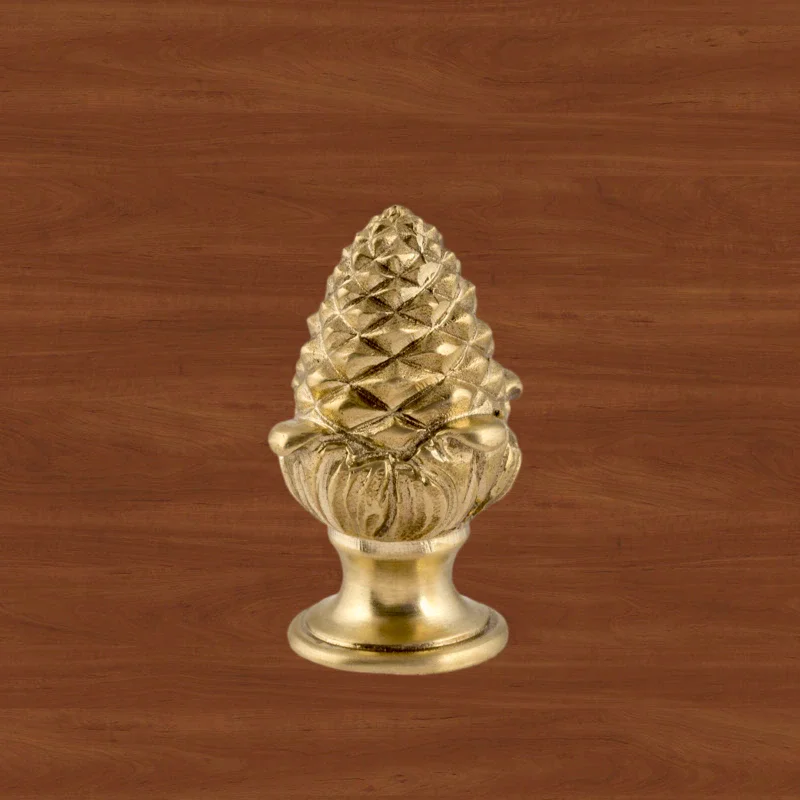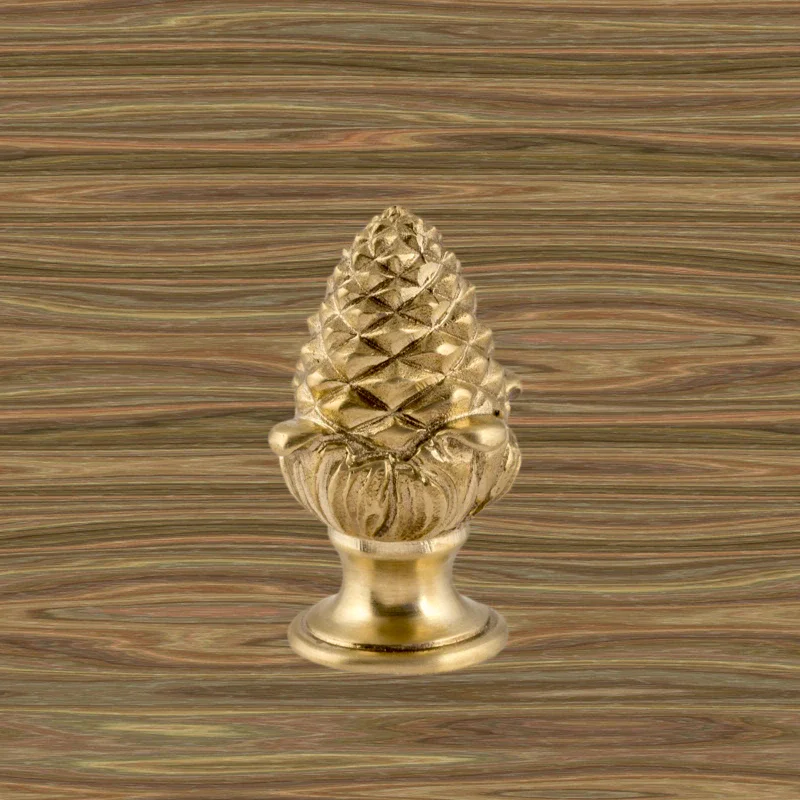 Оригинальная ручка-кнопка изготовлена из латуни. Благодаря ей дверца шкафа остается в закрытом положении и не совершает нежелательных движений. Изделие в форме сосновой шишки получено при помощи технологии художественного литья. Для создания эффекта антикварной мебели также применялось золочение. Изготовление подобных деталей в мастерской «Калежа» занимает всего три недели. Возможно добавление новых декоративных элементов.