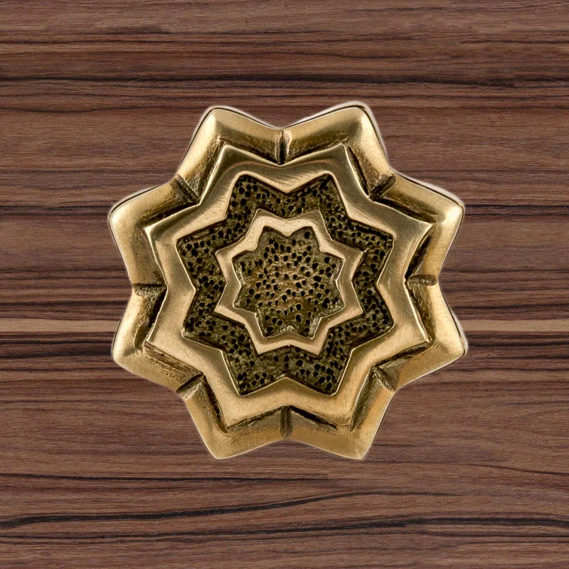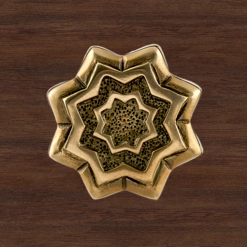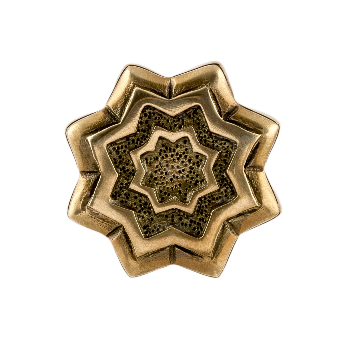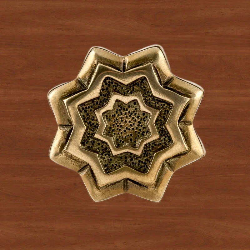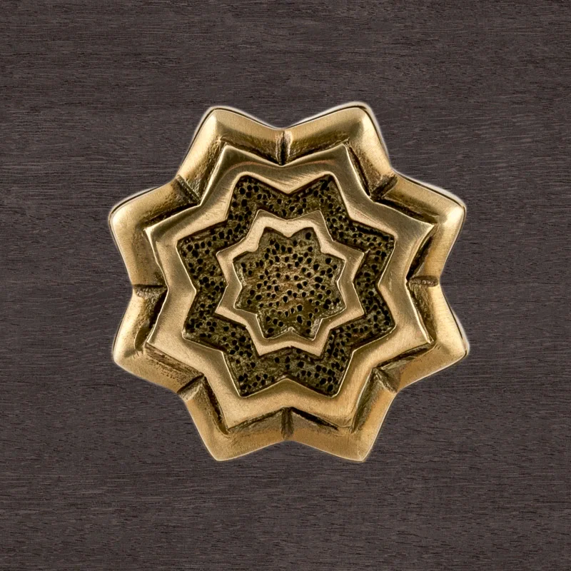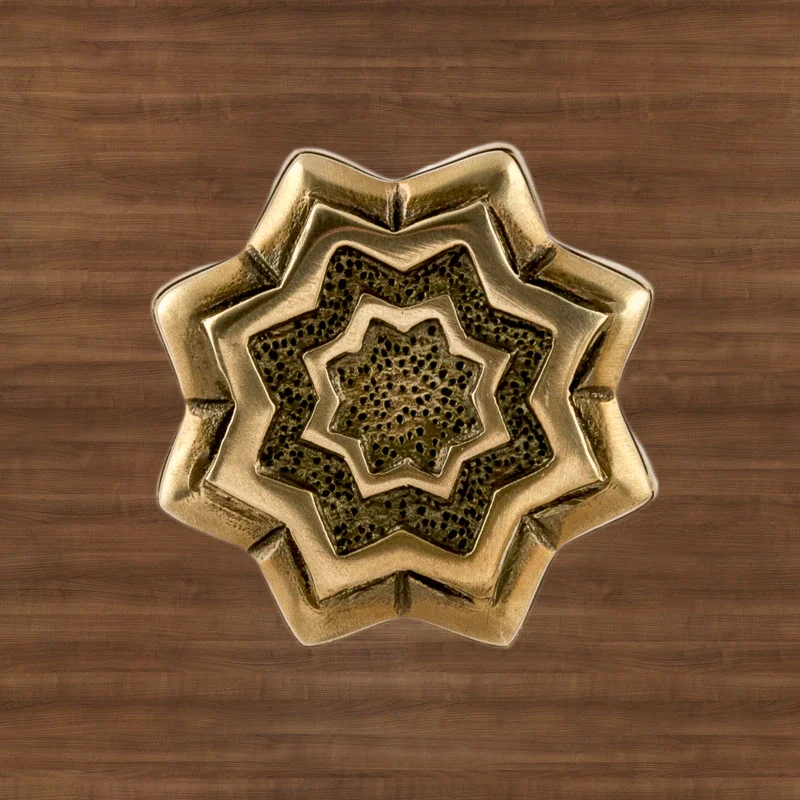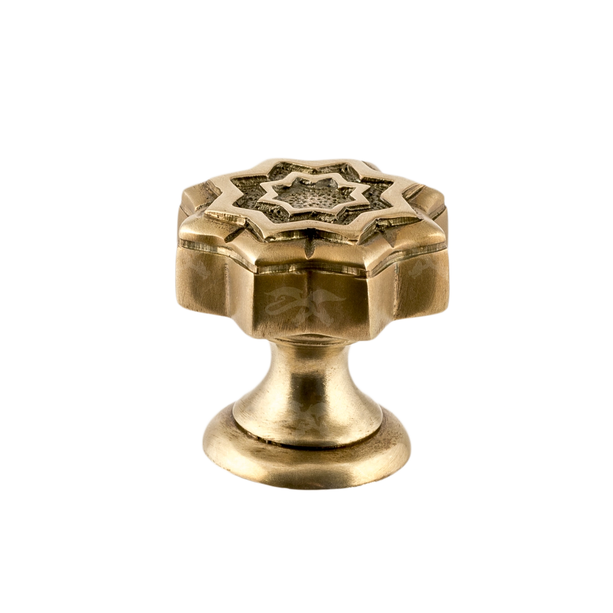 Оригинальная ручка-кнопка изготовлена из латуни. Она надежно удерживает дверцы тумб и шкафов в закрытом положении. Представленный образец создан по технологии бронзового литья. Чтобы получить эффект дорогого антиквариата, мы использовали полирование и золочение. Изготовление подобной мебельной фурнитуры занимает три недели. В дизайн-проект можно добавить новые декоративные элементы.