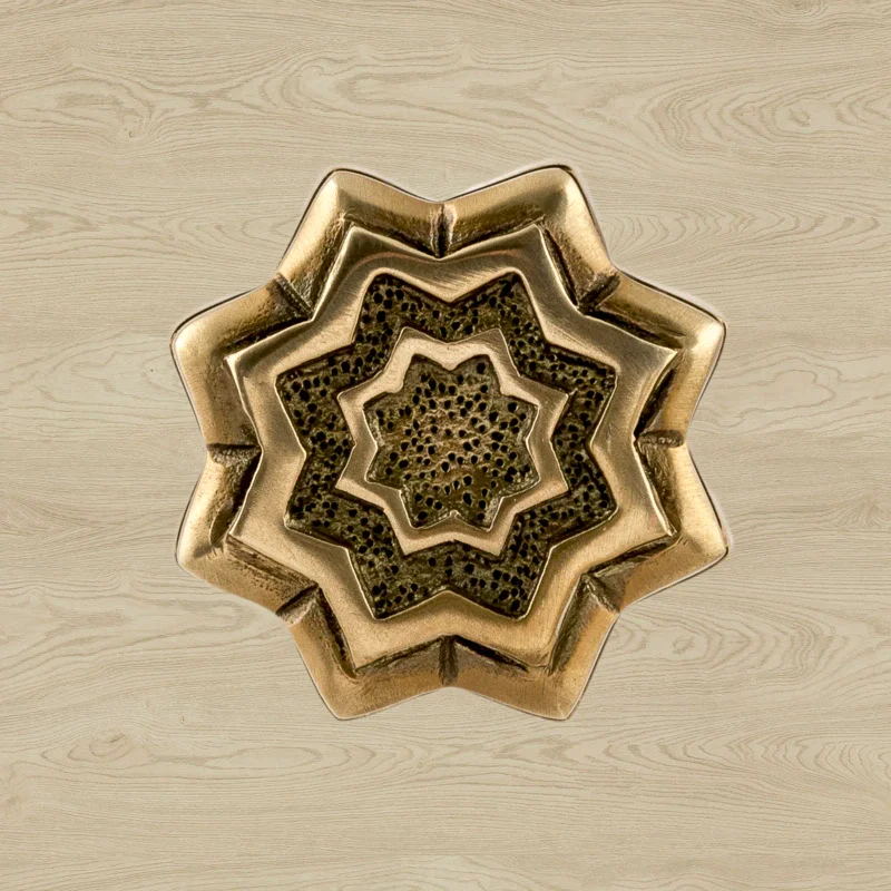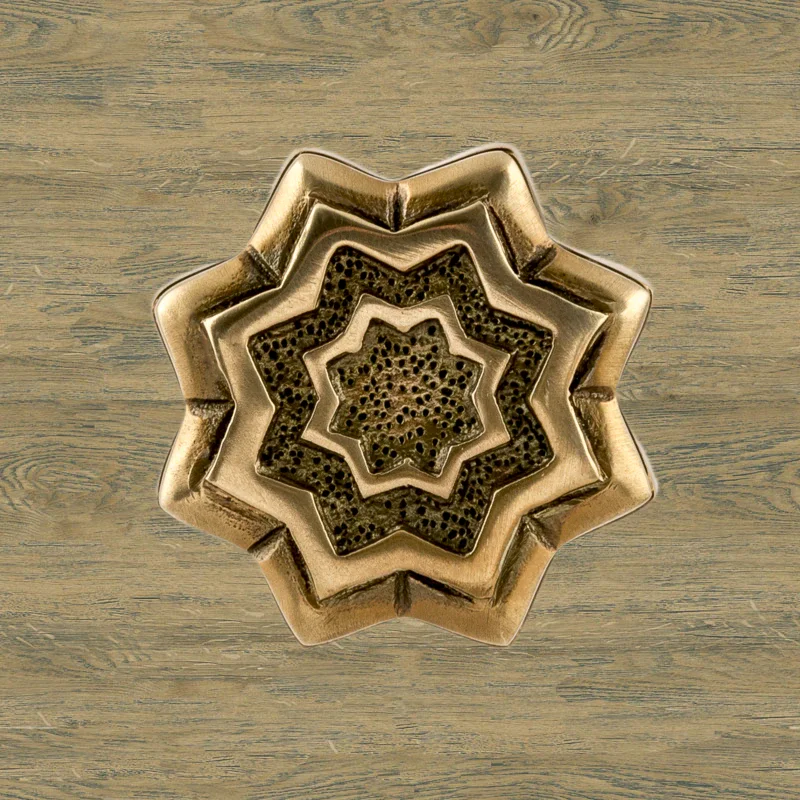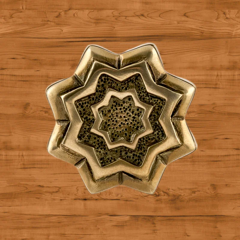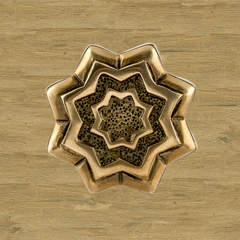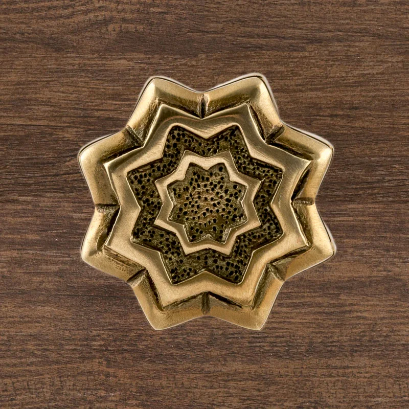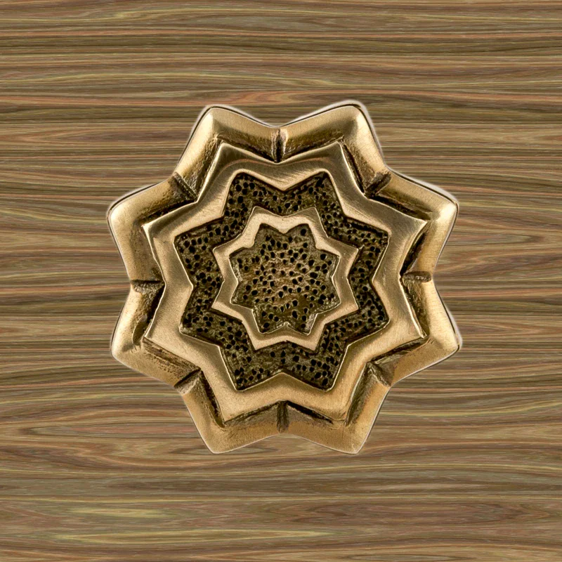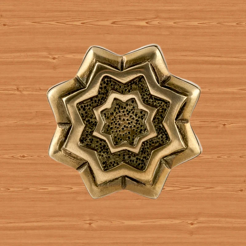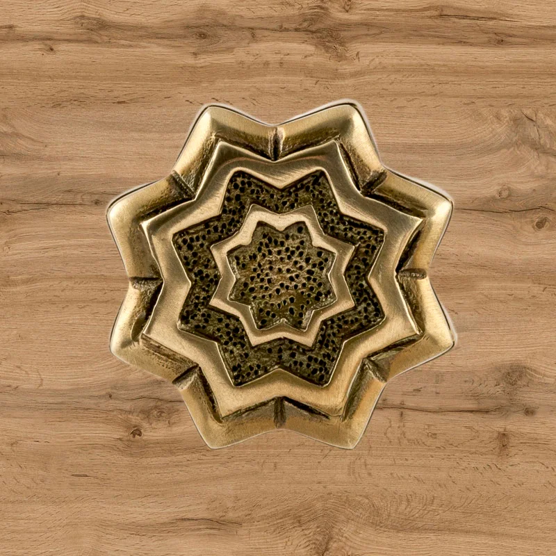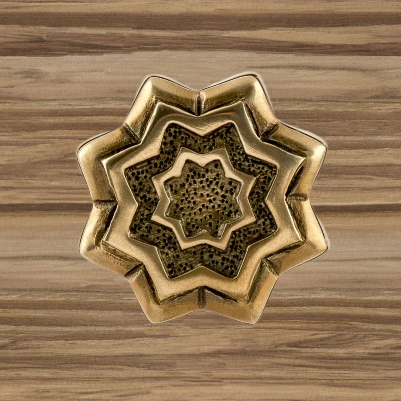Оригинальная ручка-кнопка изготовлена из латуни. Она надежно удерживает дверцы тумб и шкафов в закрытом положении. Представленный образец создан по технологии бронзового литья. Чтобы получить эффект дорогого антиквариата, мы использовали полирование и золочение. Изготовление подобной мебельной фурнитуры занимает три недели. В дизайн-проект можно добавить новые декоративные элементы.