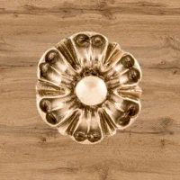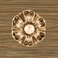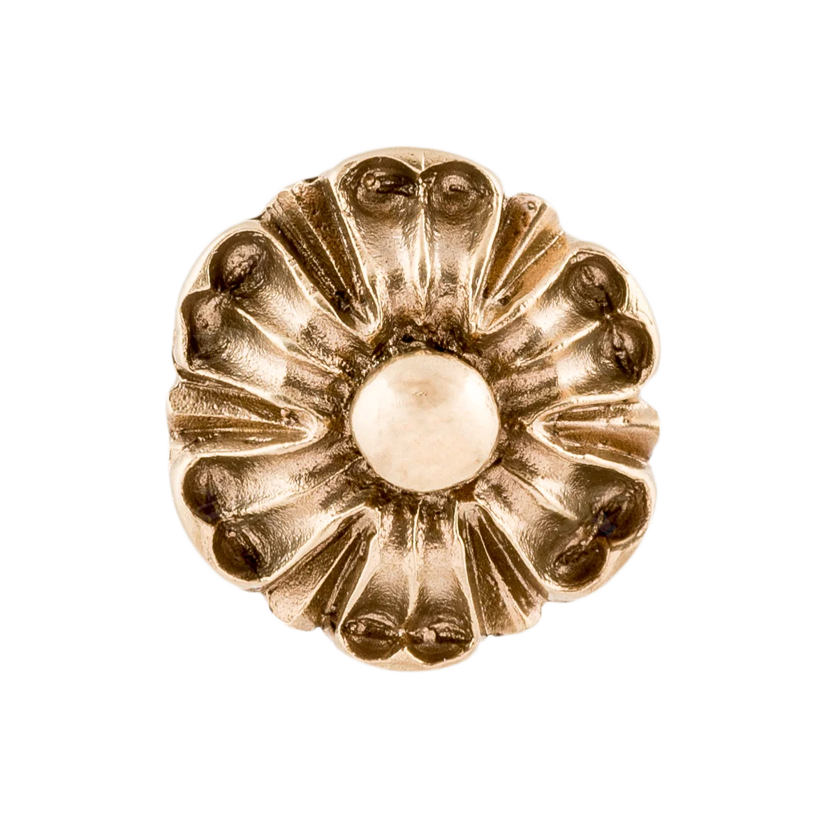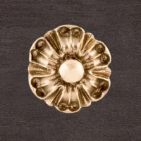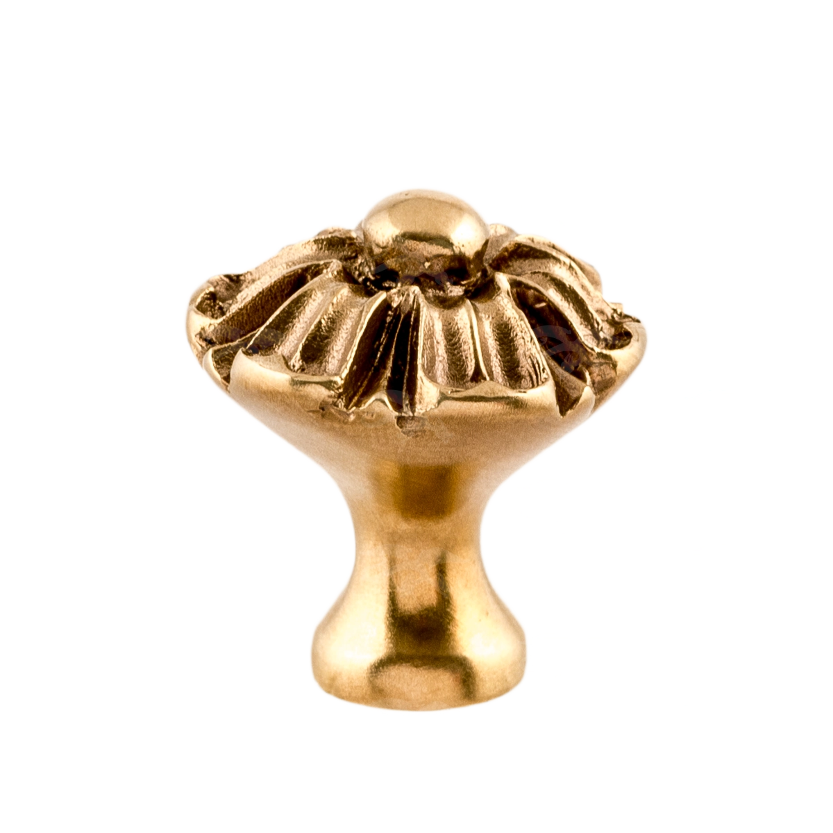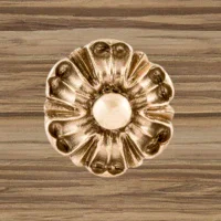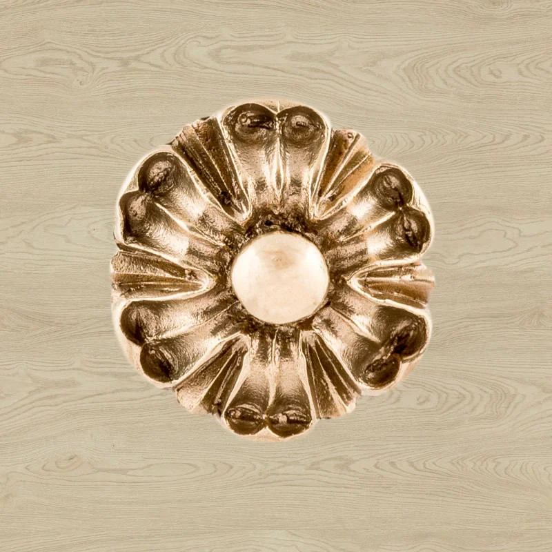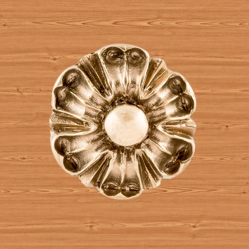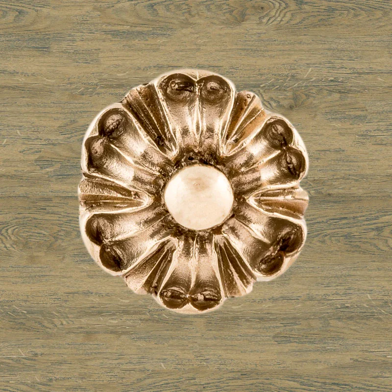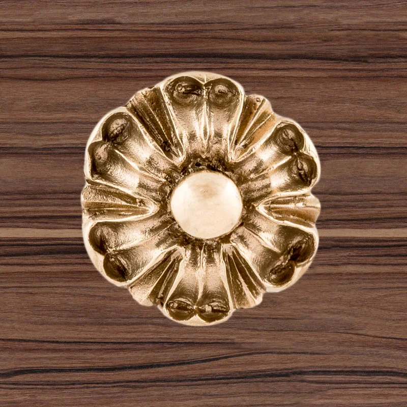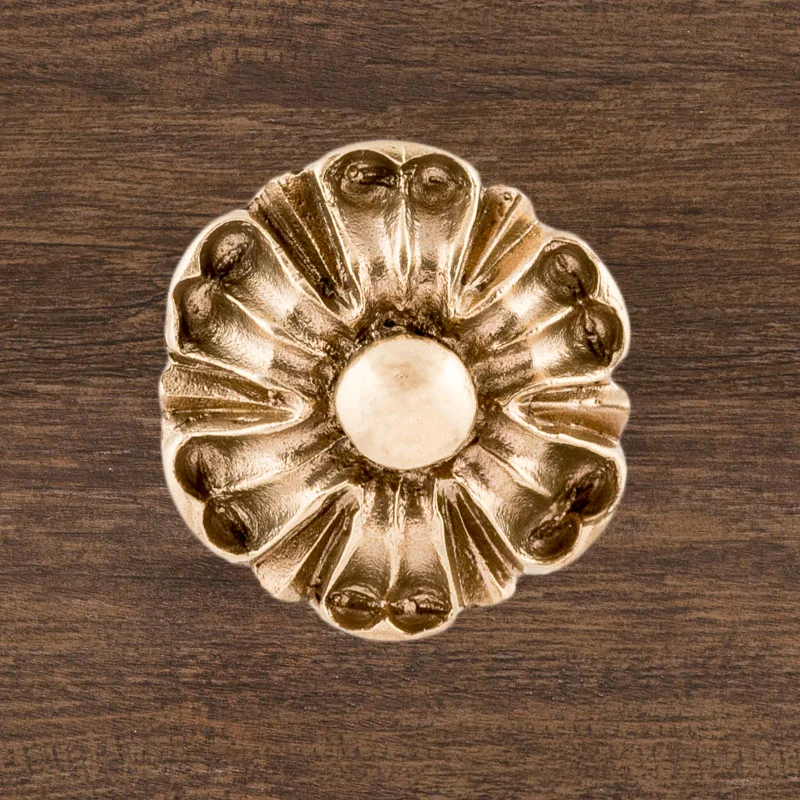 Ручка-кнопка сделана в виде цветка с пышными лепестками. Благодаря искусной резьбе они выглядят объемными и живыми. За счет золотистого оттенка латуни — кажутся теплыми и словно бы подсвеченными солнцем. Ручка не просто красива, но и очень удобна. Небольшой раскрывшийся бутон просто захватить рукой, чтобы вытащить из комода тяжелый ящик. Представленный образец можем повторить и в других размерах.