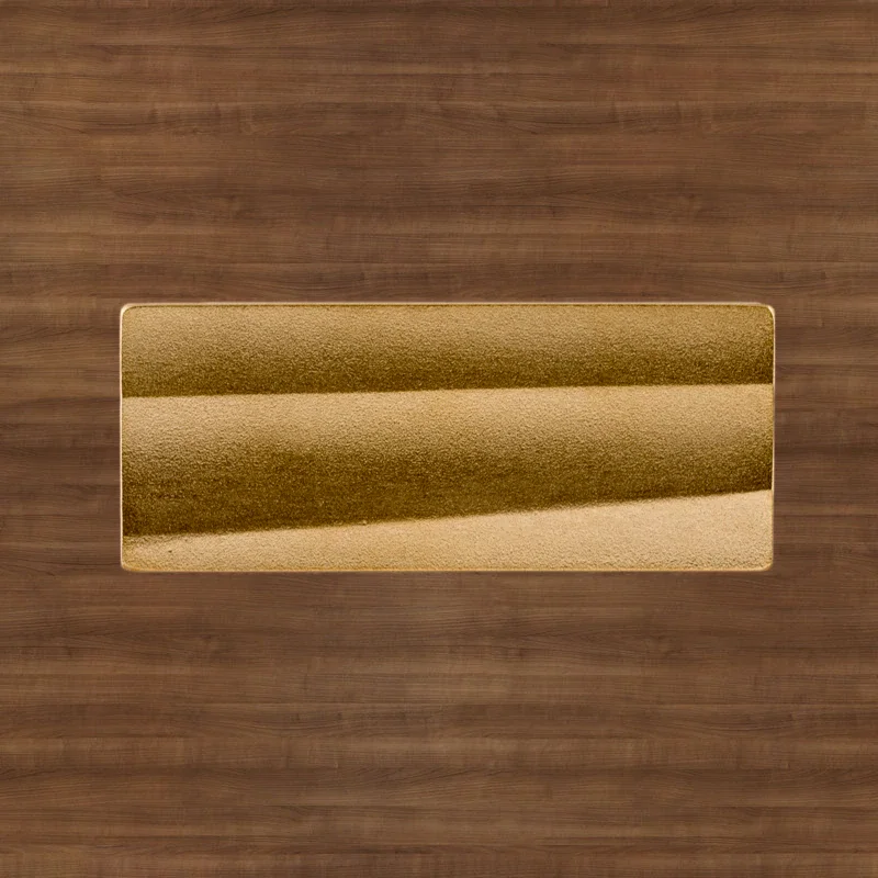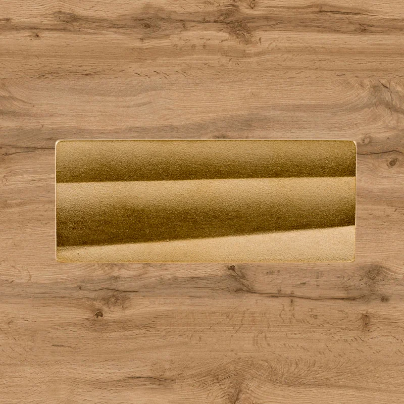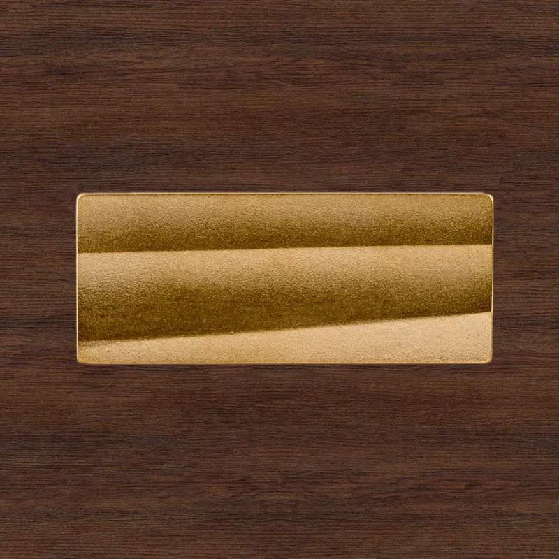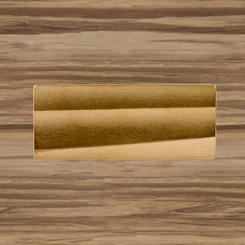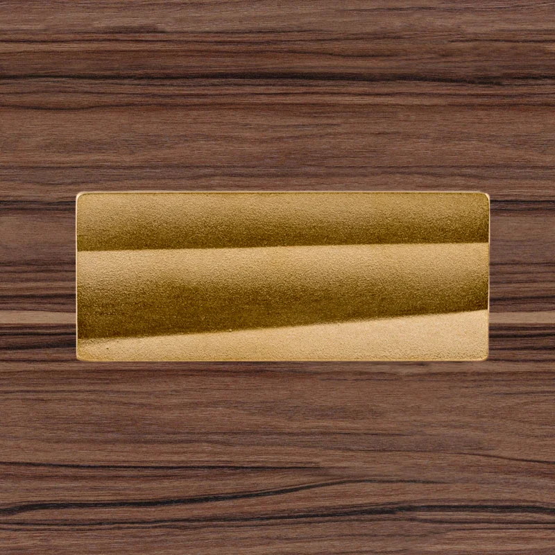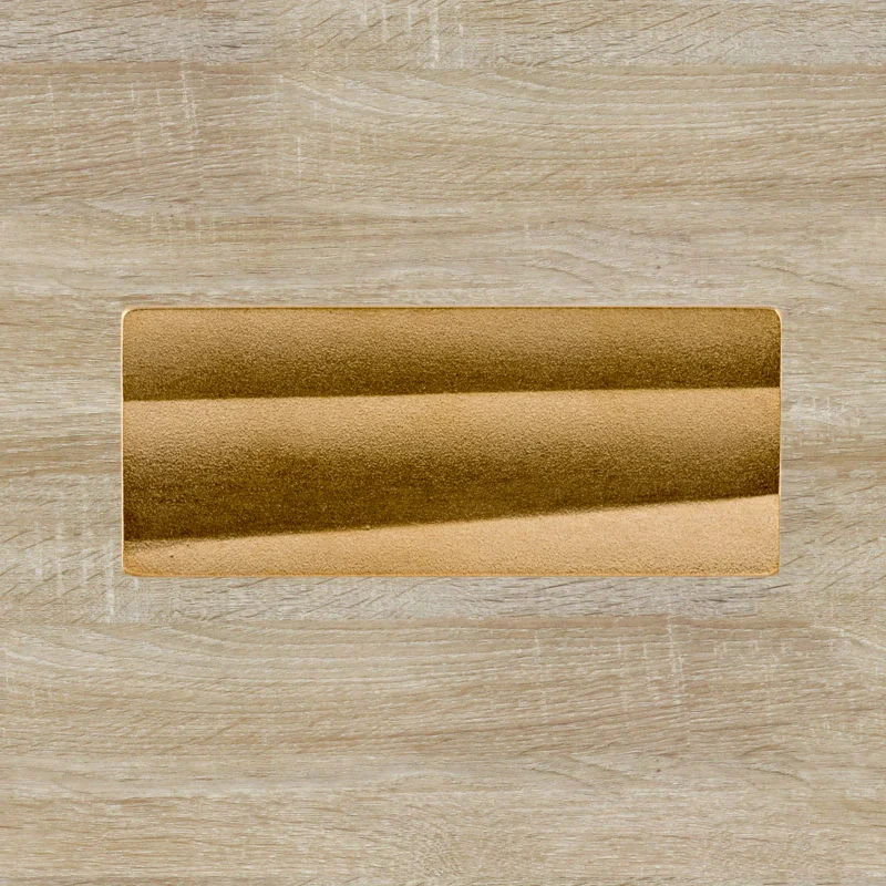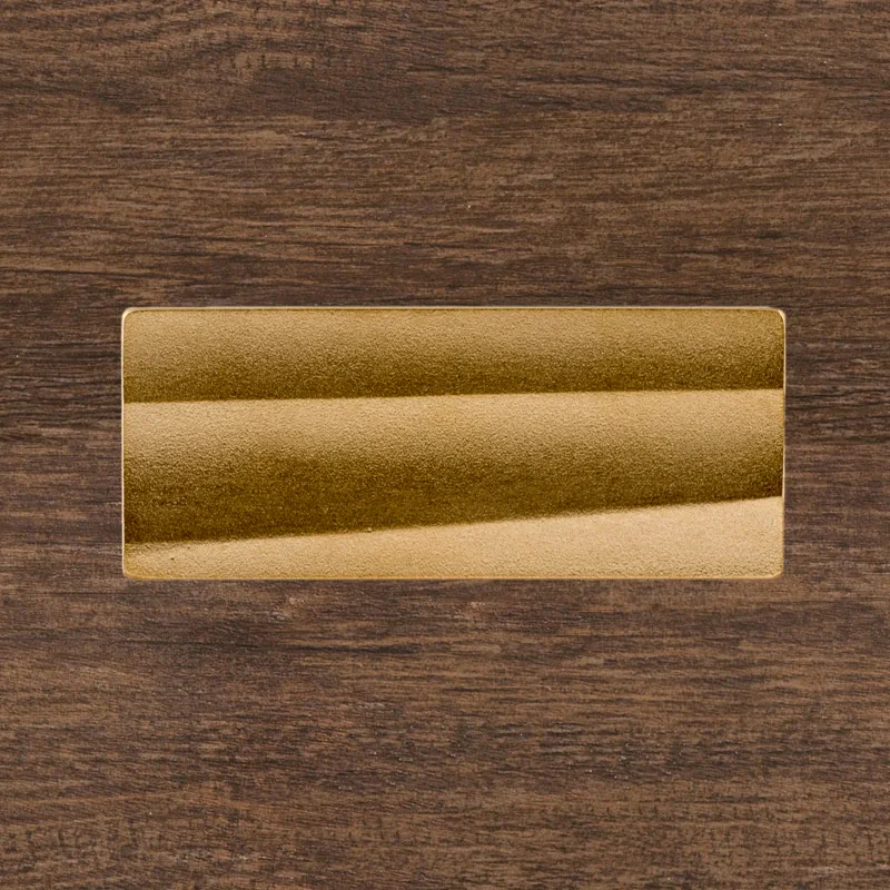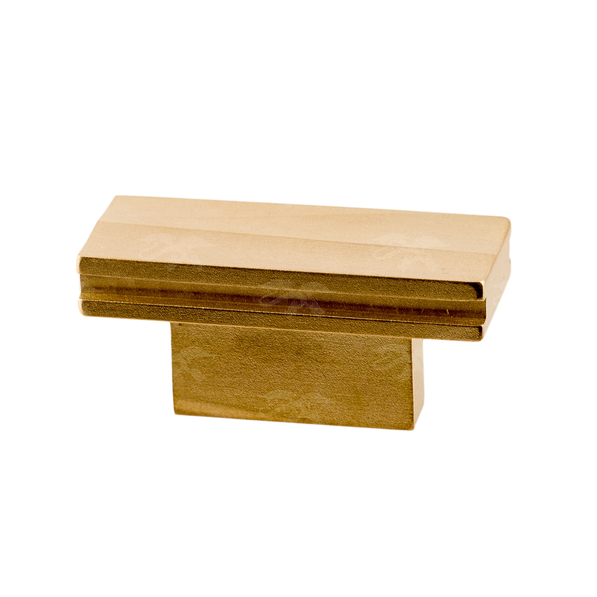 Ручка-кнопка с первого взгляда кажется совсем простой и лаконичной. Но стоит приглядеться к ней повнимательнее. Форма у изделия прямоугольная, но верхнюю часть мастера не стали делать гладкой. Ее украсили тремя широкими и чуть вдавленными в металл полосками. При индивидуальном заказе можно изменить рисунок на поверхности ручки, сделать ее крупнее или мельче.