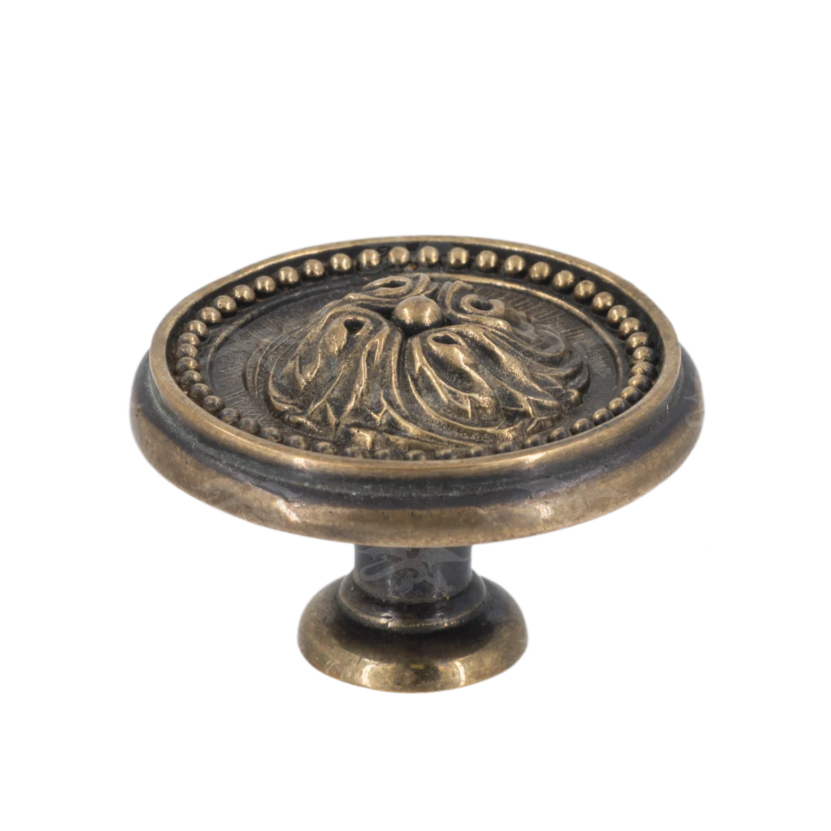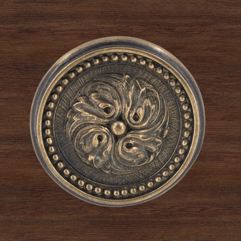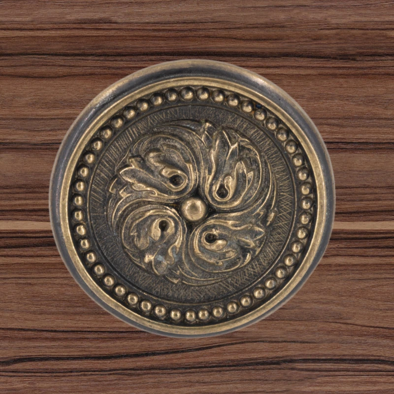 Эта мебельная ручка изготовлена по эксклюзивному проекту. Материалом для производства послужила бронза. При создании фурнитуры мастера применяли эффект слегка потертой поверхности. Этот прием позволил подчеркнуть принадлежность изделия к ретро-стилю. Каждая деталь фурнитуры проработана с особой тщательностью. Магазин мебельных ручек «Калежа» предлагает приобрести изделия с удобным захватом. Работа может быть снабжена дополнительными декоративными элементами. Любая фурнитура, заказанная в мастерской «Калежа», отличается надежностью и долговечностью.