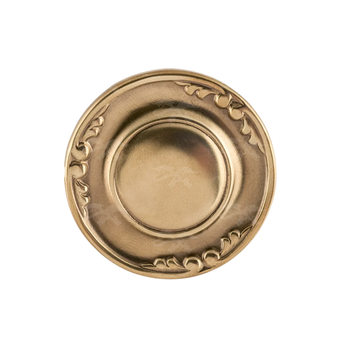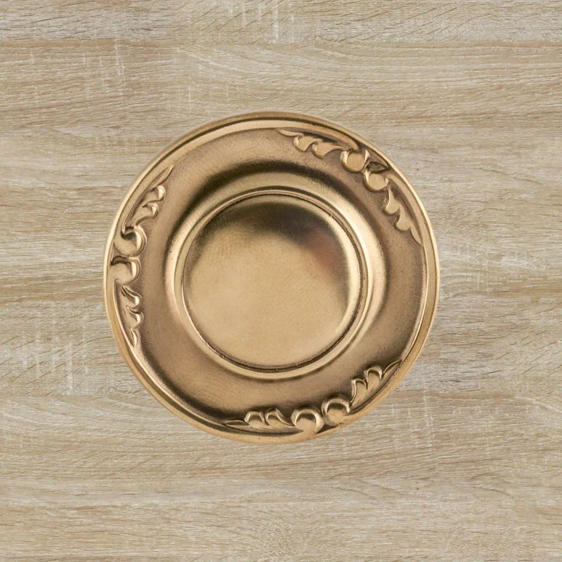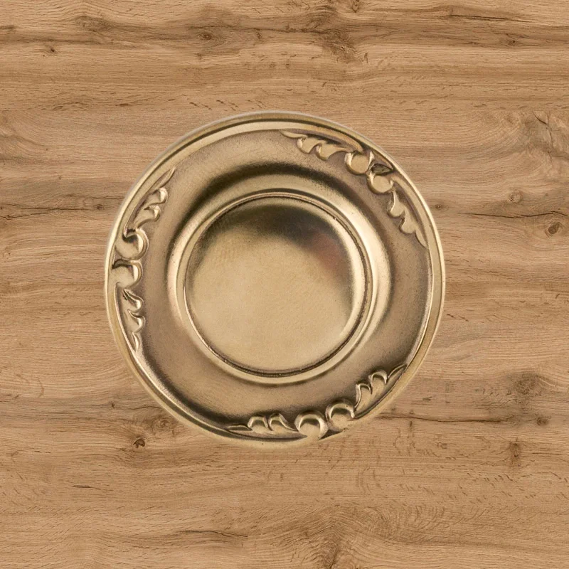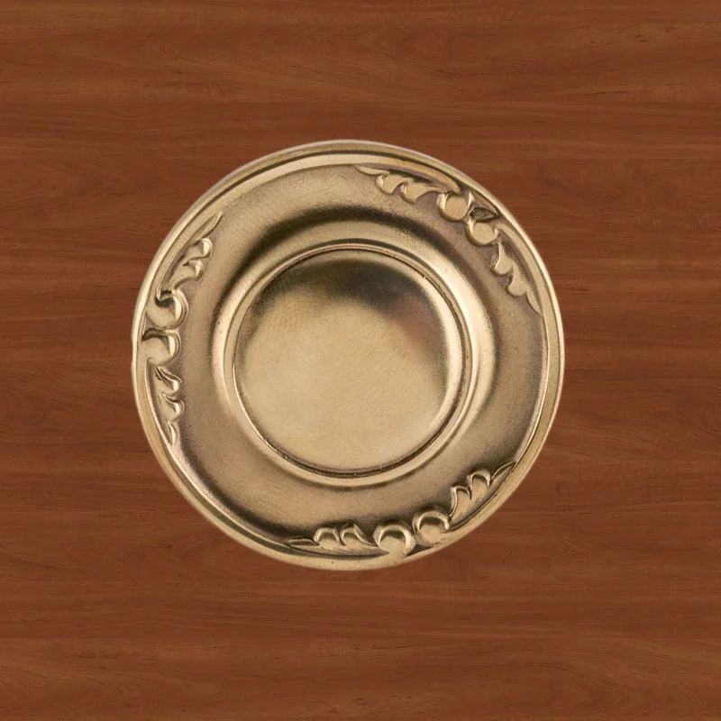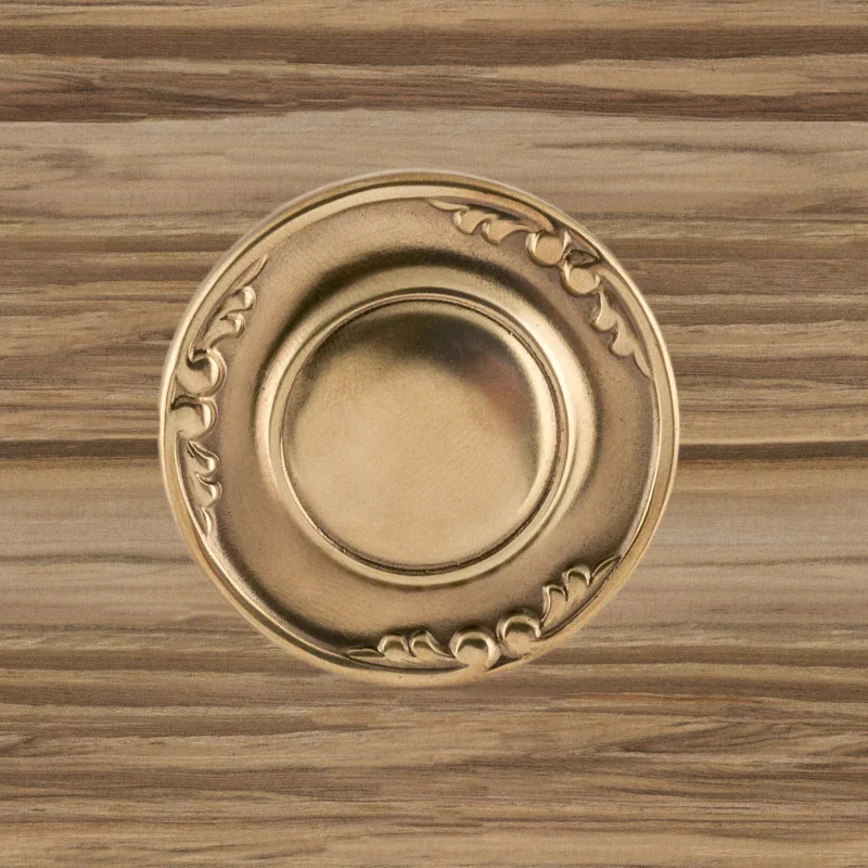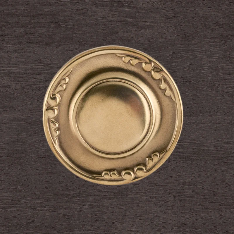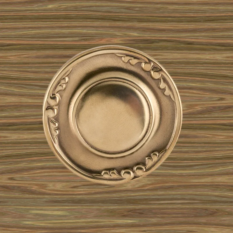 Мебельная фурнитура гармонично дополняет уникальное оформление интерьеров. Ручка-кнопка, снабженная цветочным рисунком, изготовлена с помощью бронзового литья из латуни. Чтобы обработать поверхность и создать эффект старинной мебели, мы используем полирование, чернение, золочение, бронзирование, никелирование. Выполнение интерьерных аксессуаров по данному образцу в мастерской «Калежа» занимает три недели.