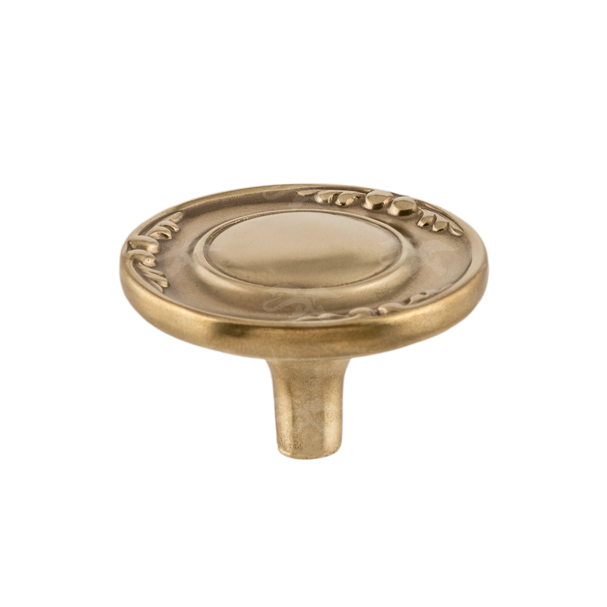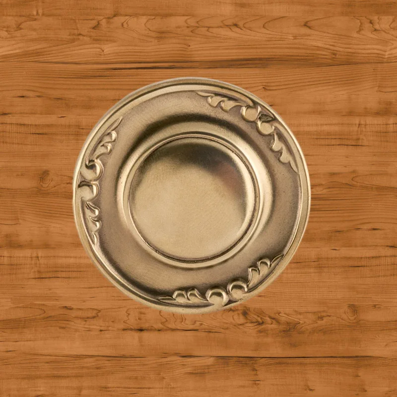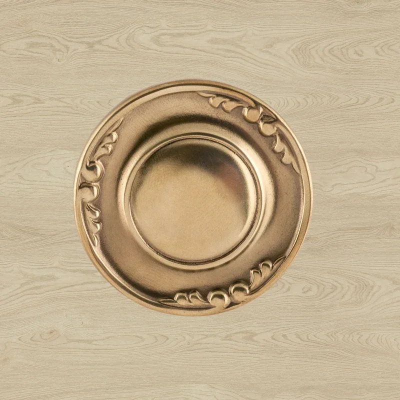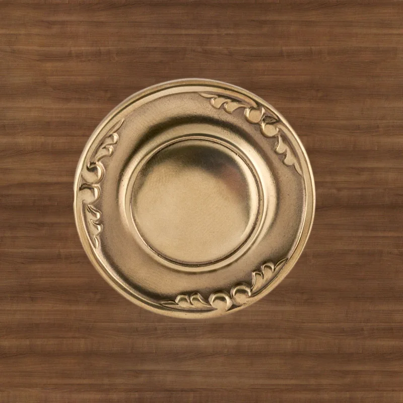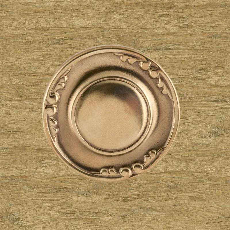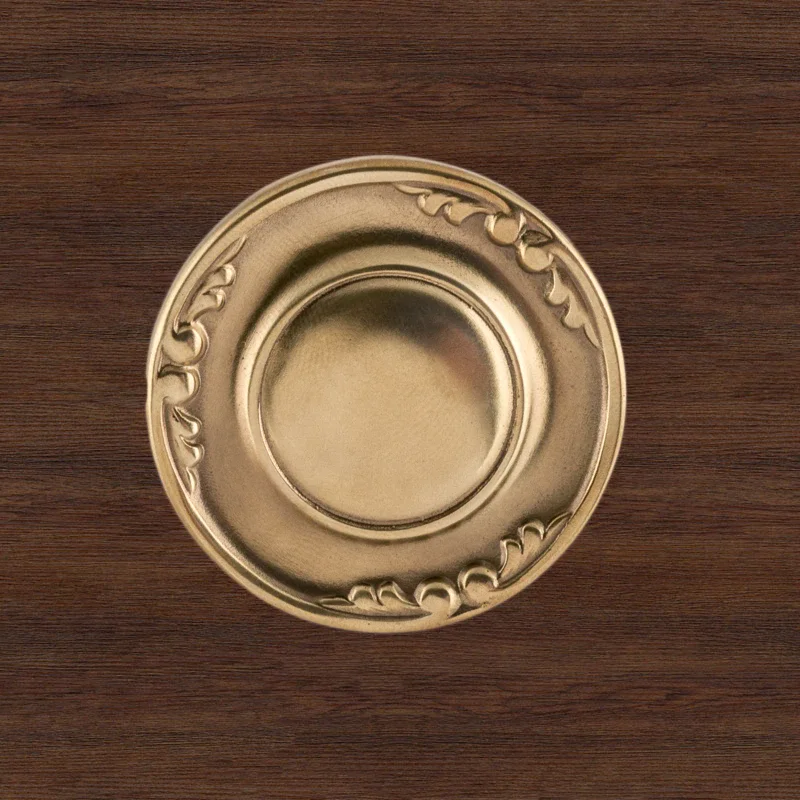 Мебельная фурнитура гармонично дополняет уникальное оформление интерьеров. Ручка-кнопка, снабженная цветочным рисунком, изготовлена с помощью бронзового литья из латуни. Чтобы обработать поверхность и создать эффект старинной мебели, мы используем полирование, чернение, золочение, бронзирование, никелирование. Выполнение интерьерных аксессуаров по данному образцу в мастерской «Калежа» занимает три недели.