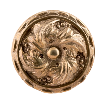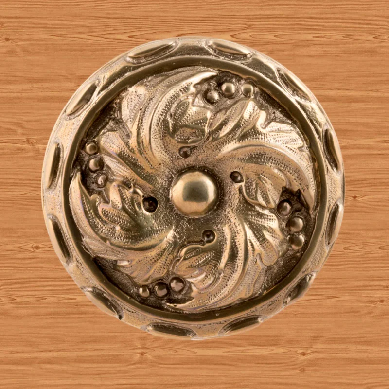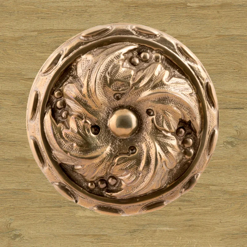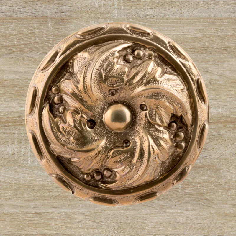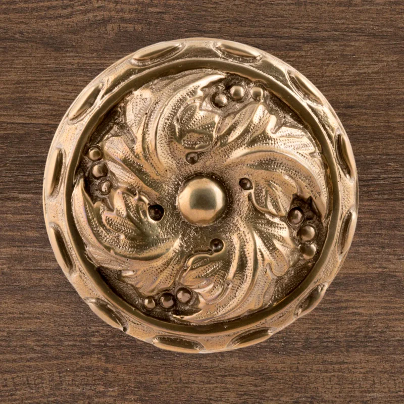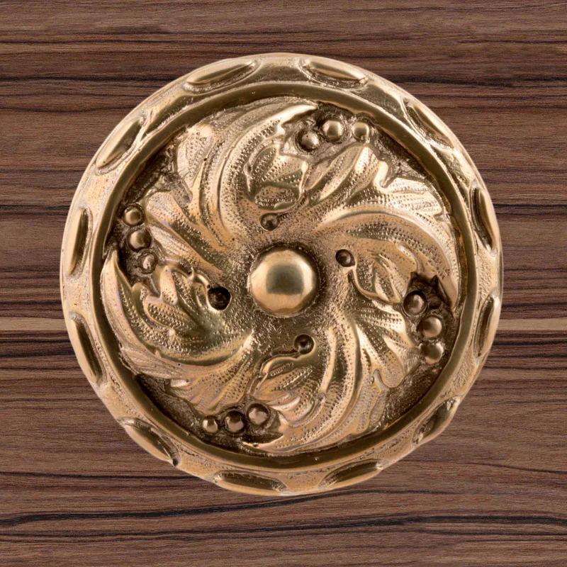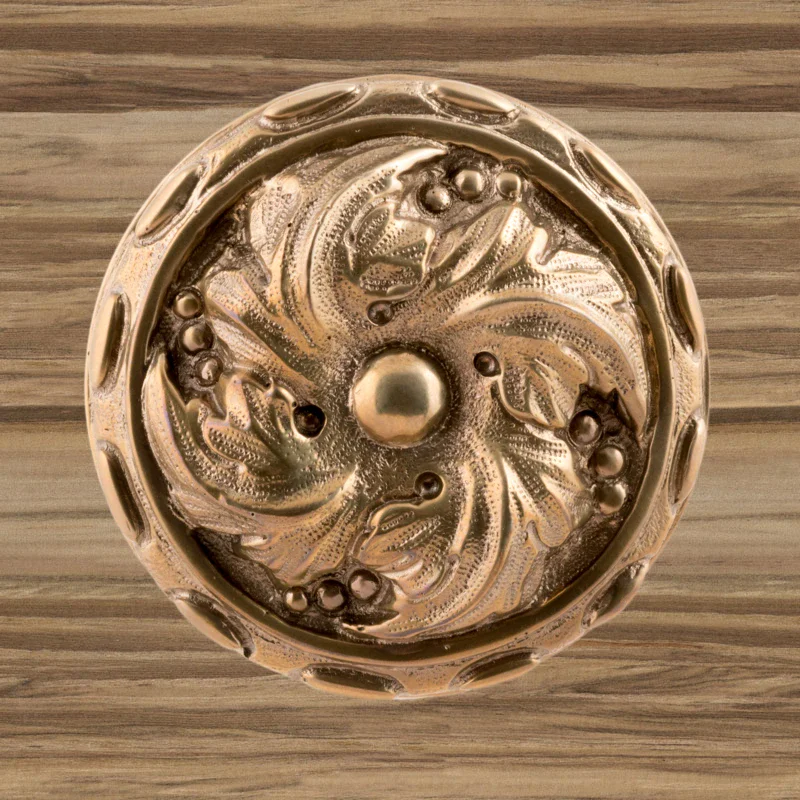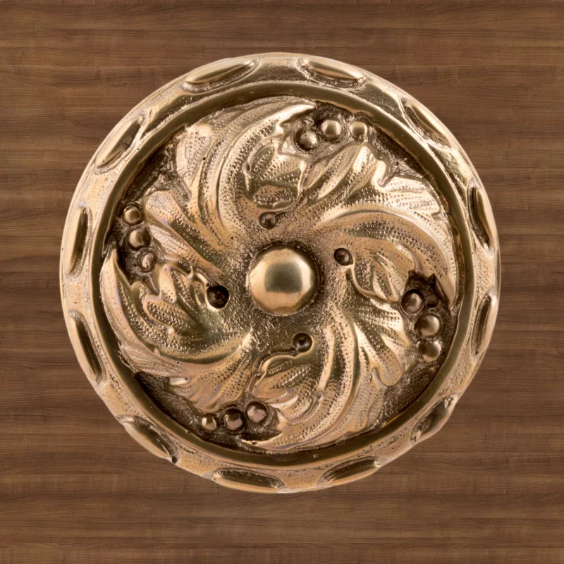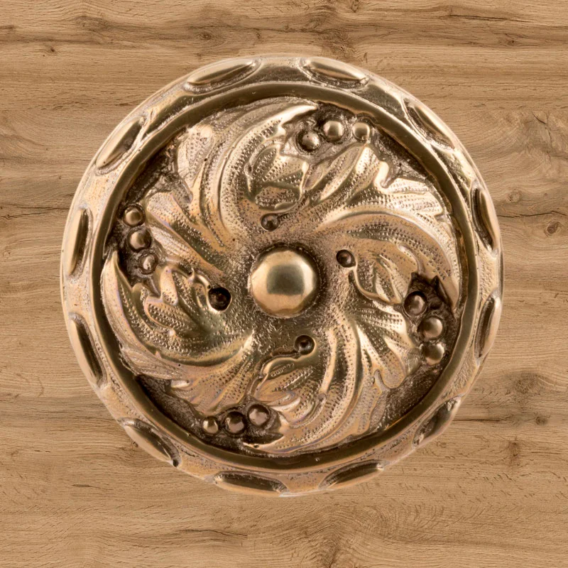 Ручка-кнопка — изящный образец мебельной фурнитуры от мастерской «Калежа». Сочетает простую эргономичную форму с богатством декора и отделки. Круглая ручка не имеет углов и других острых деталей, которые могут неприятно впиваться в ладонь. С ее помощью удобно открывать тяжелые двери в комнаты и выдвигать легкие ящики кухонных шкафов. А поверхность в виде стилизованного изображения цветка делает эту фурнитуру главным украшением интерьера.