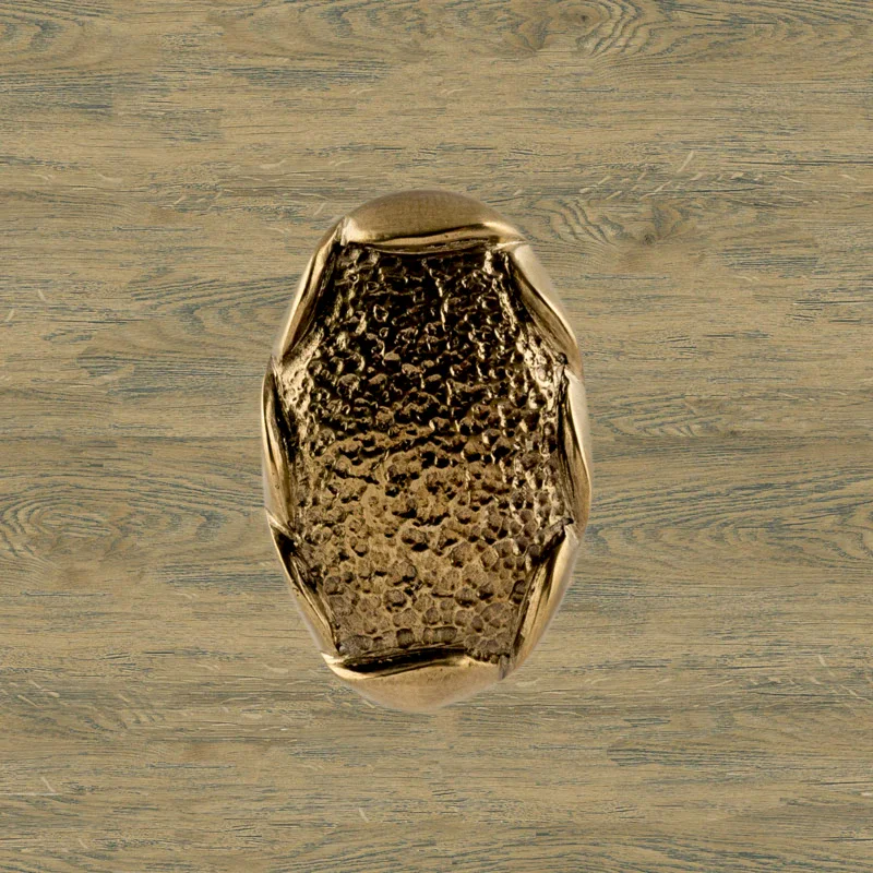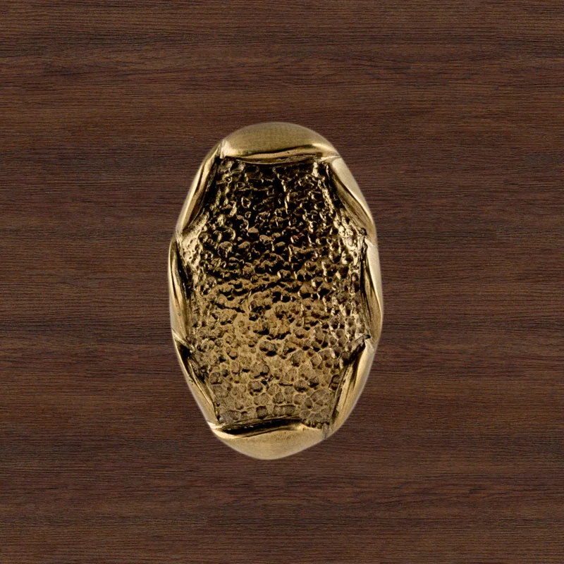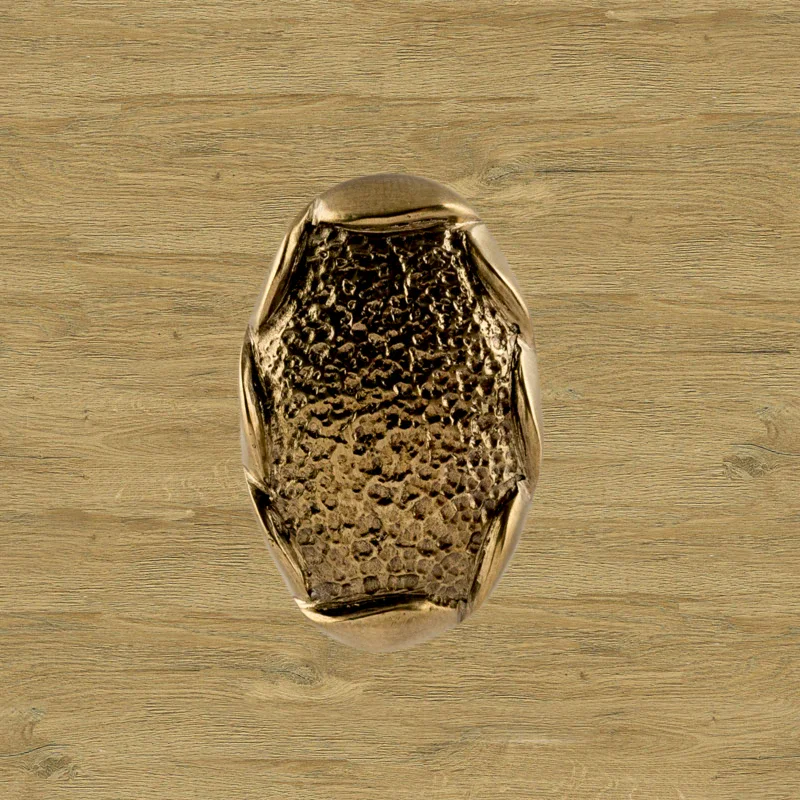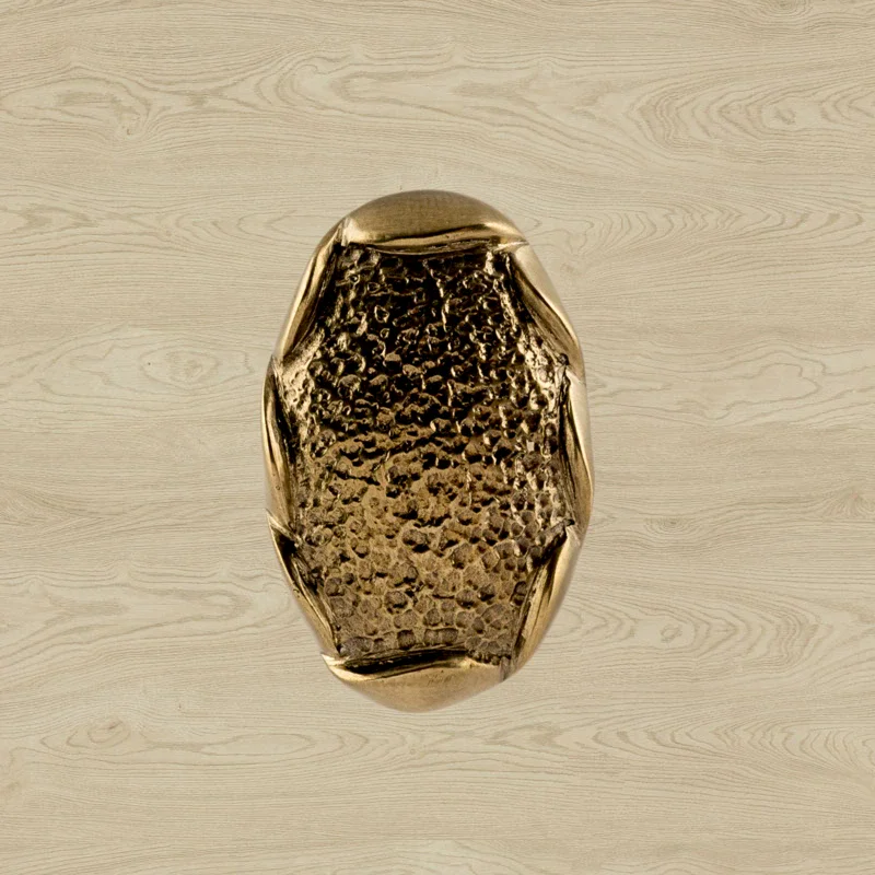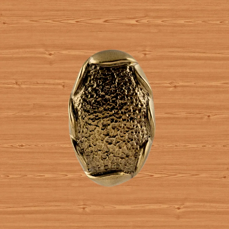 В мастерской «Калежа» доступна для заказа мебельная фурнитура из латуни с необычным оформлением. Уникальная ручка-кнопка простой формы выполнена по технологии бронзового литья. Такие детали можно устанавливать на ящиках столов или шкафов, чтобы открывать их быстрее. Изготовление латунных элементов для мебели занимает около трех недель.