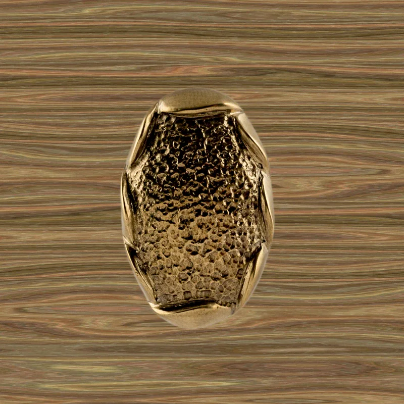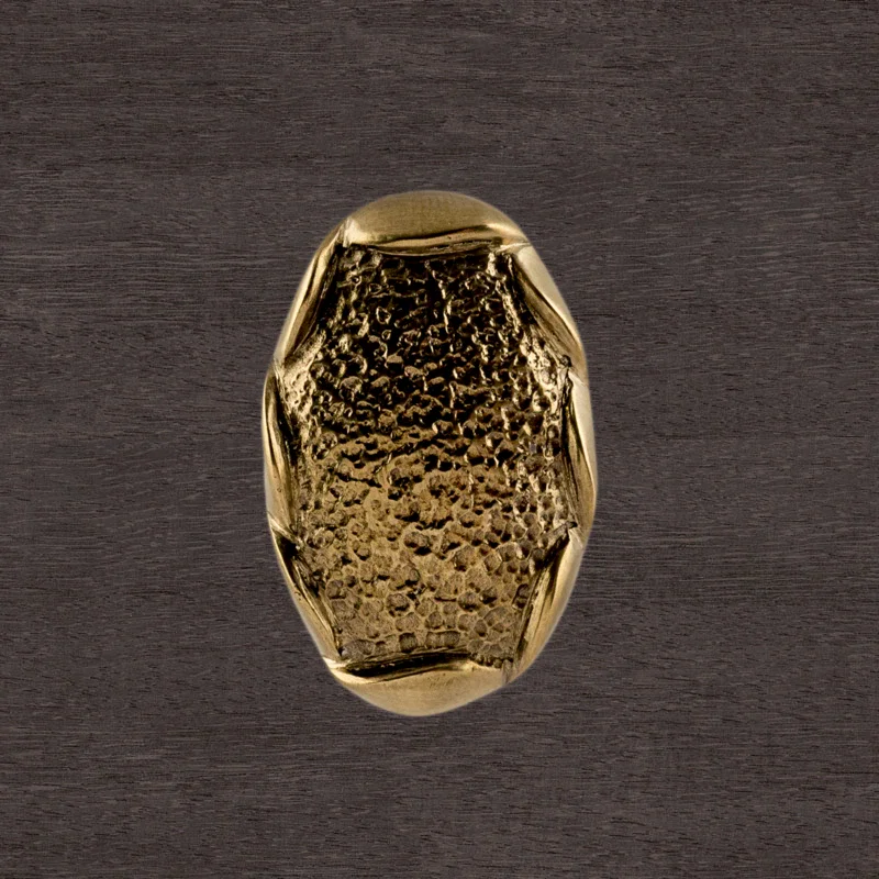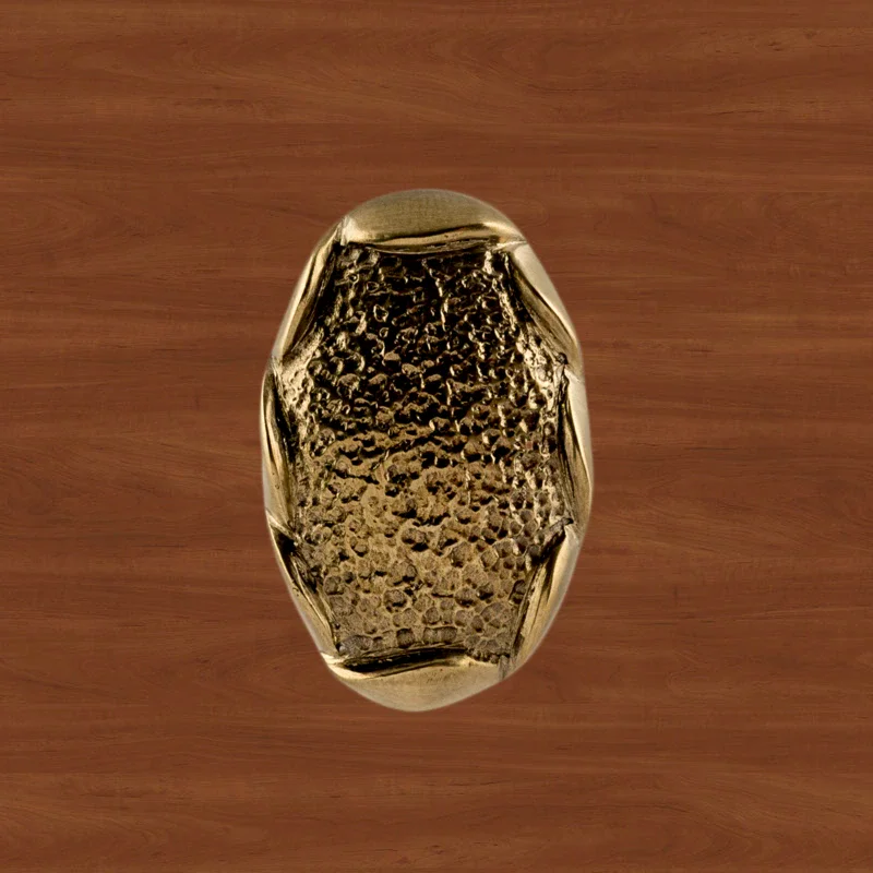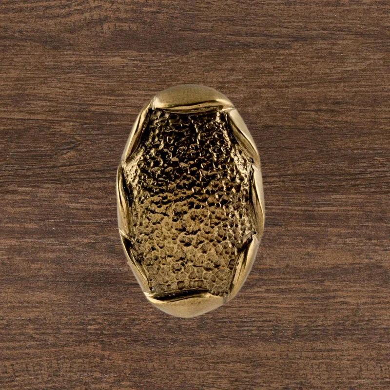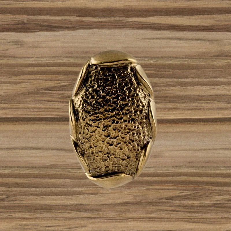 В мастерской «Калежа» доступна для заказа мебельная фурнитура из латуни с необычным оформлением. Уникальная ручка-кнопка простой формы выполнена по технологии бронзового литья. Такие детали можно устанавливать на ящиках столов или шкафов, чтобы открывать их быстрее. Изготовление латунных элементов для мебели занимает около трех недель.