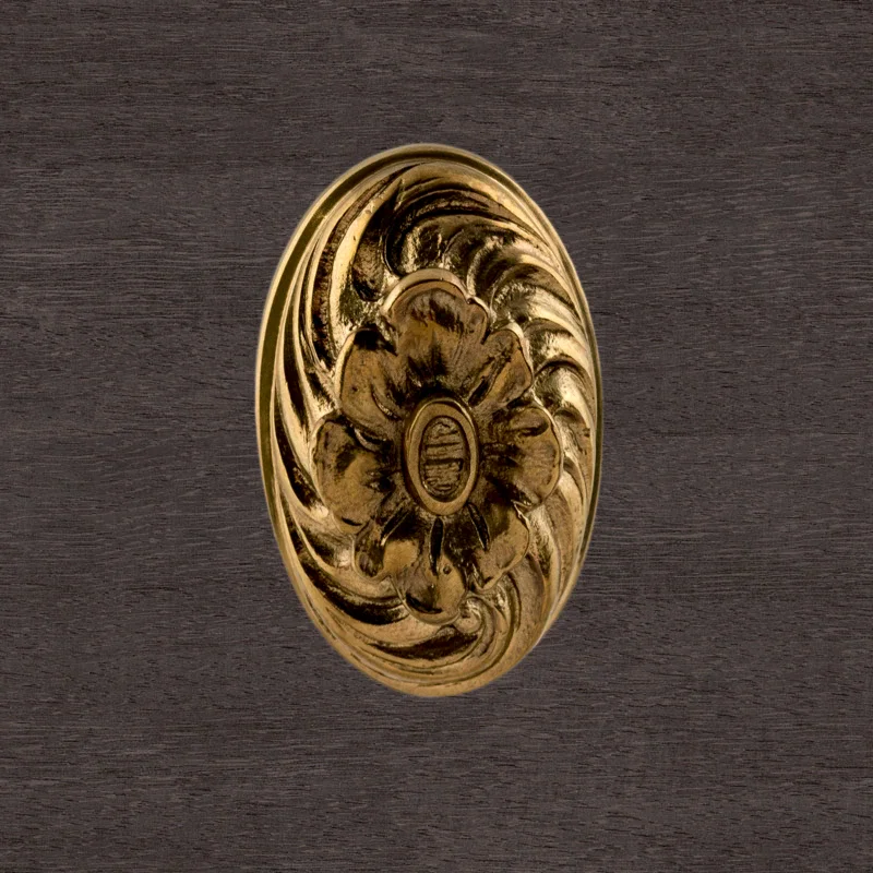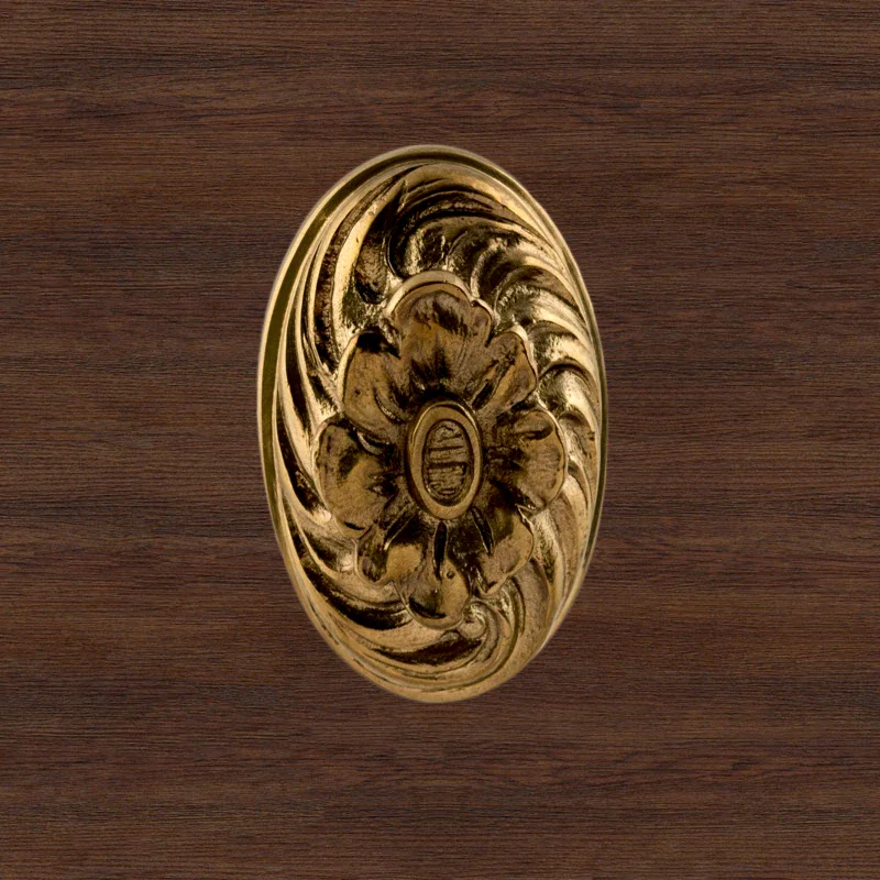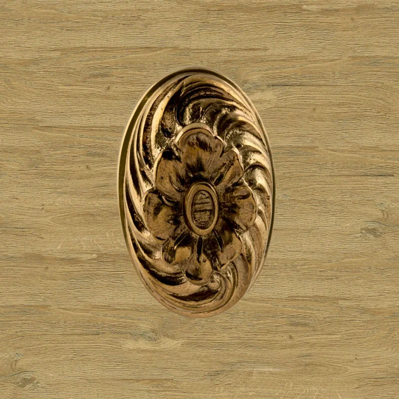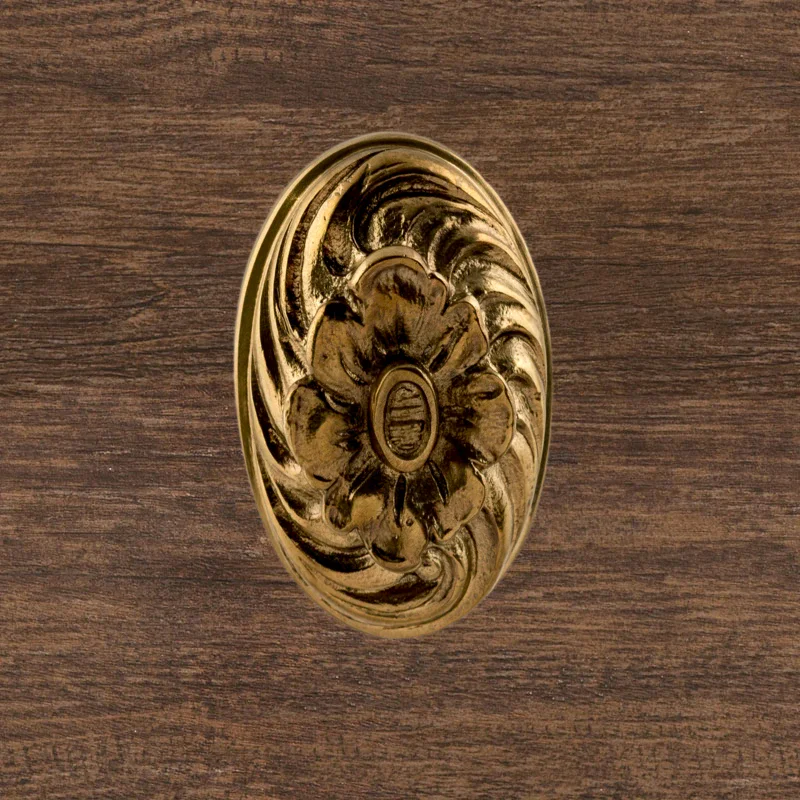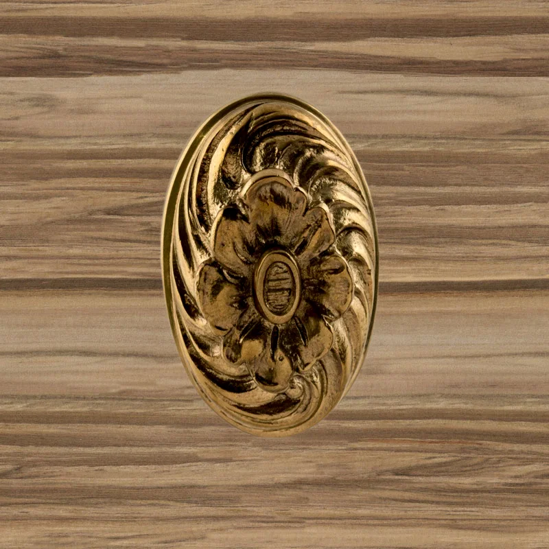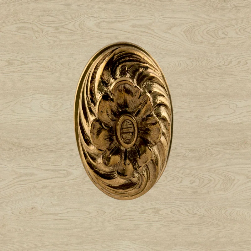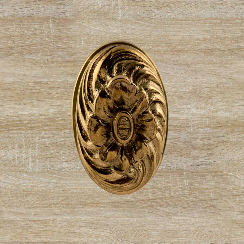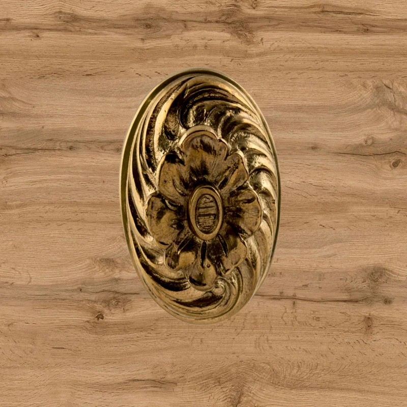 Мастерская «Калежа» предлагает мебельную фурнитуру. Ручка-кнопка выполнена из латуни. С ее помощью можно предотвратить движение дверцы, которая надежно удерживается на месте. Перед мастерами стояла задача создать рисунок сложной формы и обеспечить удобный захват, поэтому основной технологией производства стало бронзовое литье. На изготовление подобных интерьерных аксессуаров уходит три недели.