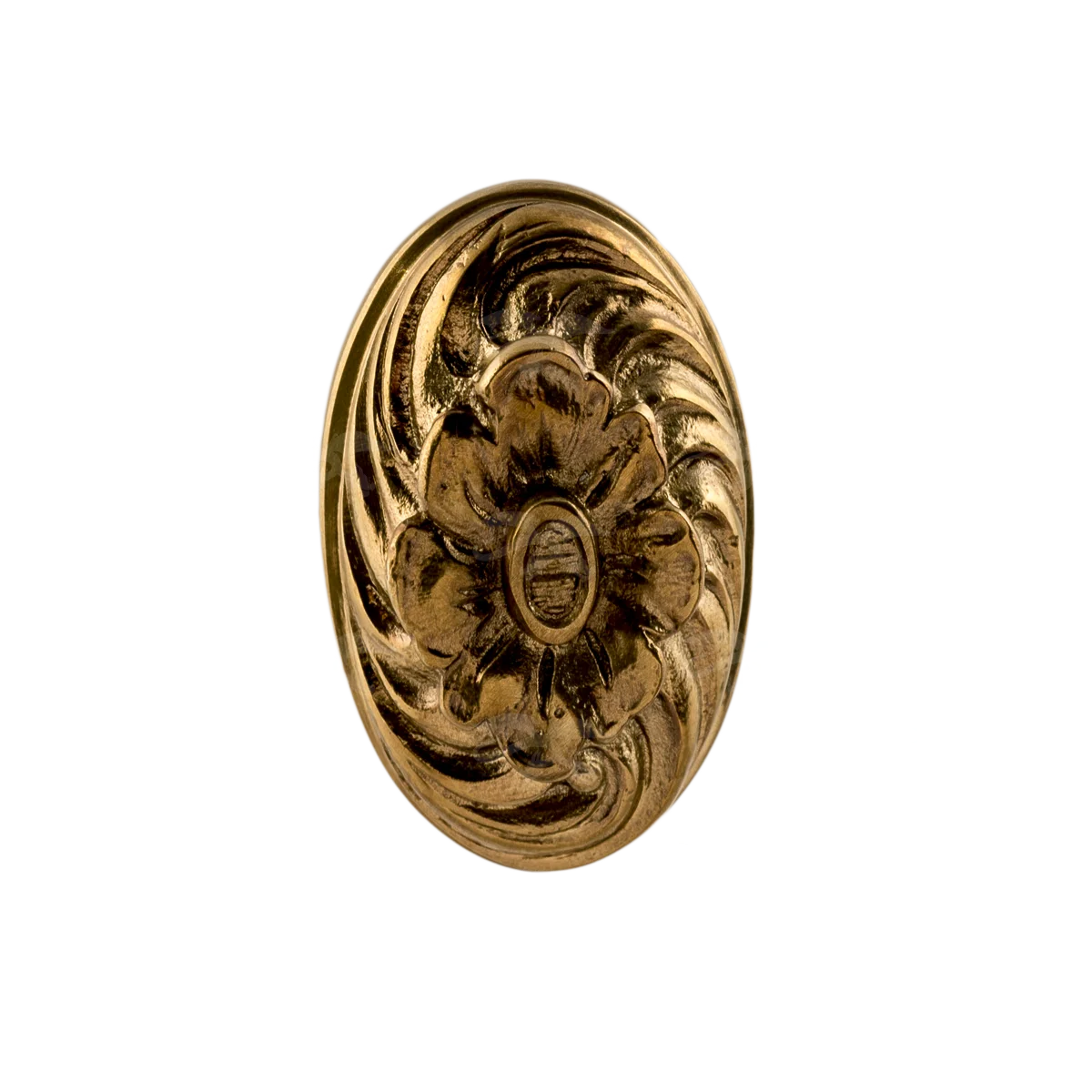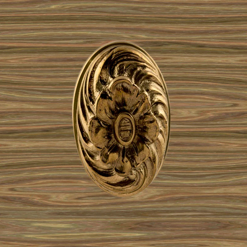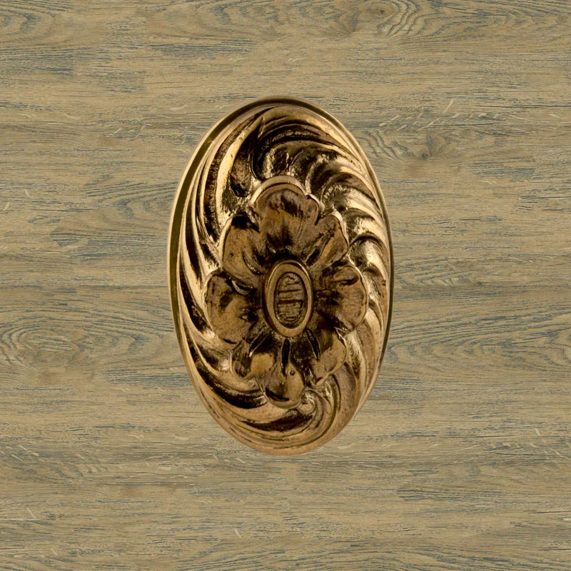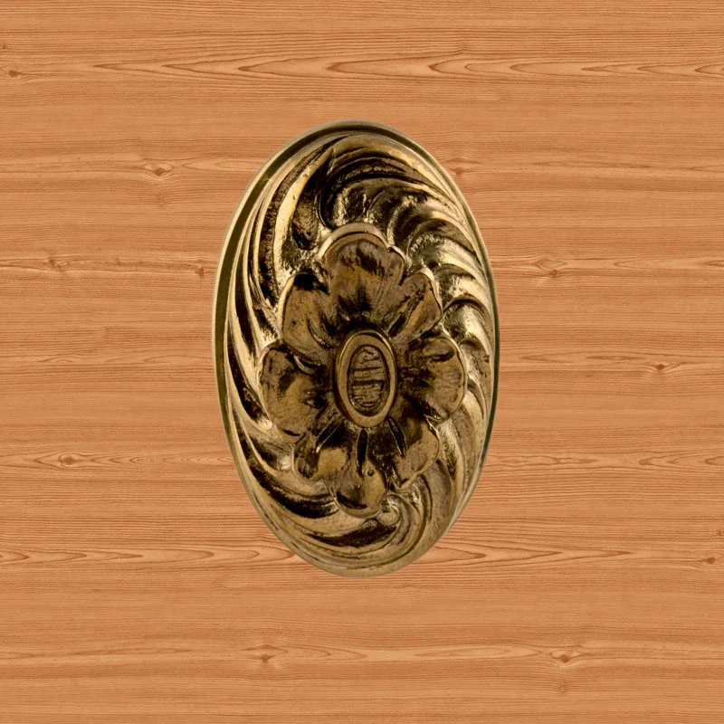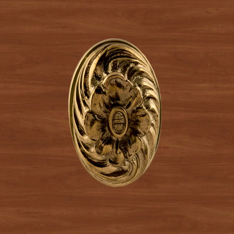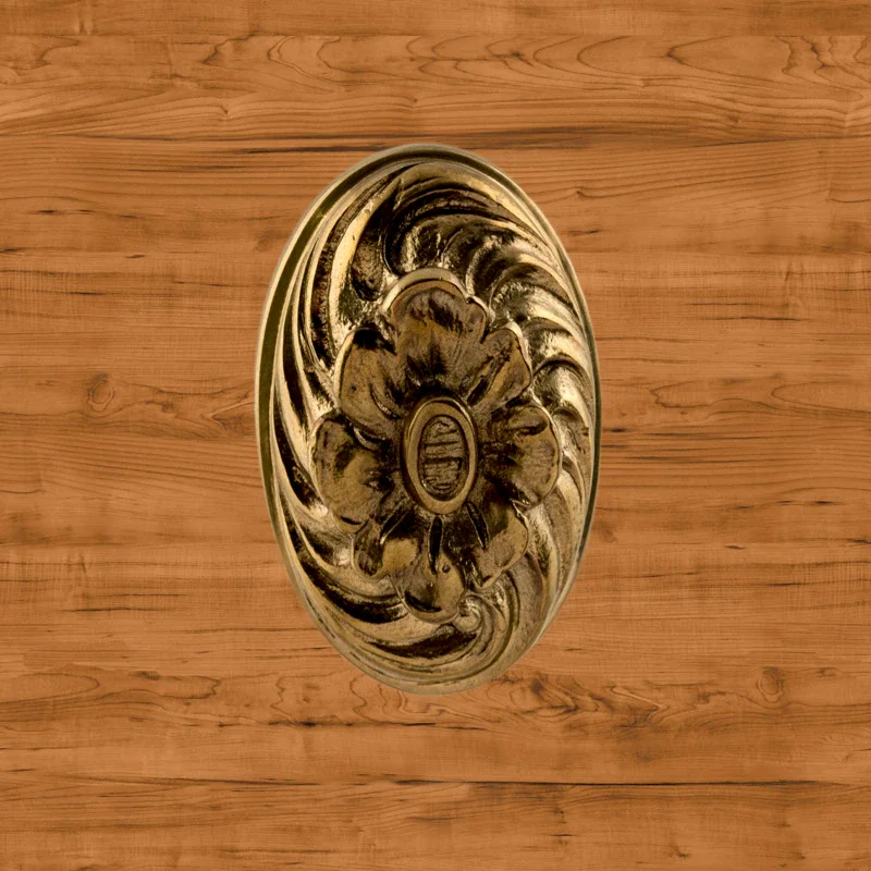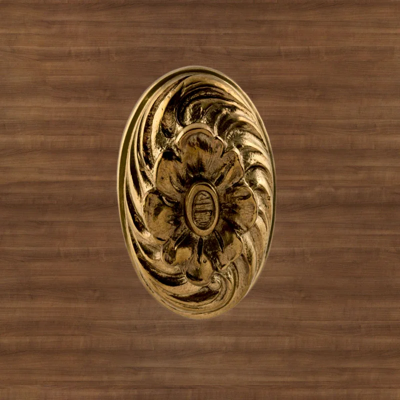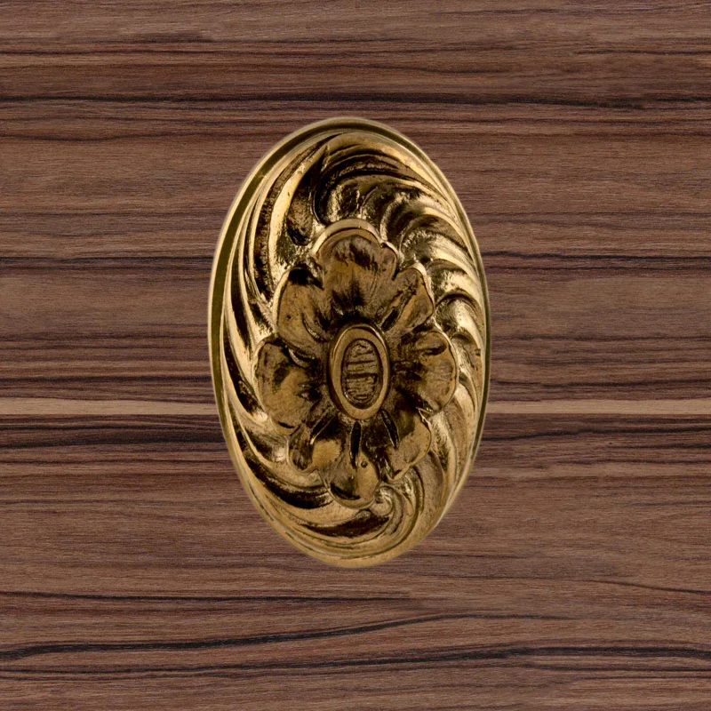 Мастерская «Калежа» предлагает мебельную фурнитуру. Ручка-кнопка выполнена из латуни. С ее помощью можно предотвратить движение дверцы, которая надежно удерживается на месте. Перед мастерами стояла задача создать рисунок сложной формы и обеспечить удобный захват, поэтому основной технологией производства стало бронзовое литье. На изготовление подобных интерьерных аксессуаров уходит три недели.